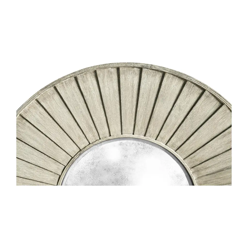 Crafted from layers of washed acacia wood, its circular frame echoes the grandeur of an airplane engine, making it a bold yet sophisticated statement piece. The natural wood grain and artisanal layering create depth and texture, bringing warmth and character to any space. Ideal for both rustic barns and modern coastal retreats, this mirror enhances interiors with its commanding presence. Whether placed above a mantel, in an entryway, or as a focal point in a living area, its transitional design complements a variety of aesthetics. The large mirror is more than a reflection—it is a work of art that transforms your space with effortless style. Dimensions: 60.66" W x 3.66" D x 60.66" H