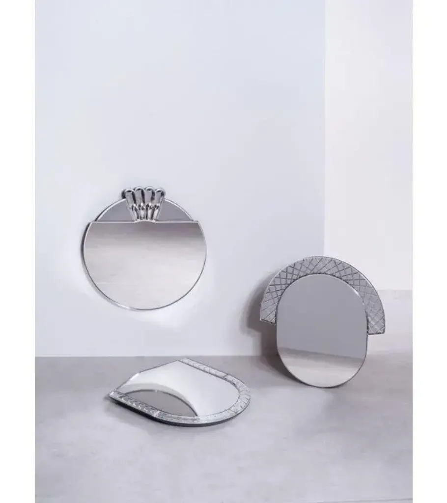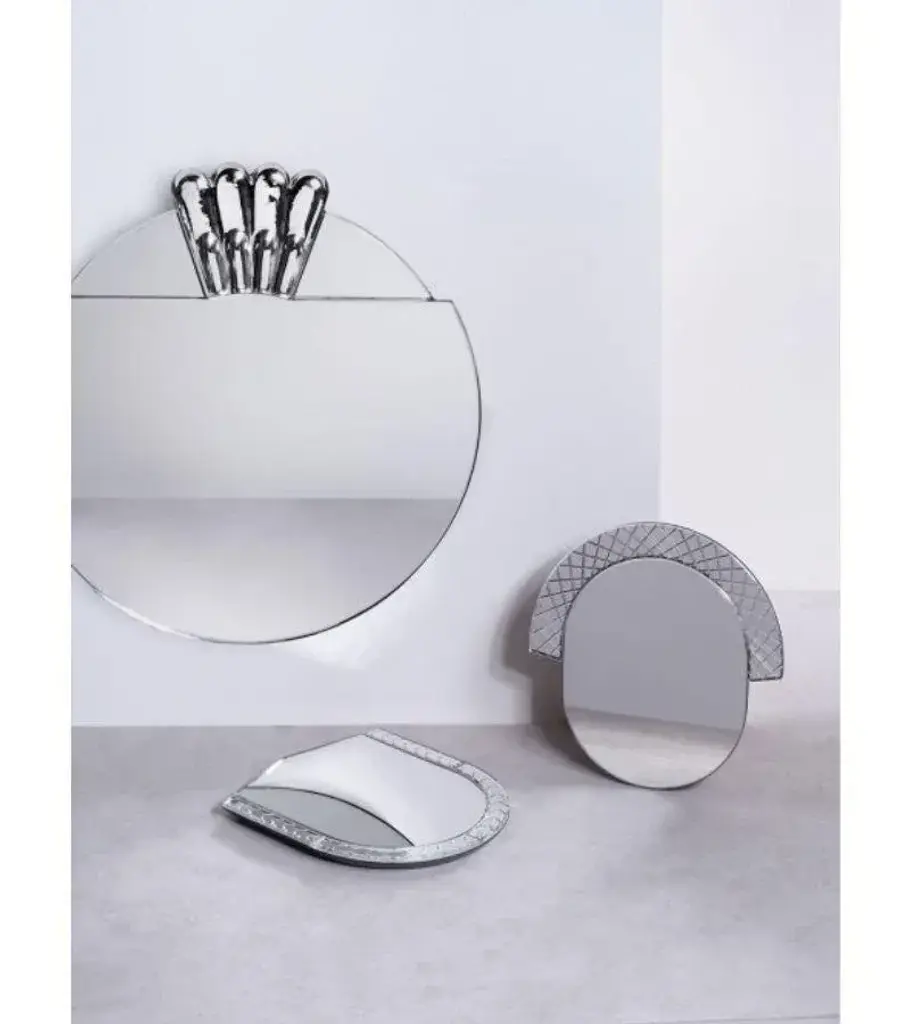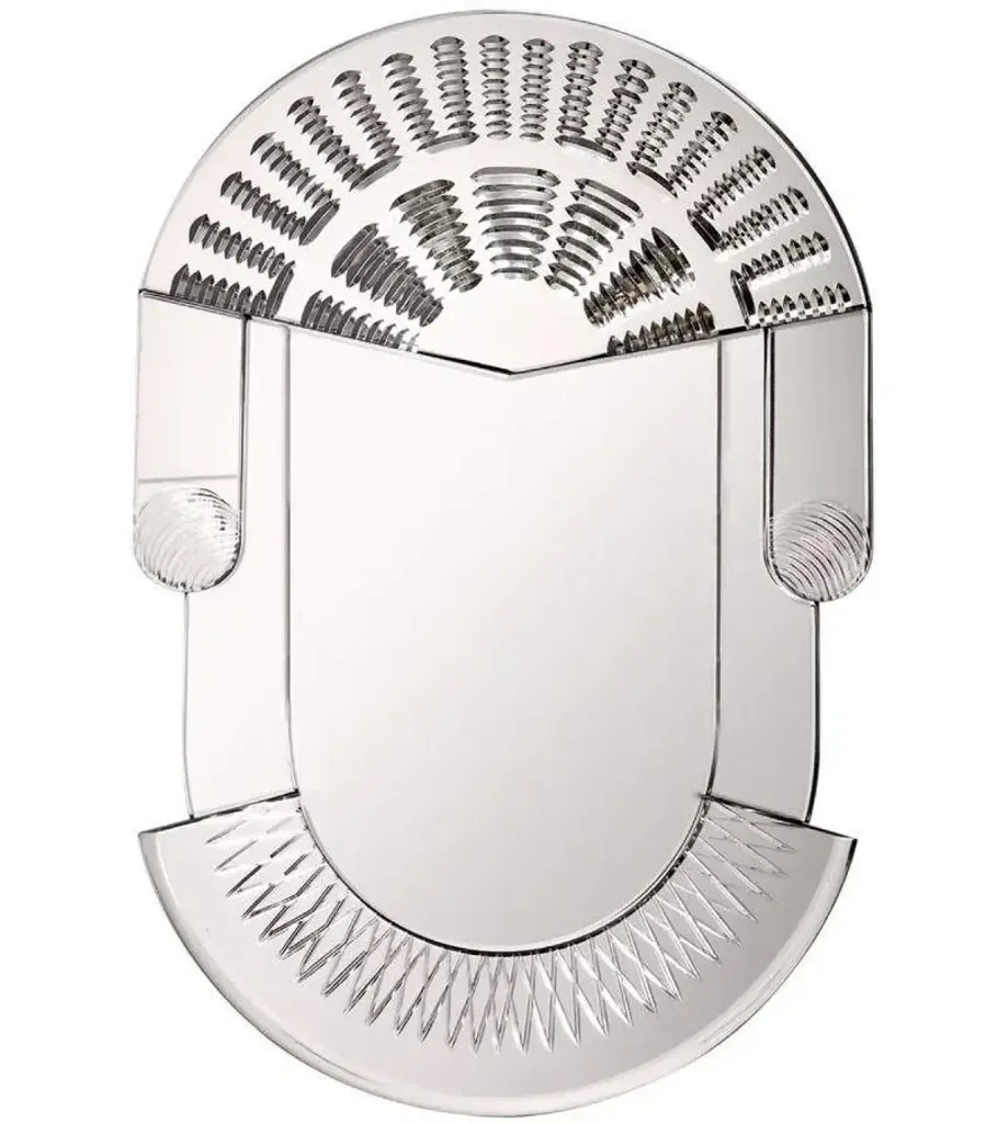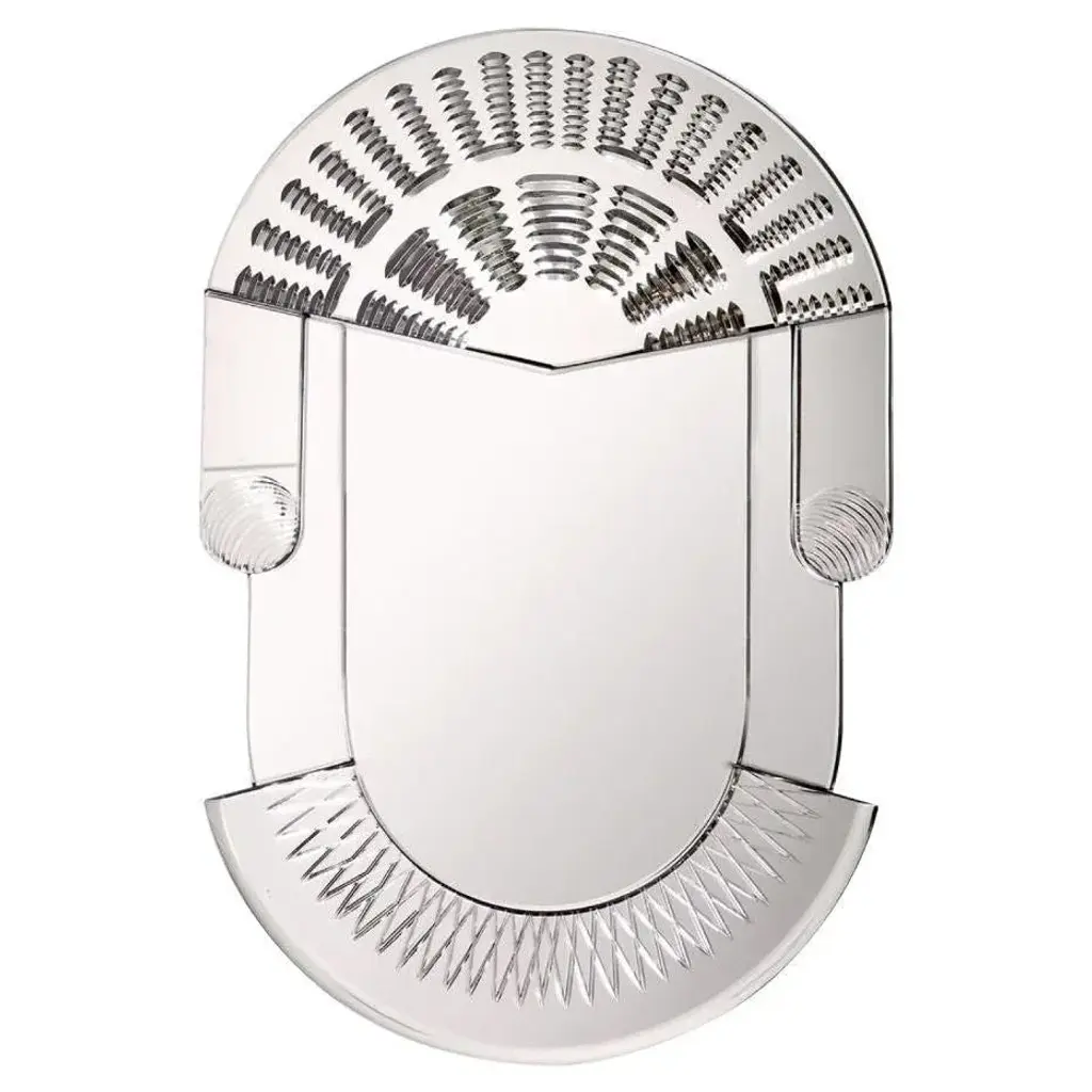 Large scena olympic murano mirror by nikolai kotlarczyk. Dimensions: d 3 x w 60 x h 90 cm. Materials: silvered carved glass, golden carved polished steel. Nembro marble (base) also available in other sizes and designs. Scena is a series of solid glass mirrors full of depth and bold graphic lines, expertly crafted by hand in murano. A central inspiration was the forms and spatial designs of the architect andrea palladio, and his constant focus on the vista within his work. Working with the skilled glass artists of murano, subtle use of perspective and depth was created by the intricate carving and grinding of the mirrored glass surfaces, then silvered to give depth to the details /scè-na/ from the framing of the landscapes surrounding la rotonda, to the influence of the renaissance painters in the illusionary set design for the teatro olimpico, the palladio's architecture constantly played with our own perception of space. this piece is attributed to the mentioned designer/maker. It has no attribution mark and no official proof of authenticity, however it is well documented in design history. I take full responsibility for any authenticity issues arising from misattribution
