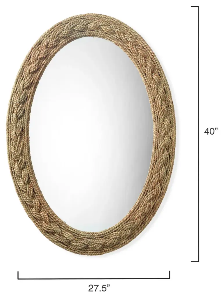 Add natural texture and an instant coastal flair to any room in your home. Hand-wrapped in natural seagrass this mirror also features versatility of hanging vertically or horizontally. Mounted above a vanity, sideboard or dresser, its oval shape will soften any room while reflecting light to make your space feel bigger. • Hand-woven of 100% Natural Seagrass• Non beveled glass mirror• Mirror can hang vertical or horizontal• Natural Tone Will Vary The inherent variations in tone and texture of natural Seagrass are preserved, to create pieces rich in detail and natural beauty. These unique imperfections give our products character and individuality, with each piece having its own personality. We''ve done our best to represent product as closely as possible; however, different lighting and settings in photography, phone or computer settings may slightly affect color and appearance. • Mirror Surface: 33"H x 21"W• D-Loop Hanging Mechanism• Frame: 3.75" W• MDF BackingCare Instructions: Wipe frame with a soft, dry cloth. Wipe glass with standard glass cleaner. DO NOT use cleaners or abrasives on mirror frame.