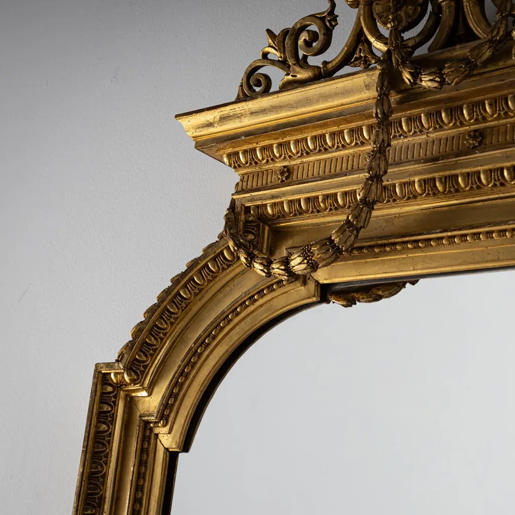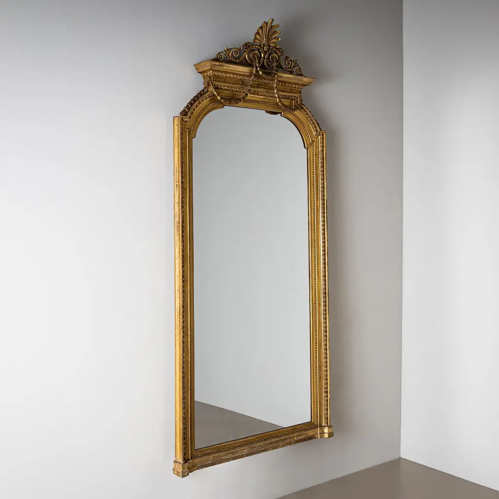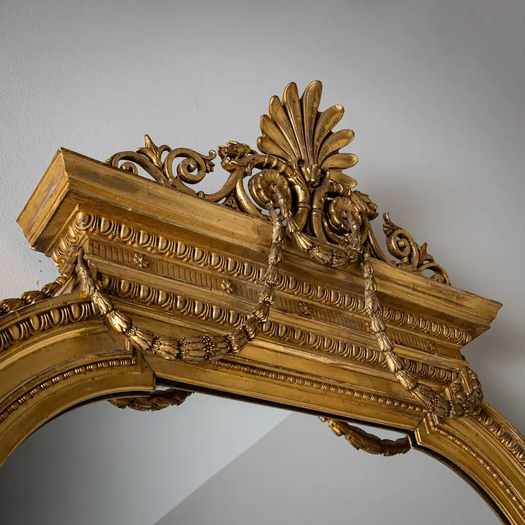 Large and ornate wall mirror from the second half of the 19th century, crafted in the Louis XVI style. The gilded frame features refined beading and bull’s-eye motifs, lending the piece a timeless elegance. The rounded pediment is crowned with an elaborate shell ornament, volutes, and draped festoons, creating a richly decorative focal point.