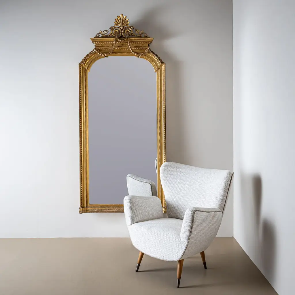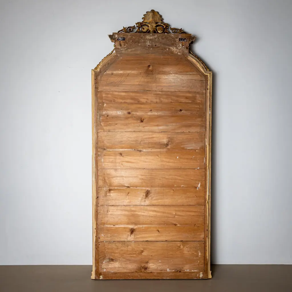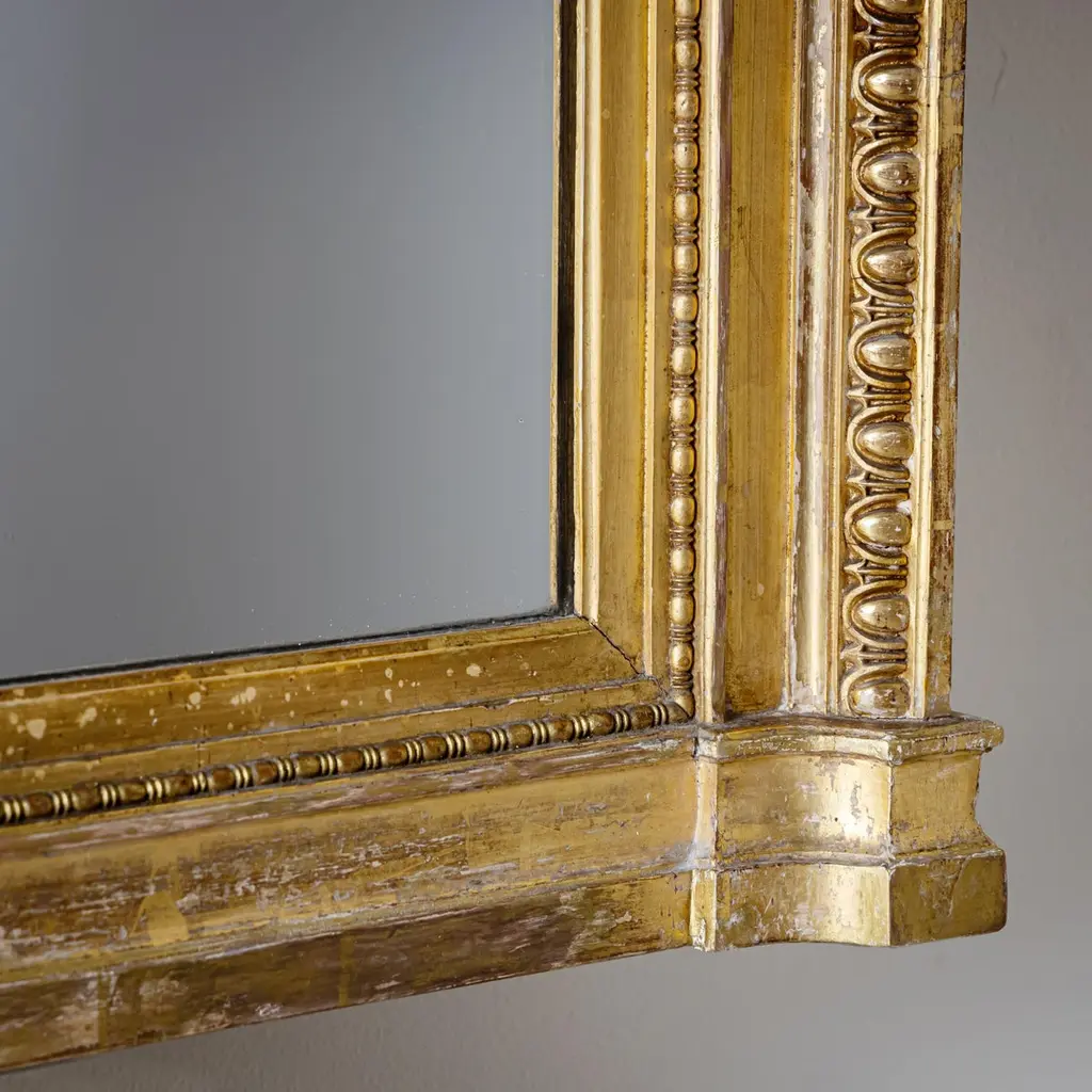 Large and ornate wall mirror from the second half of the 19th century, crafted in the Louis XVI style. The gilded frame features refined beading and bull’s-eye motifs, lending the piece a timeless elegance. The rounded pediment is crowned with an elaborate shell ornament, volutes, and draped festoons, creating a richly decorative focal point.