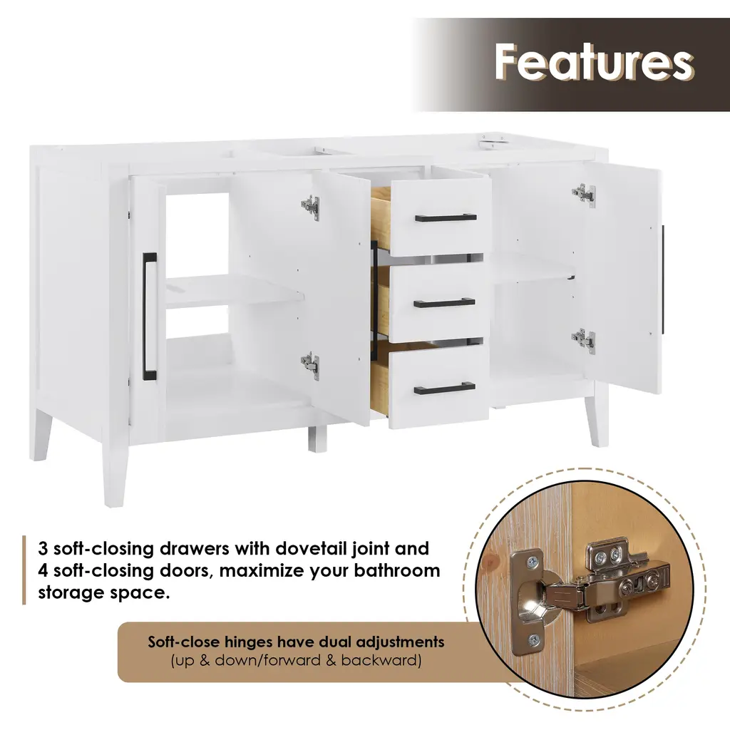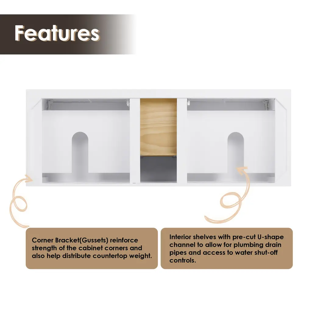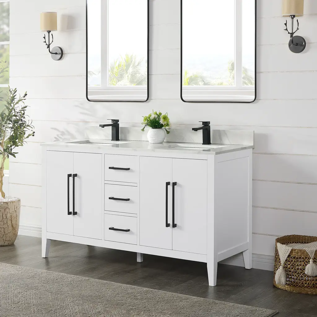 Looking to dial up the style in your guest or master bath? Sleek and streamlined in design, our Laurel vanity is a functional and elegant addition crafted with materials of the finest quality. Its unique blend of textures lends this piece a distinctive contemporary edge that enhances the overall aesthetic of any decor. Despite its minimalist look, our vanity doesn't skimp on storage. A roomy cabinet and drawers help keep your space organized and clutter-free, providing the perfect spot for all your grooming essentials.FeaturesCabinet comes in stunning Weathered Fir or White finish to enhance and complement your décor.Constructed of kiln-dried, solid fir wood and pine wood, ensuring supreme quality and sturdiness.Calacatta White Quartz countertop with backsplash is highly resilient, nonporous, and scratch- and stain-resistant to provide long-lasting beauty.Double, rectangular, undermount ceramic basin with overflow integrates with countertop for a seamless appearance.Countertop comes with pre-drilled single faucet hole for installation convenience.3 soft-closing drawers with dovetail joint and 4 soft-closing doors maximize your bathroom storage space. Flat, ultra-modern cabinet doors accentuate the contemporary design.Longer drawer handles with a Matte Black finish lend an industrial look. Handles and pulls are crafted from corrosion-resistant zinc alloy metal to keep them looking sleek and sharp for years to come.Hardware dimension: Drawer handle center to center -5.04" Door Handle center to center-11.34"Opening back fits any kind of plumbing.Countertop and backsplash are included but come separately, partial assembly is needed.Does not include faucet, mirror, back panel, drain assembly, sidesplash, or P-trap.Without MirrorDo keep the countertop as dry as possible.Do recommend to only use water to wash the artificial marble top(no mild dish soap, cleaner, detergent), and try the countertop by soft cloth as soon as possible.