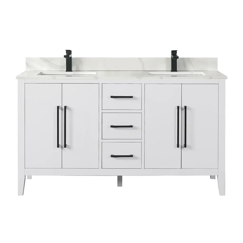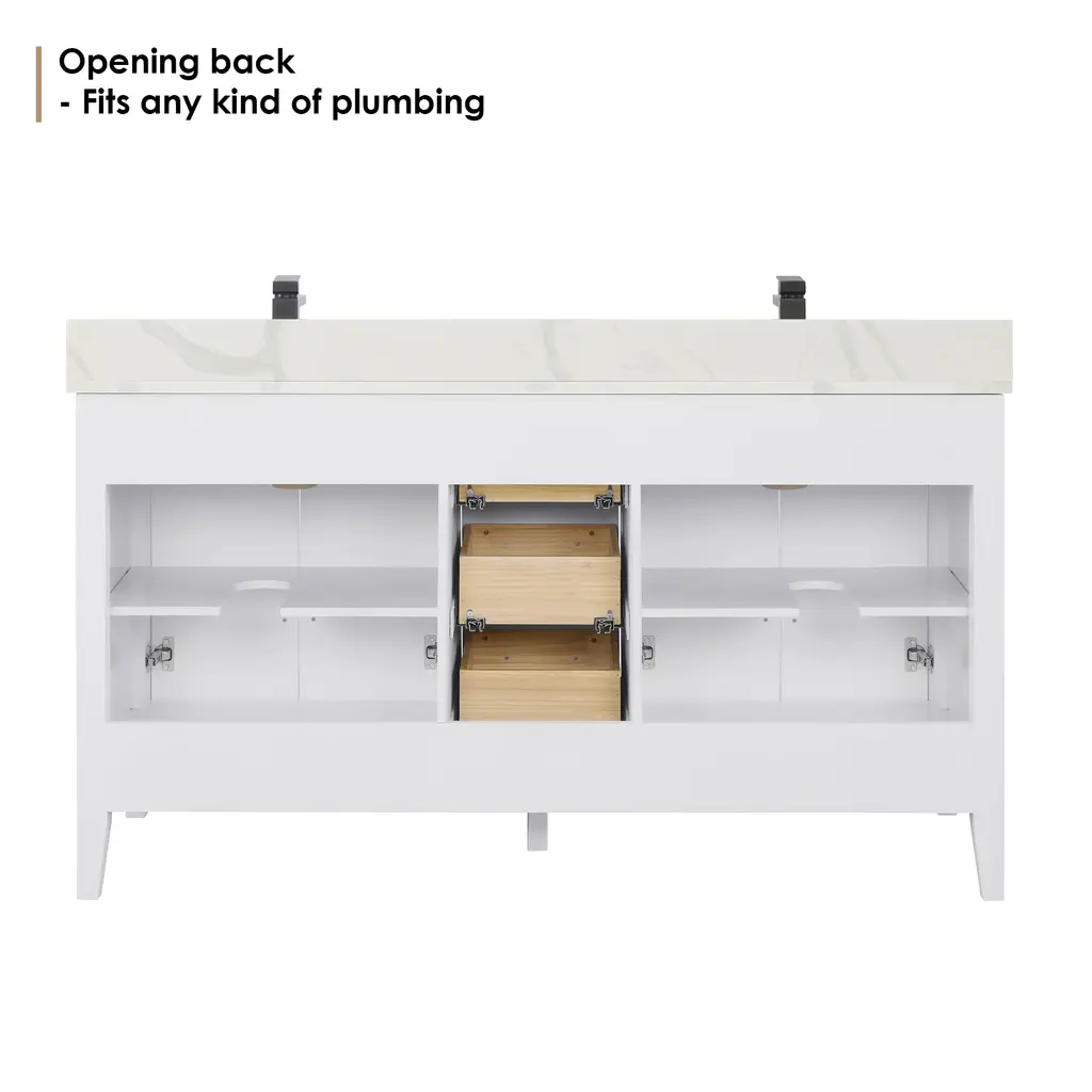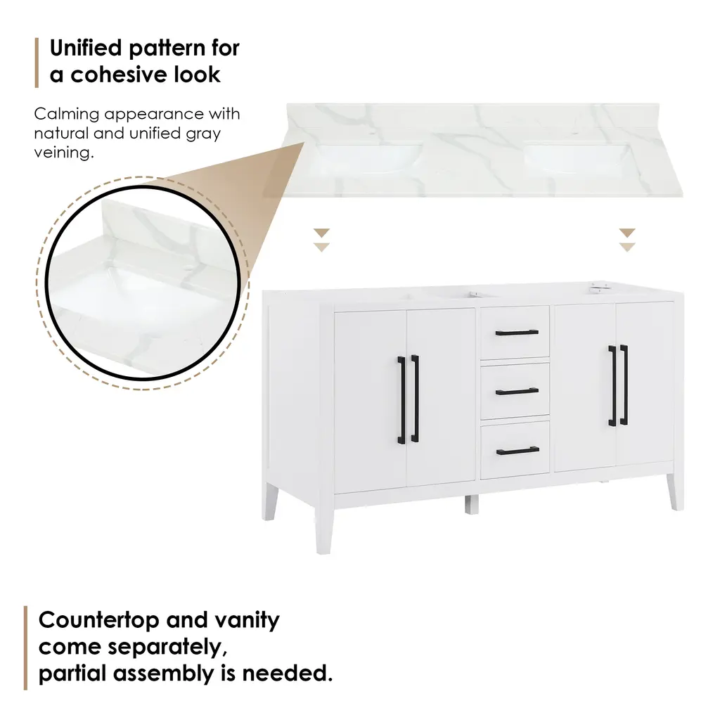 Laurel Bathroom Vanity With Calacatta White Quartz Stone Countertop, White, 60", Without Mirror