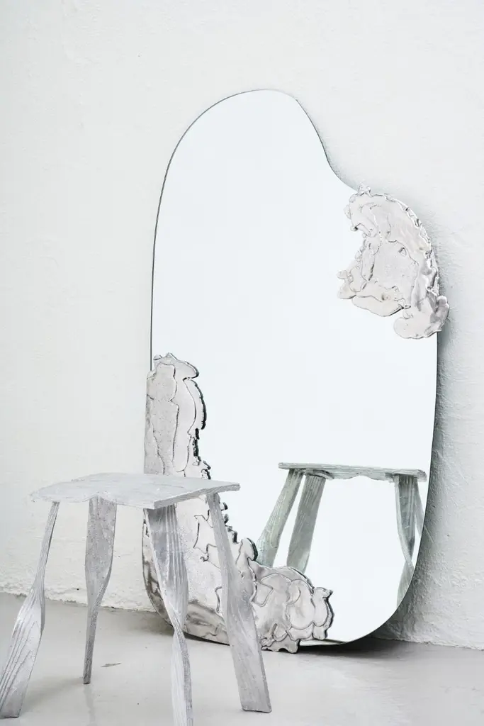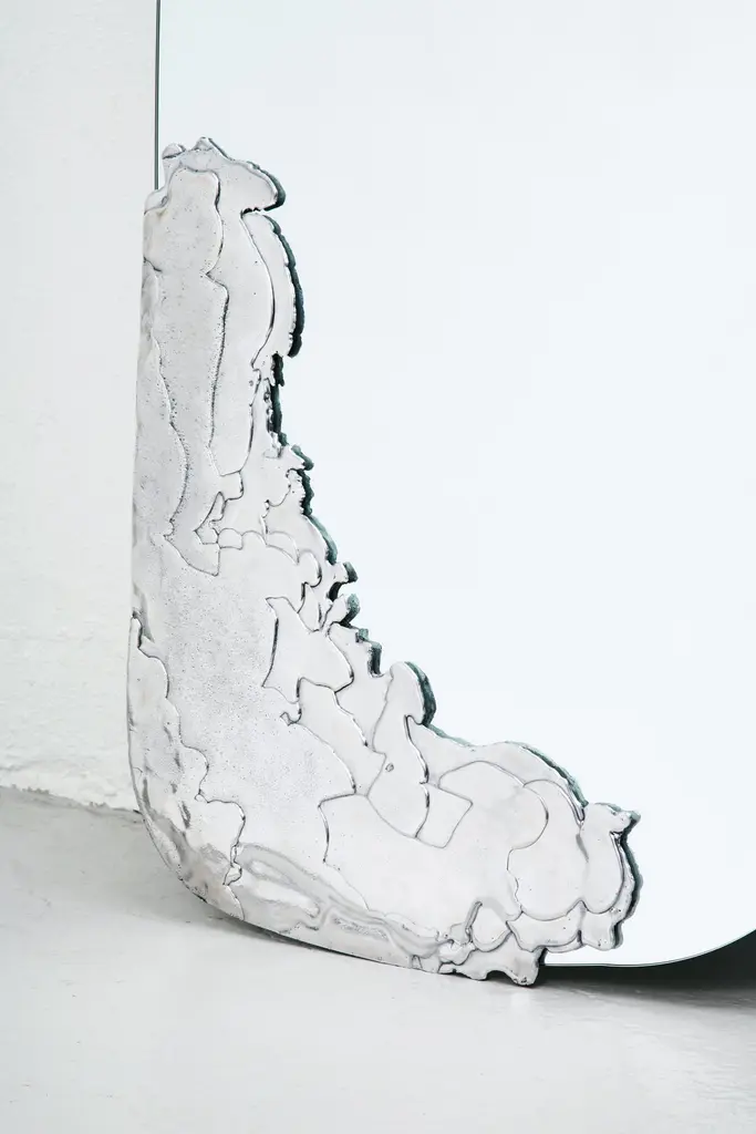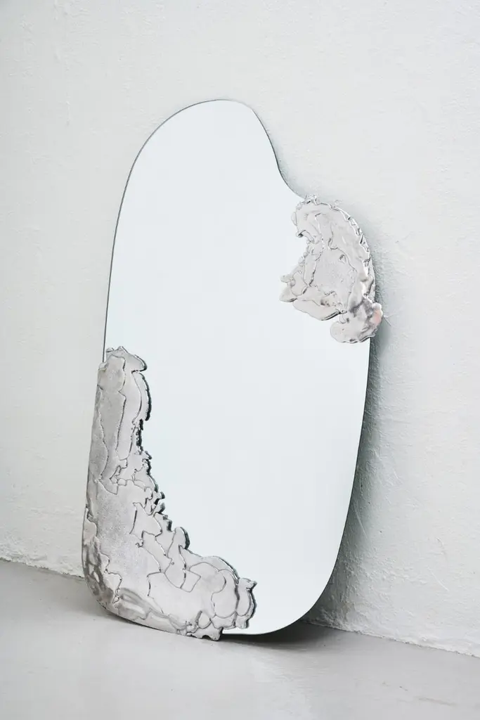 Lava mirror by Andredottir & BobekDimensions: W 130 x H 70 cmMaterials: Mirror with aluminumThe lava mirror is handcrafted and one of a kind.It is first shaped in vax and is subsequently cire perdue casted in aluminum which looks like floating lava islands. The mirror imitates a volcanos process when it’s active where lava flows and makes a pattern that is different each time. The mirror is an organically shaped wall sculpture there embody the surface of lava which imitates an lava landscape and is a mapping of a volcano in Iceland.Our artworks focus on material study, design language, object, and function. We believe that our work can contribute to society and raise socialawareness of material research in design, art, and architecture. We believe that our work can contribute to engaging artworks that createless waste and focus on high quality and sustainability in objects. We believe that our works can push ourselves and others to question the definition of objects by using modern material research in hand-built shapes and structures.We see ourselves as an art and design generation of material researchers. Our works aim to explore how objects and materials are used today inproducts and how we can cross the borders and use materials to their full potential.