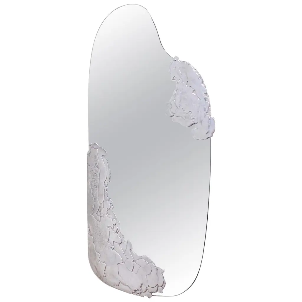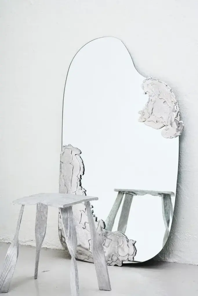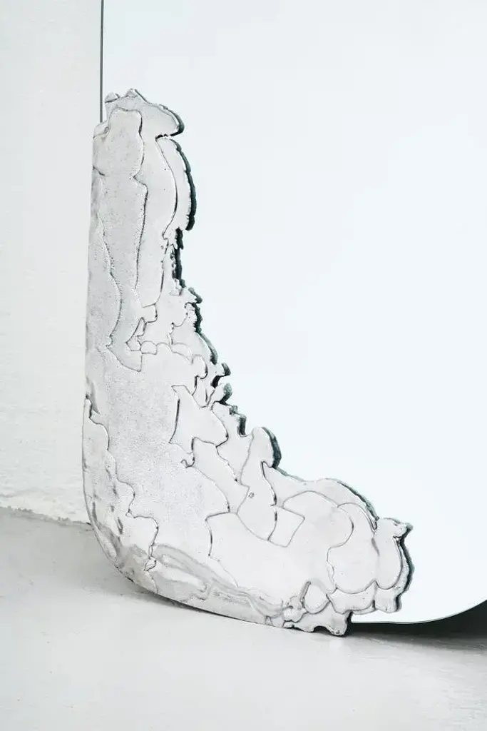 Lava mirror by Andredottir & Bobek Dimensions: W 130 x H 70 cm Materials: Mirror with aluminum The lava mirror is handcrafted and one of a kind. It is first shaped in vax and is subsequently cire perdue casted in aluminum which looks like floating lava islands. The mirror imitates a volcanos process when it’s active where lava flows and makes a pattern that is different each time. The mirror is an organically shaped wall sculpture there embody the surface of lava which imitates an lava landscape and is a mapping of a volcano in Iceland. Our artworks focus on material study, design language, object, and function. We believe that our work can contribute to society and raise social awareness of material research in design, art, and architecture. We believe that our work can contribute to engaging artworks that create less waste and focus on high quality and sustainability in objects. We believe that our works can push ourselves and others to question the definition of objects by using modern material research in hand-built shapes and structures. We see ourselves as an art and design generation of material researchers. Our works aim to explore how objects and materials are used today in products and how we can cross the borders and use materials to their full potential.