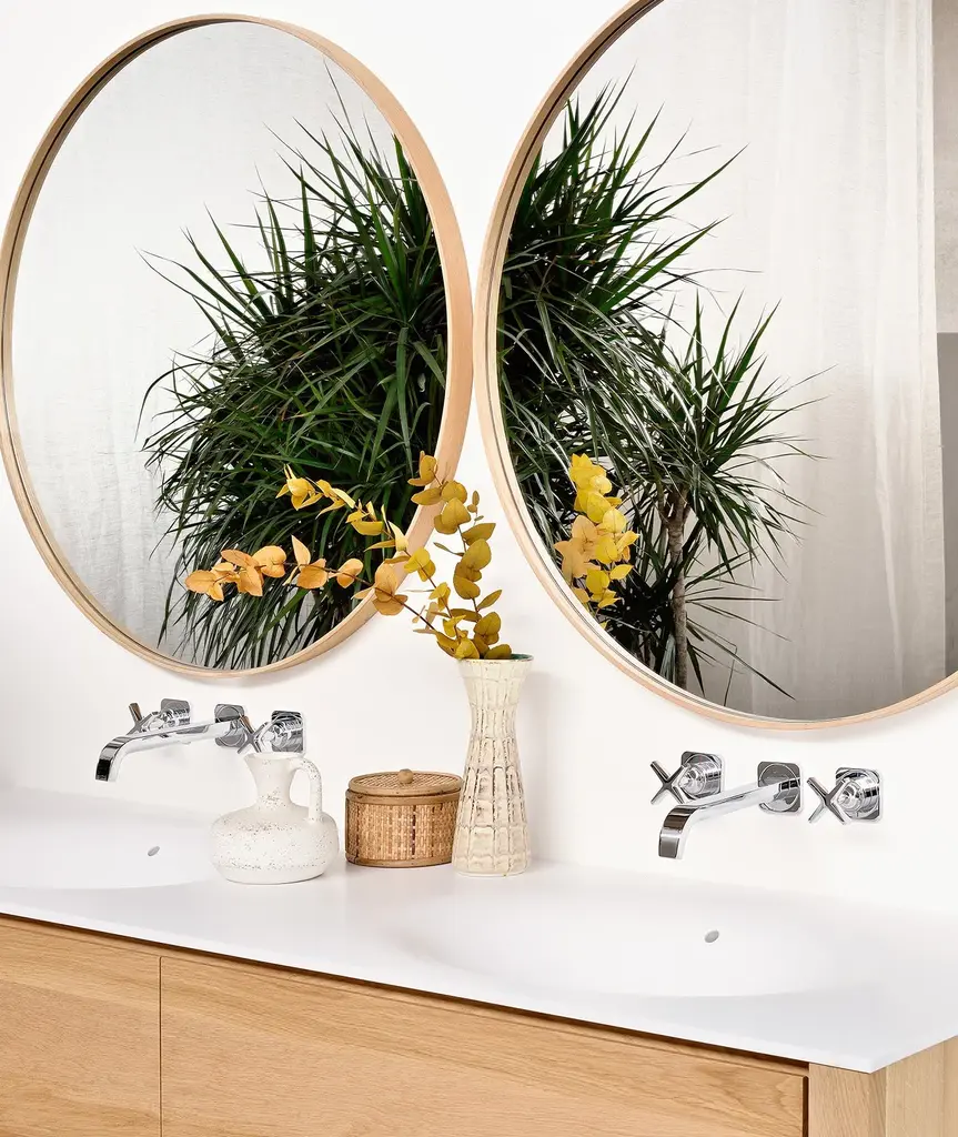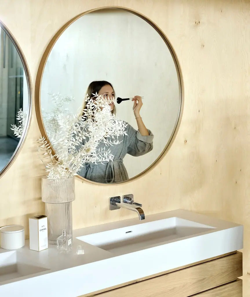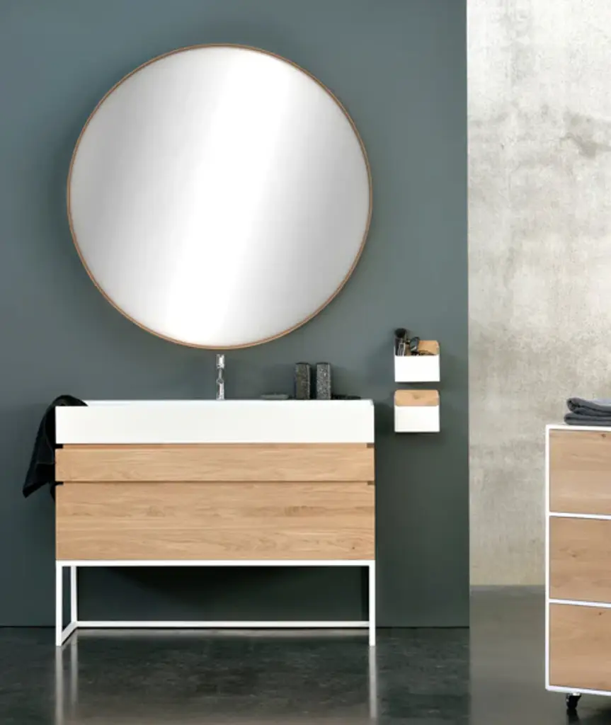 Oak edges and perfect roundness: the Layers mirror will blend in yet stand out in any bathroom setting. Every piece in the Ethnicraft Bathroom Collection, including the mirrors and other additional items, have been finished with products that fulfill the necessary requirements for use within a humid area.