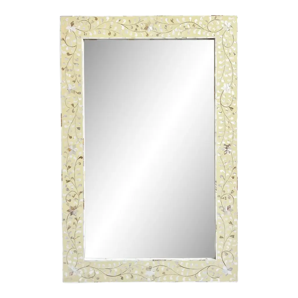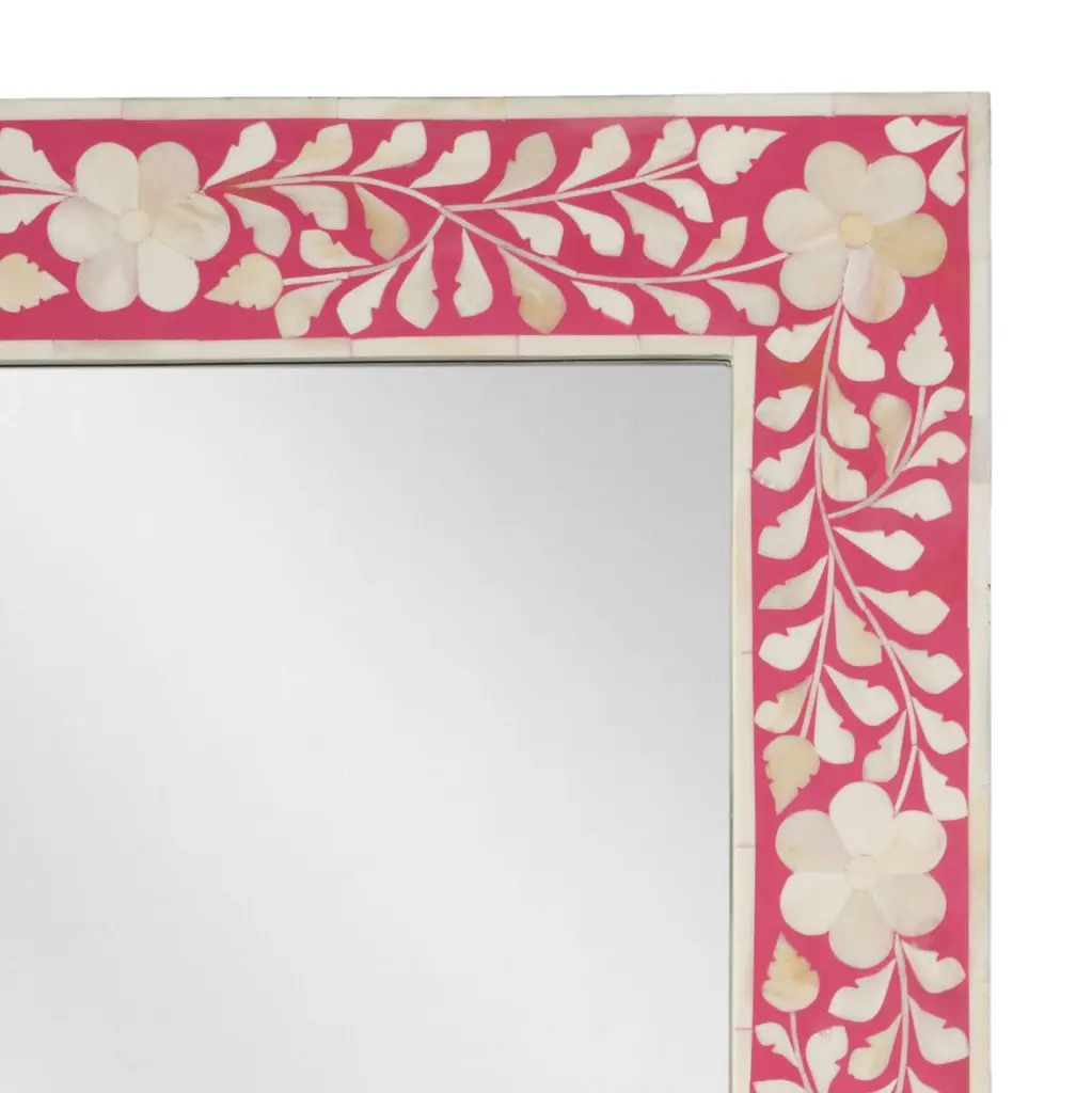 This exquisite wall mirror showcases refined artistry and exceptional craftsmanship. Its frame features an intricate pattern of flowers and vines, masterfully inlaid by hand using natural bone. Each piece of bone is carefully cut and individually applied by skilled artisans, resulting in a captivating botanical design with striking contrast. Because each mirror is handcrafted, every piece is uniquely one of a kind, bringing global character and timeless elegance to any space.