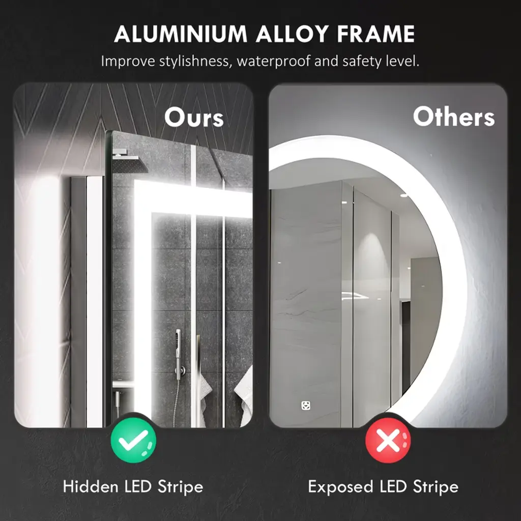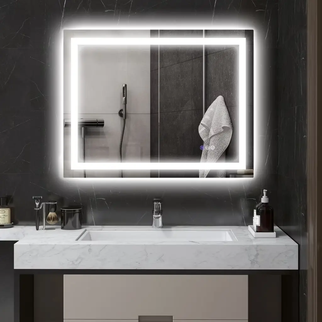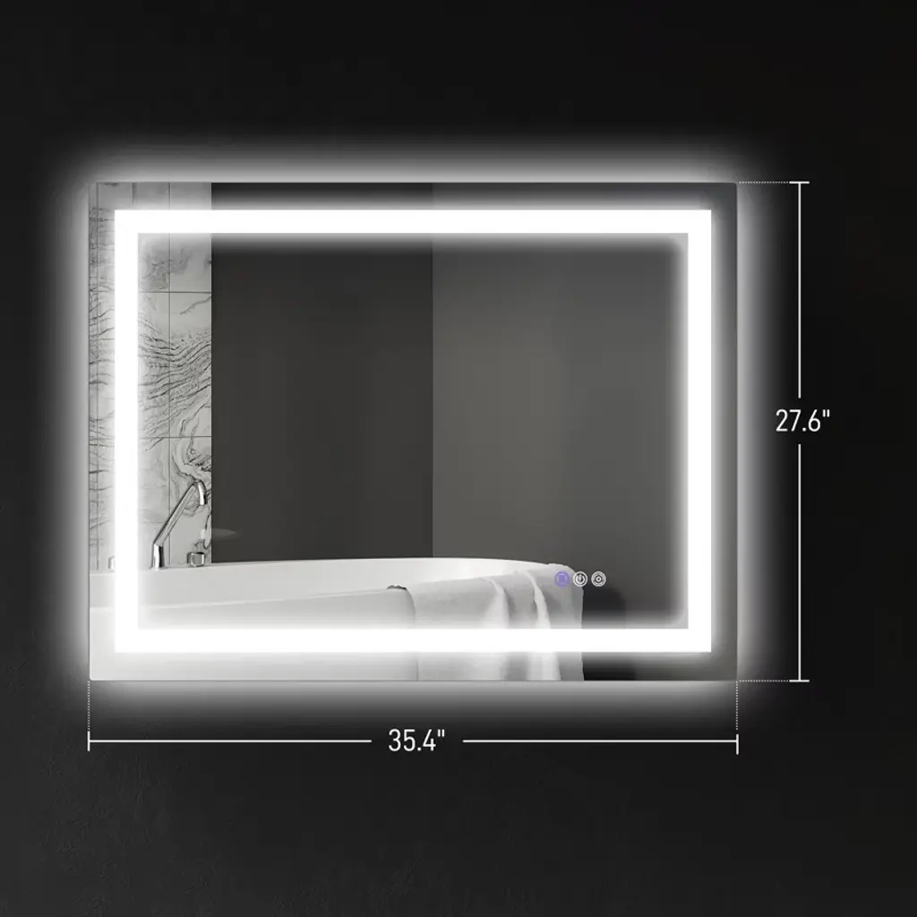 Backlit & Front-Lit: Our seemingly frameless bathroom mirror features dual lighting sources. This design ensures ample brightness for makeup application, skincare routines, shaving, and dressing up.Adjustable Brightness & Color Temperature: Create bathroom ambiance with our mirror. Effortlessly adjust its brightness and switch between 3 color temperatures (6500K-3000K-4500K). Or, long-press the button for near-infinite color temperature customization (6500K-3000K).Anti-Fog & Memory Function: Effortlessly maintain a clear mirror with the built-in anti-fog function. At the press of a button, you can defog our LED mirror, ensuring constant clarity. The defogger will automatically turn off after 1 hour for convenience, and its memory function retains your settings.Quality: Enjoy a high-definition image with a CRI90+ rating and 5mm copper-free HQ silver-coated glass. Our LED bathroom mirror has an explosion-proof film on the back for safety. An IP44 waterproof rating and concealed LED stripe in the frame provide safe light in bathroom environments.Simple: Our lighted bathroom mirror is easy to install with included mounting hardware. It has wall brackets for secure hanging vertically or horizontally and can be installed with a plug or hardwired connection (if you opt for hardwired installation, you must handle the wiring independently.)