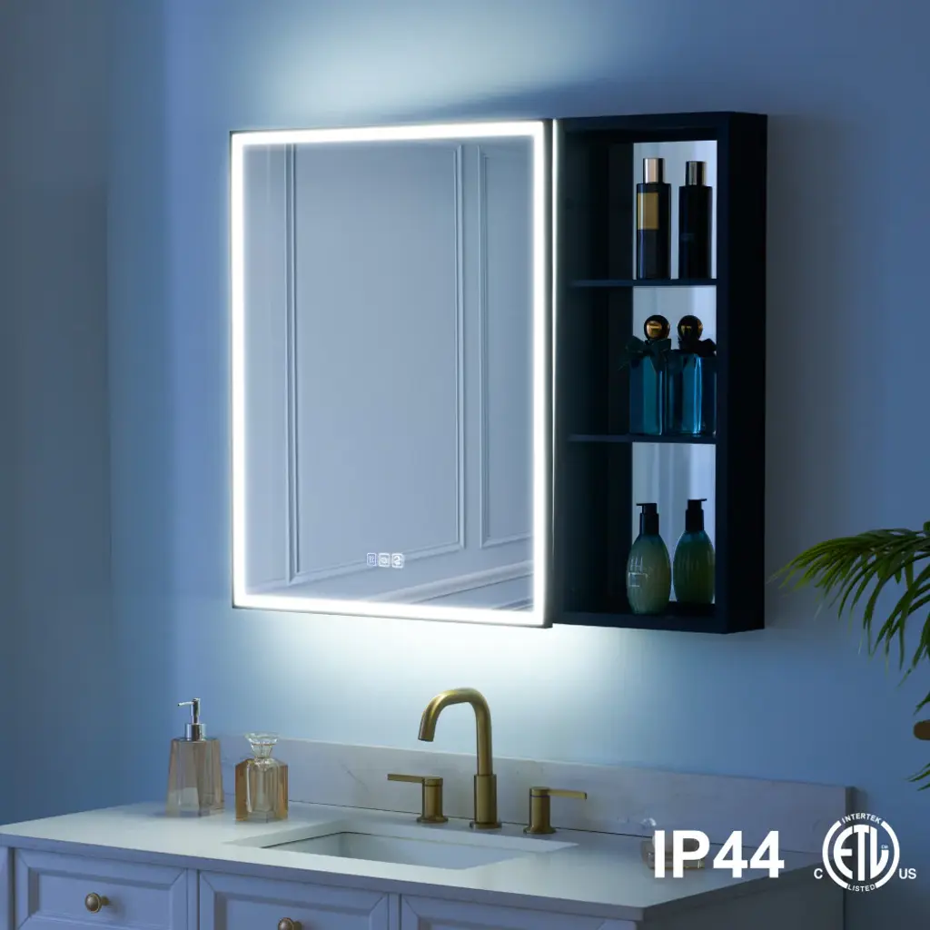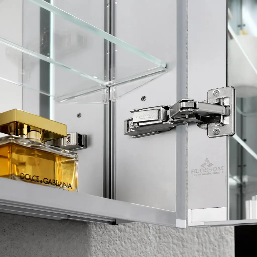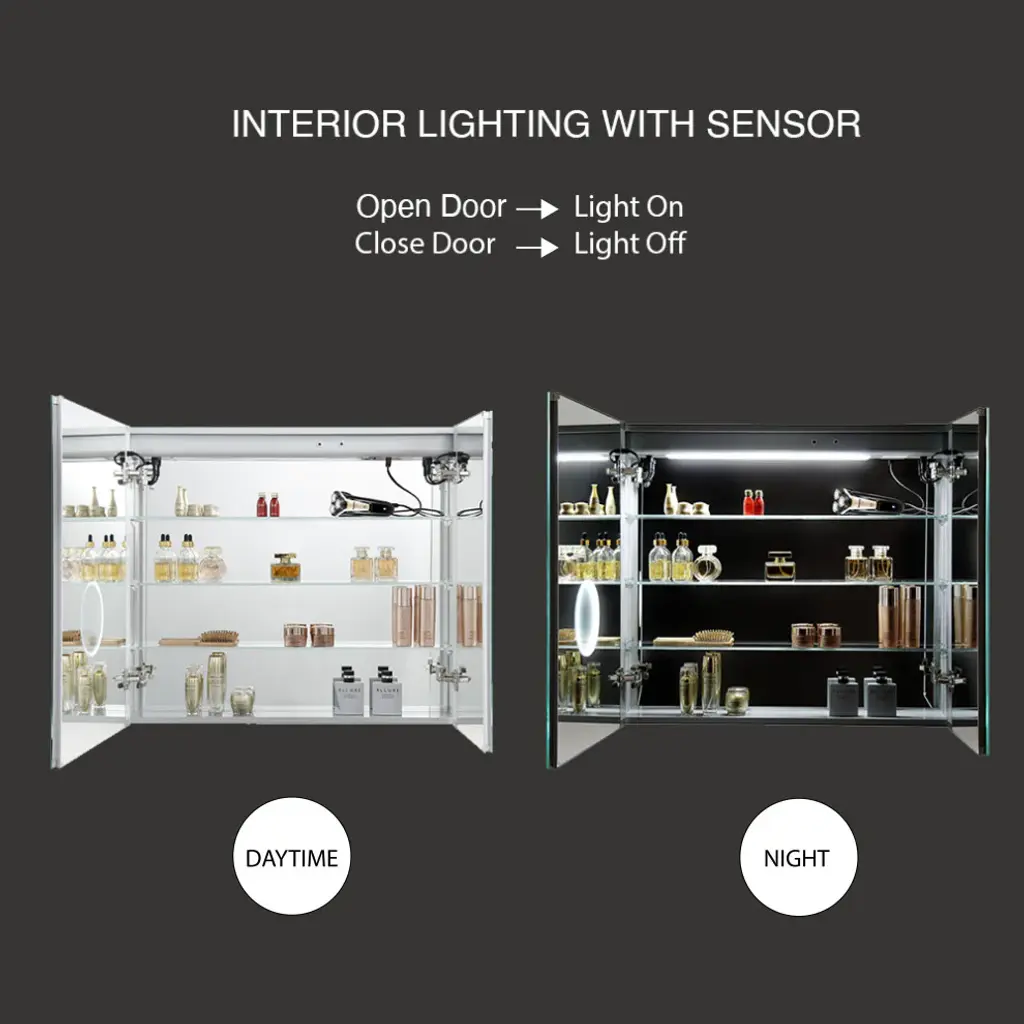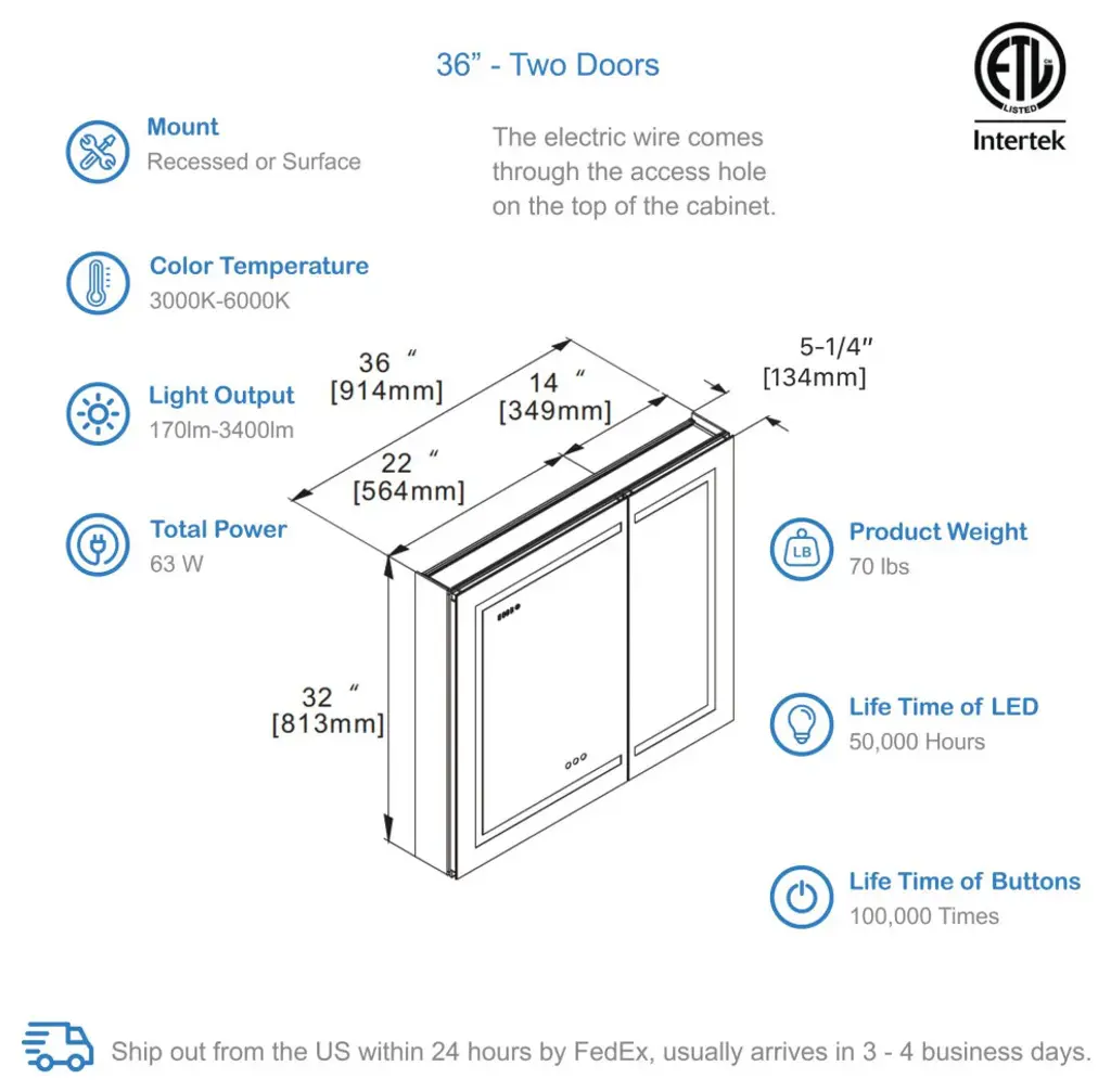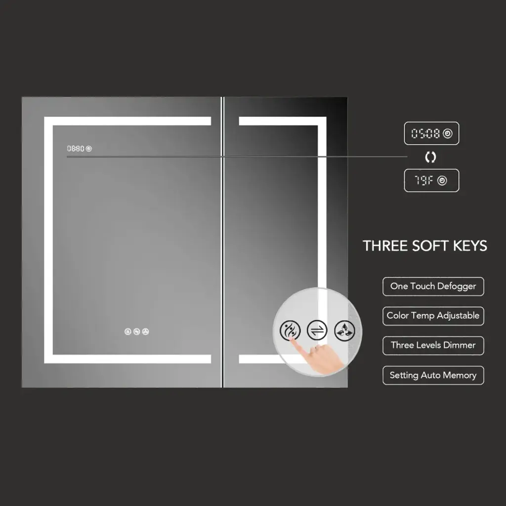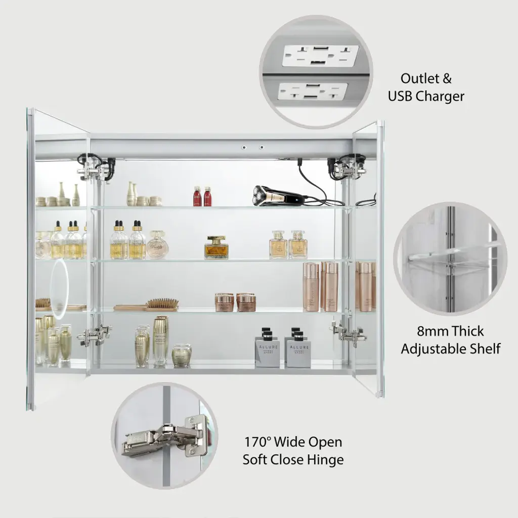 FEATURESTHREE SOFT TOUCH SWITCH makes this ETL Certified LED Medicine Cabinet simple and easy to turn ON/OFF, adjust brightness and change color temperature. BUILT-IN DEFOGGER means fogless makeup time is just one touch away.BRIGHTNESS ADJUSTABLE provides you three levels of brightness options: 5%,50%, 100%. COLOR TEMPERATURE ranges from 3000K - 6000K offers you choices of different light colors for different purposes. All these features make it the perfect led mirror medicine cabinet.Inside LED Light with door switch sensor makes it a lighted medicine cabinet when you open the door.Mirrors on both sides of the door, interior walls and both side panels, which makes it a bathroom cabinet with mirror on all sides.Three adjustable 8mm thick tempered glass medicine cabinet shelf.Built-in 20Amp dual outlet and USB 2.0 port for phone or shavers charging inside this bathroom mirror medicine cabinet.3 TIMES AMPLIFY MIRROR makes it super easy for makeup tasks.Digital programming clock/temperature display adds technology element and convenience to your bathroom.Smart memory function remembers your favorite setting, no need to adjust every time you turn on the mirror.CRI 90+ light source reproduces high-quality task lights perfect for making up. COPPER FREE silver medicine cabinet mirror prevents black edges in the harsh bathroom environment.Guaranteed 50,000 hours lifetimes and 100,000 times switch touch.High-End hardware brand BLUM 170 degree wide-open soft close hinges and provides strong support for large medicine cabinet. IP44 rated Anodized Aluminum Frame for extra durability. Scratch-free painting finish. Grooved door edges and corners for safe use.Two years warranty with top level customer service. 36 Inch bathroom medicine cabinet recessed or surfaced. Surface mount medicine cabinet, recessed medicine cabinet with lights and outlet. PLEASE BE AWARE, any LED medicine cabinet on the market cannot be served as the only lighting power source, additional lighting sources may be necessary.