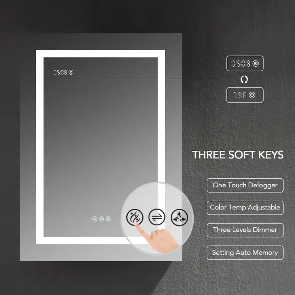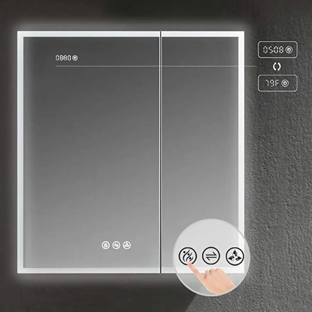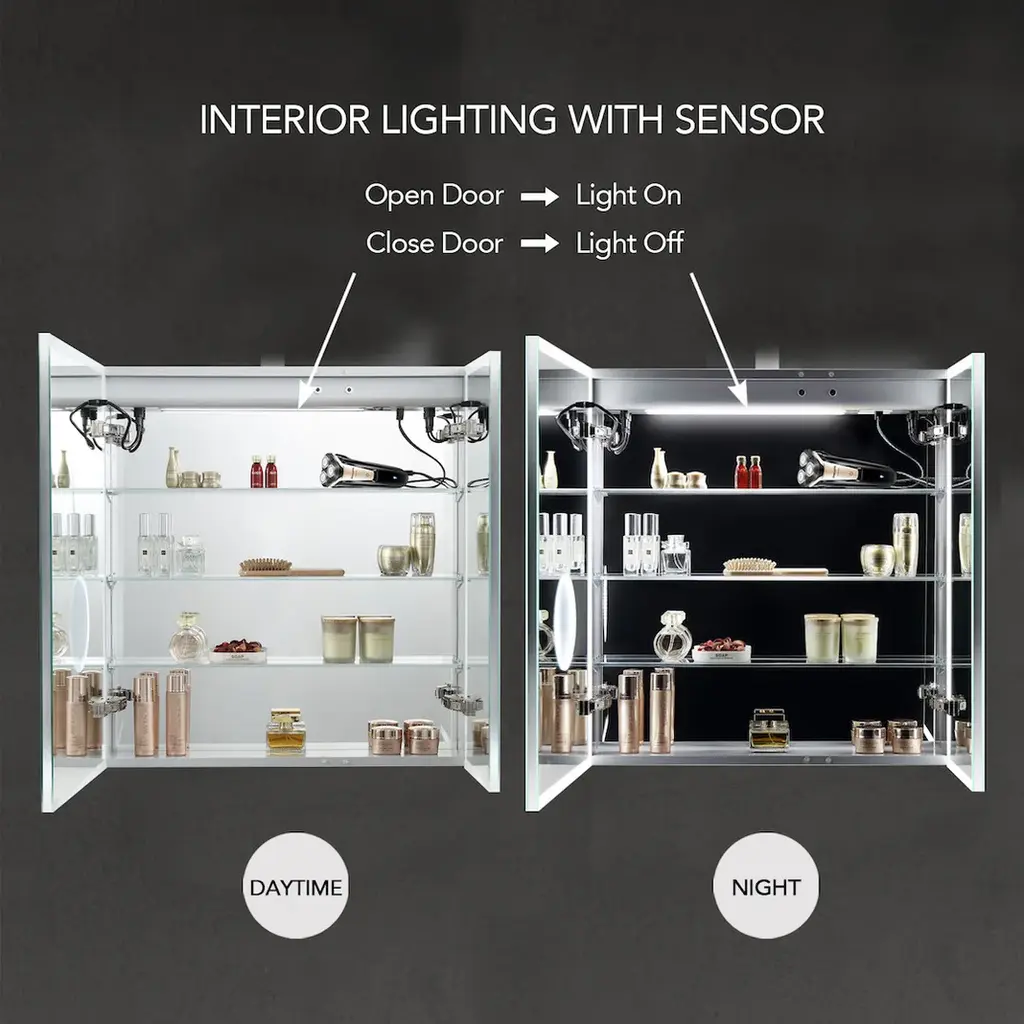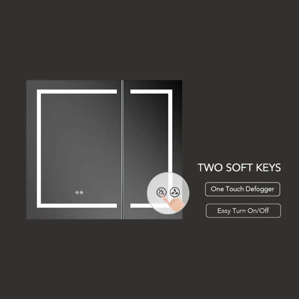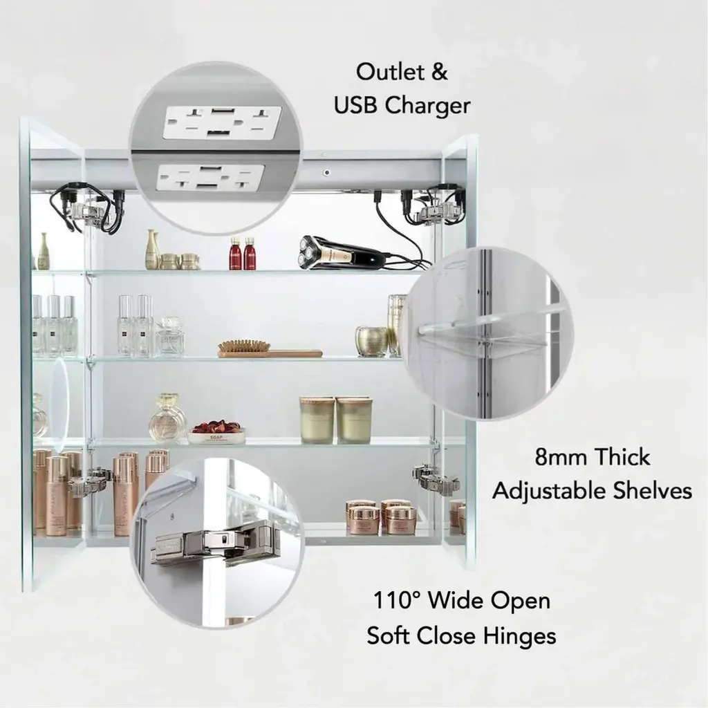FEATURESTHREE SOFT TOUCH SWITCH makes it simple and easy to turn ON/OFF, adjust brightness, and change color temperature.BUILT-IN DEFOGGER means fogless makeup time is just one touch away.3 TIMES AMPLIFY MIRROR with Inside LED Light makes it super easy for makeup tasks.BRIGHTNESS ADJUSTABLE provides you three levels of brightness options: 5%,50%, 100%.COLOR TEMPERATURE ranges from 2500K - 6000K offers you choices of different light colors for different purposes.Inside LED Light with door switch sensor. Mirrors on both sides of the door.Three adjustable 8mm thick tempered glass shelves.Built-in 20Amp dual outlet and USB 2.0 port for phone or shavers charging.Grooved door edges and corners for safe use.CRI 90+ light source reproduces high-quality task lights perfect for making up.High Quality Hinge 110 degree wide-open soft close hinges.COPPER FREE silver mirror prevents black edges in the harsh bathroom environment.Guaranteed 50,000 hours lifetimes and 100,000 times switch touch.Smart memory function remembers your favorite setting, no need to adjust every time you turn on the mirror.IP44 rated Anodized Aluminum Frame for extra durability.Scratch-free painting finish.Surface or Recess Mounting.Two years warranty with top-level customer service.