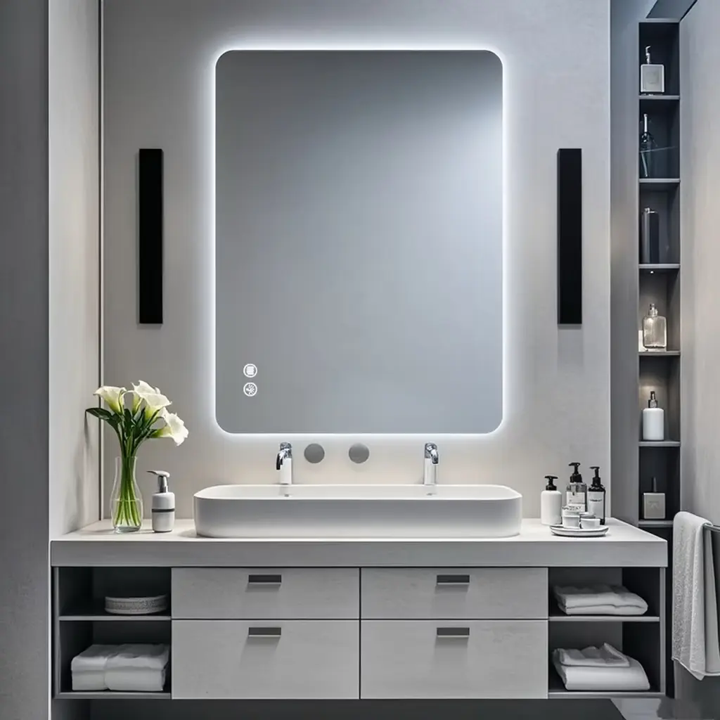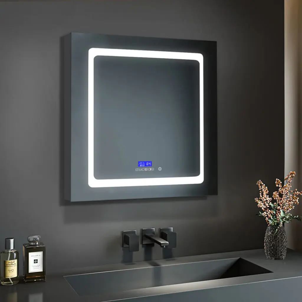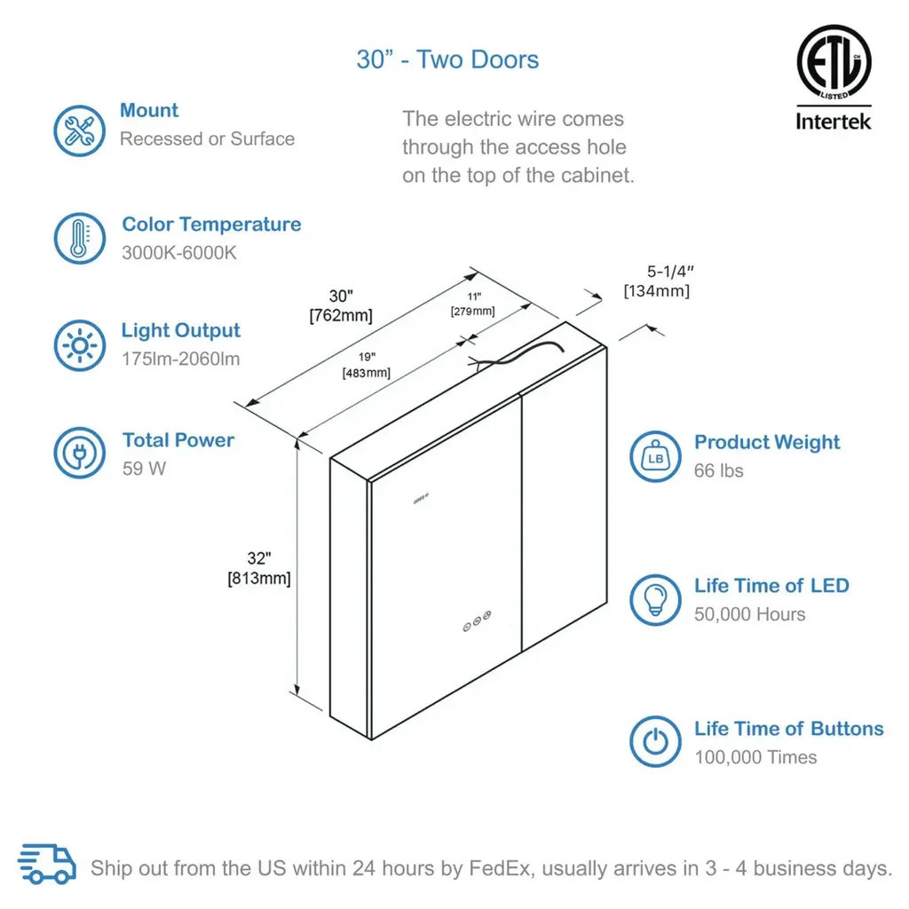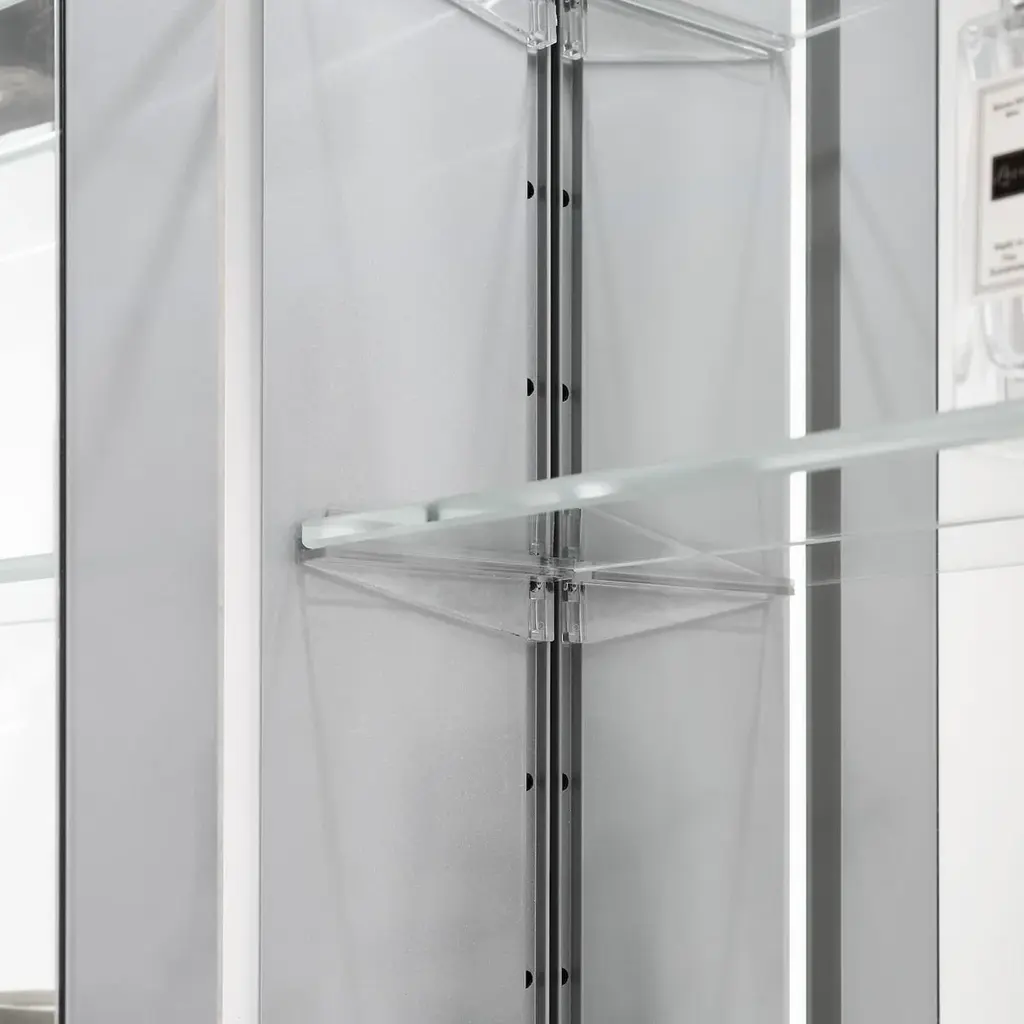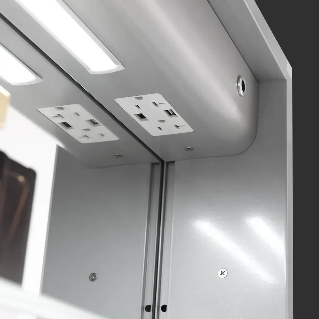 FEATURESTHREE SOFT TOUCH SWITCH makes it simple and easy to turn ON/OFF, adjust brightness, and change color temperature.BUILT-IN DEFOGGER means fogless makeup time is just one touch away.3 TIMES AMPLIFY MIRROR with Inside LED Light makes it super easy for makeup tasks.BRIGHTNESS ADJUSTABLE provides you three levels of brightness options: 5%,50%, 100%.COLOR TEMPERATURE ranges from 2500K - 6000K offers you choices of different light colors for different purposes.Inside LED Light with door switch sensor. Mirrors on both sides of the door.Three adjustable 8mm thick tempered glass shelves.Built-in 20Amp dual outlet and USB 2.0 port for phone or shavers charging.Grooved door edges and corners for safe use.CRI 90+ light source reproduces high-quality task lights perfect for making up.High Quality Hinge 110 degree wide-open soft close hinges.COPPER FREE silver mirror prevents black edges in the harsh bathroom environment.Guaranteed 50,000 hours lifetimes and 100,000 times switch touch.Smart memory function remembers your favorite setting, no need to adjust every time you turn on the mirror.IP44 rated Anodized Aluminum Frame for extra durability.Scratch-free painting finish.Surface or Recess Mounting.Two years warranty with top-level customer service.