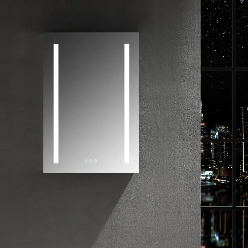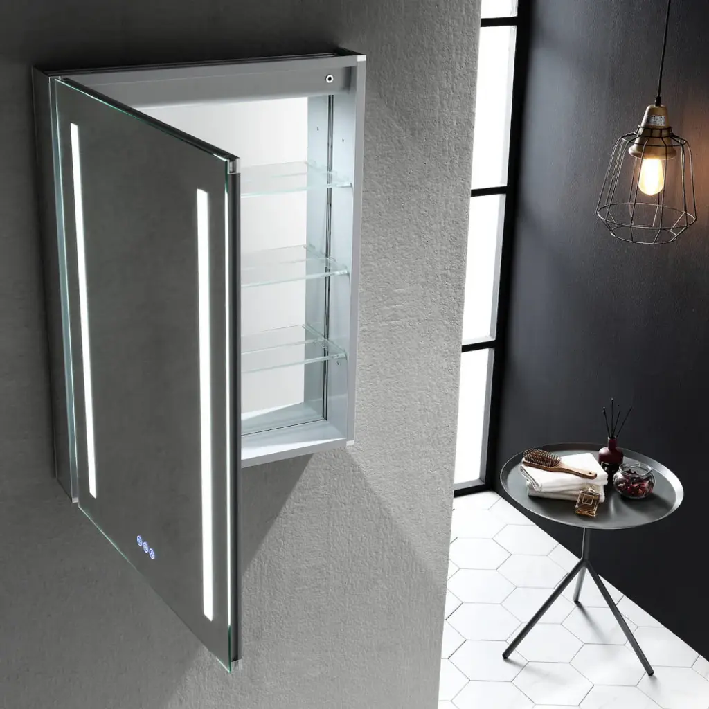 FEATURESTHREE SOFT TOUCH SWITCH makes it simple and easy to turn ON/OFF, adjust brightness and change color temperature. BUILT-IN DEFOGGER means fogless makeup time is just one touch away.BRIGHTNESS ADJUSTABLE provides you three levels of brightness options: 5%,50%, 100%.COLOR TEMPERATURE ranges from 2500K - 6000K offers you choices of different light colors for different purposes. Inside LED Light with door switch sensor.Mirrors on both sides of the door.Three adjustable 8mm thick tempered glass shelves.Built-in 20Amp dual outlet and USB 2.0 port for phone or shavers charging.Grooved door edges and corners for safe use.CRI 90+ light source reproduces high quality task lights perfect for making up. High end hardware brand BLUM 170° wide open soft close hinges.COPPER FREE silver mirror prevents black edges in harsh bathroom environment.Guaranteed 50,000 hours lifetimes and 100,000 times switch touch.Smart memory function remembers your favorite setting, no need to adjust every time you turn on the mirror.IP44 rated Anodized Aluminum Frame for extra durability. Scratch-free painting finish.Surface or Recess Mounting.Two years warranty with top level customer service.
