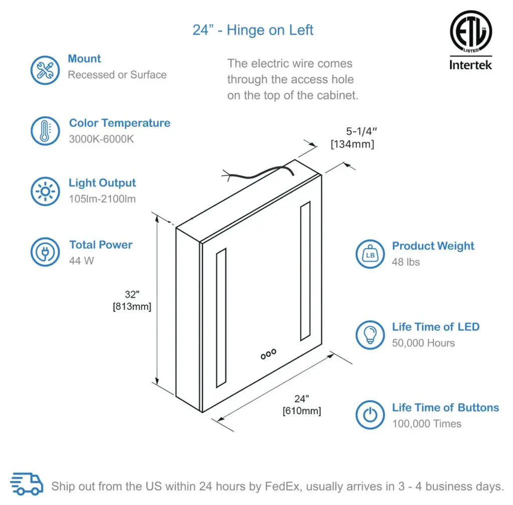 Led Mirror Medicine Cabinet With Defogger, Dimmer And Outlets, 24" Left