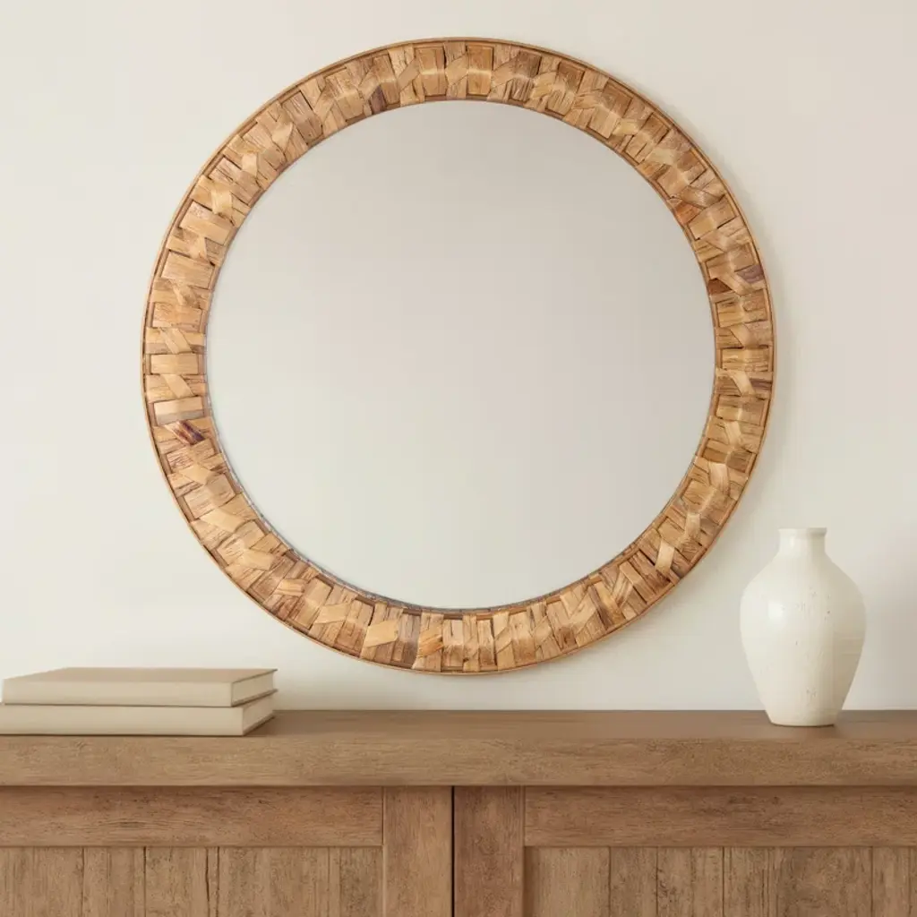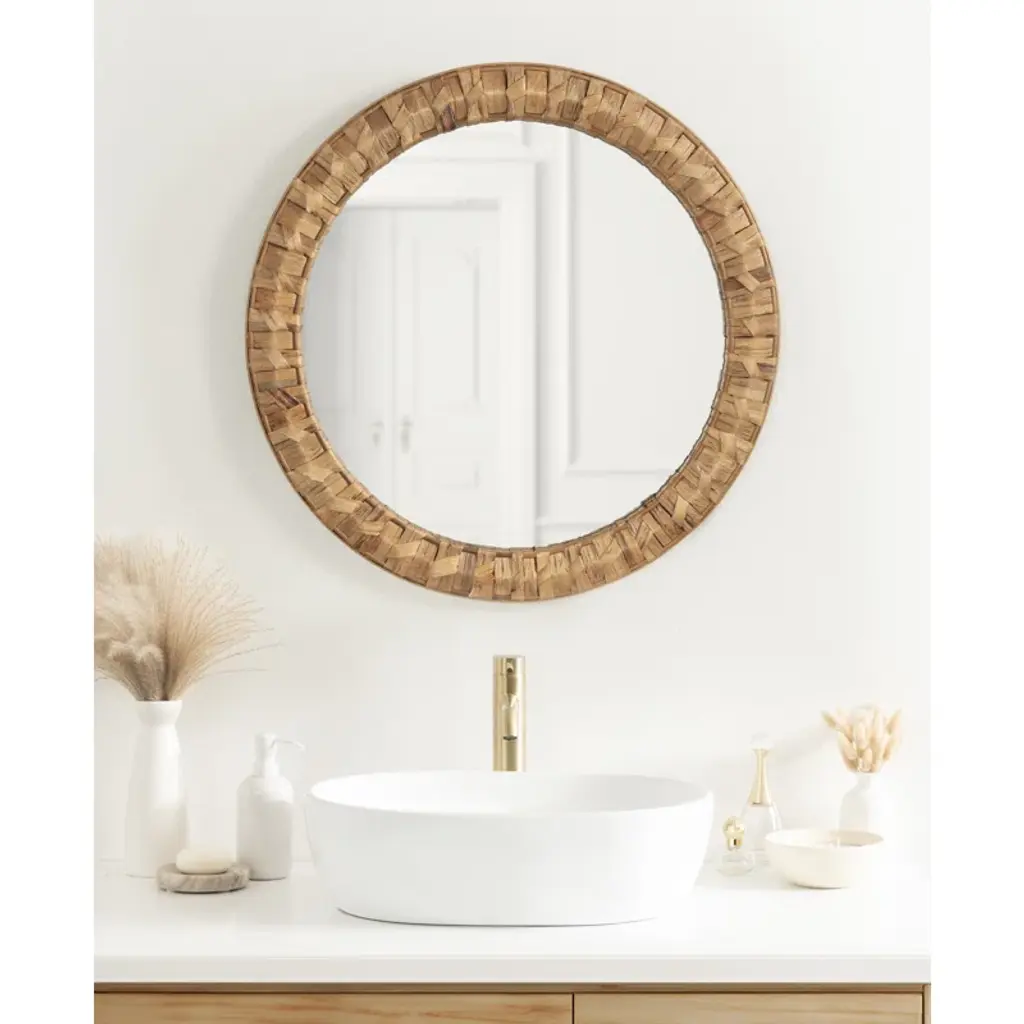 Create a coastal aesthetic in your home with this fantastic, natural mirror. This beautiful mirror is the epitome of organic modern design, featuring a round, woven mirror look on the frame that pops off the wall. The wonderfully braided frame is made from premium water hyacinth with a stunning finish to show off its rich, authentic look. The classic round shape emphasizes its unique look with a dash of modernity to showcase a geometric and trendy style on any wall. Hang this stunning piece of wall decor in your bedroom, entryway, dining room, living room, or even bathroom with its stellar and unique braided design.