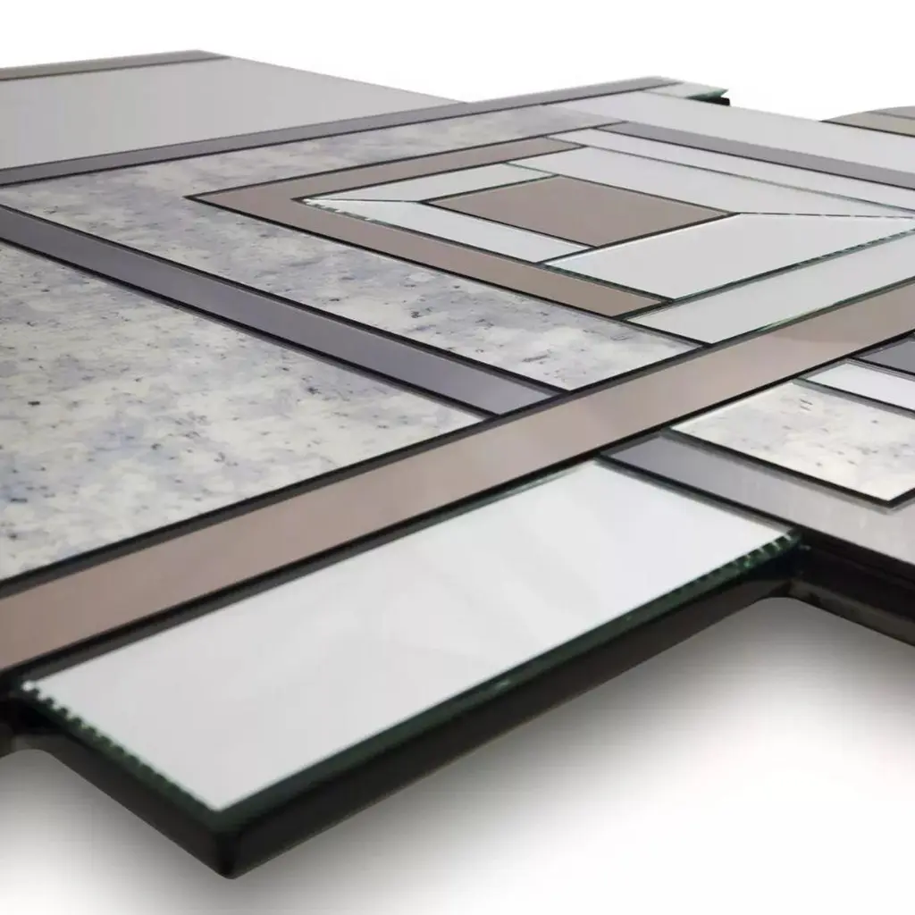 The Lemprica mirror brings together the whirlwind decade of the 1920's with rich angular shapes and multi-colored glass from the Art Deco period.Materials & Finishes:Back: Iridescent Caramel (High Gloss Finish)Front: Clear Mirror , Bronze Mirror , Smoked Mirror , Aged Mirror and Polished Brass (High Gloss Finish)Clean & Care: Clean polished metal or polished stainless with a damp cloth. Do not use commercial or heavy duty polishes or waxes, as they may scratch or damage the finish. Polishes we do recommend are Brasso, Simichrome, or our favorite Flitz; these can be used without in flicting damage even for the unskilled user, unless the polished surface has a wax sealer coat. These polishes will remove the wax while polishing the metal, but the surface would then have to be re-waxed if it is on a metal that needs to be sealed. Glass and crystal can be cleaned by wiping with a soft damp cloth or glass cleaner with no additives. Apply glass cleaner to a soft cloth rather than directly on to the texture to avoid overspray that may damage other finishes.