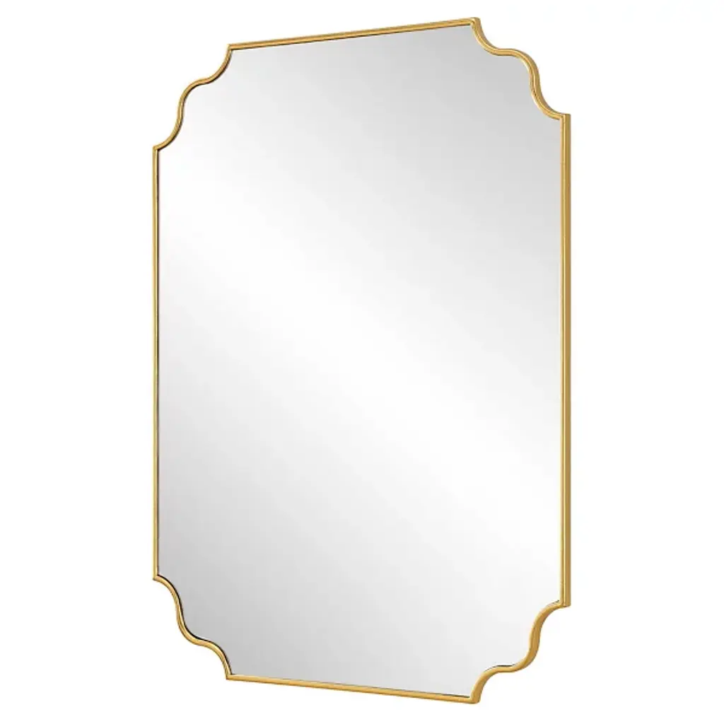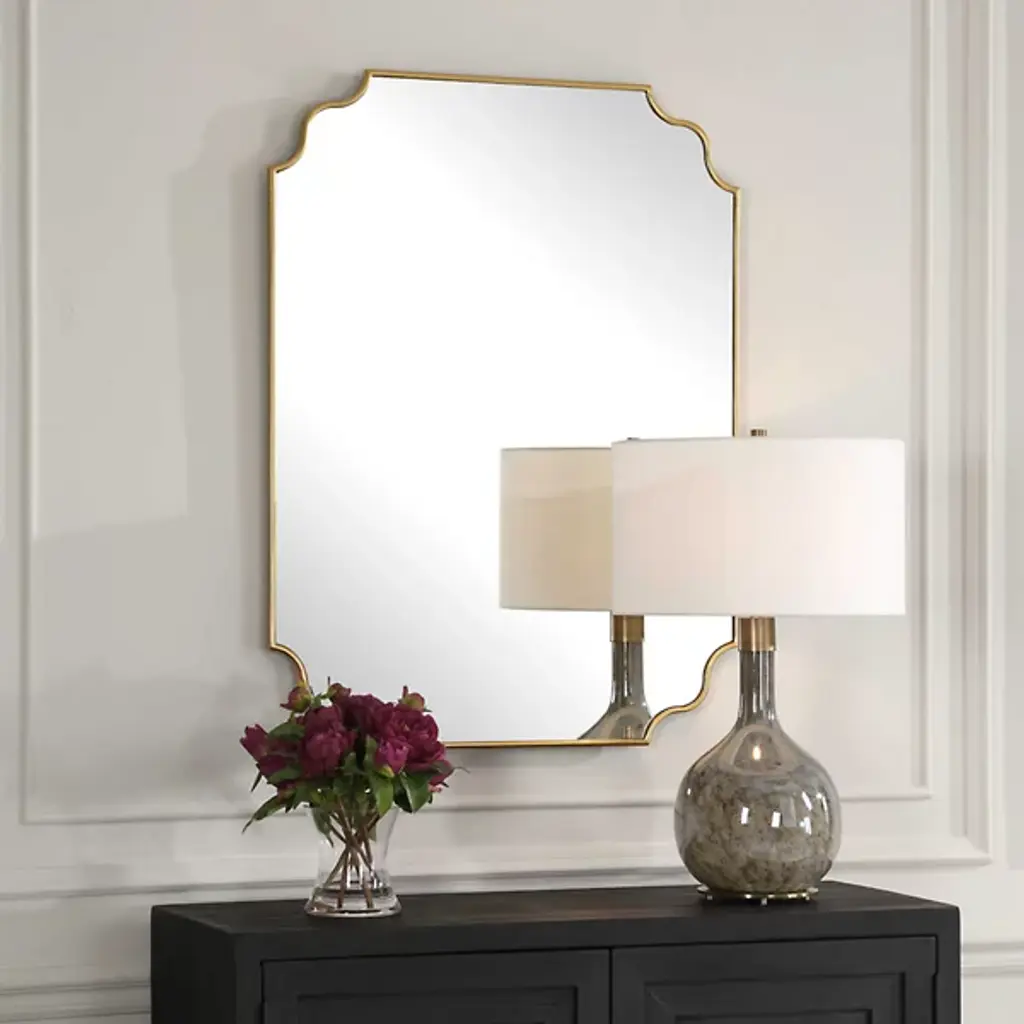 The Lennyn Vanity Mirror from Uttermost updates traditional design with refined, modern charm. Its petite frame features gracefully curved corners, showing off the Matthew Williams design finished in a lightly antiqued gold leaf for a refined touch. With its flexible mounting options for vertical or horizontal display, this mirror is an excellent choice for adding understated sophistication to transitional interiors.