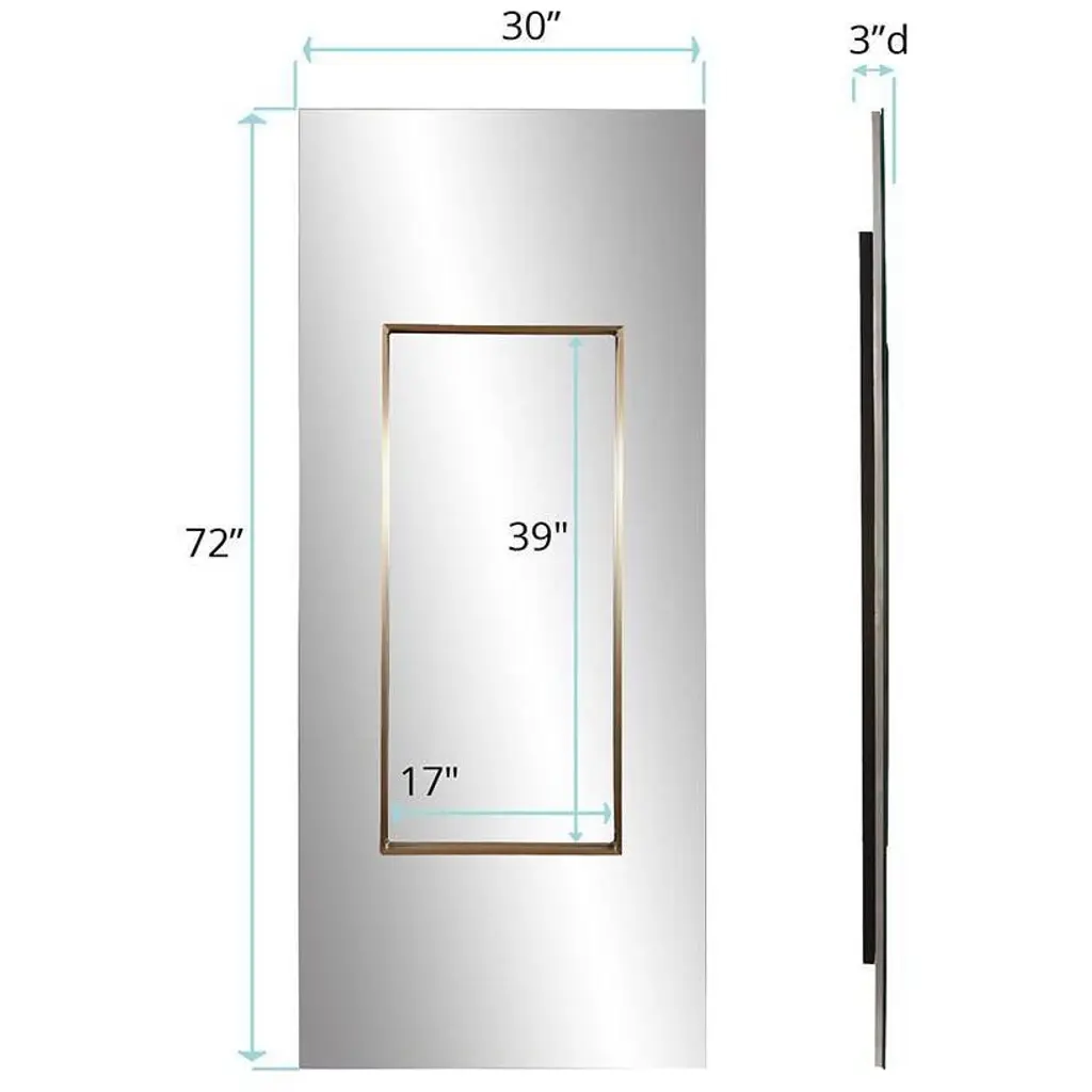 The Leonardo rectangular farmless dressing mirror features a unique mirror within a mirror design. This artfully crafted design with a center inset mirror framed in stainless steel and finished in brushed brass. An incredible statement piece in any decor from modern to classic. Whether hung in as an individual mirror in a dressing area or installed in a group these mirrors will definitely create a dramatic focal point to any room.
