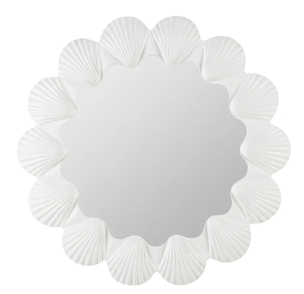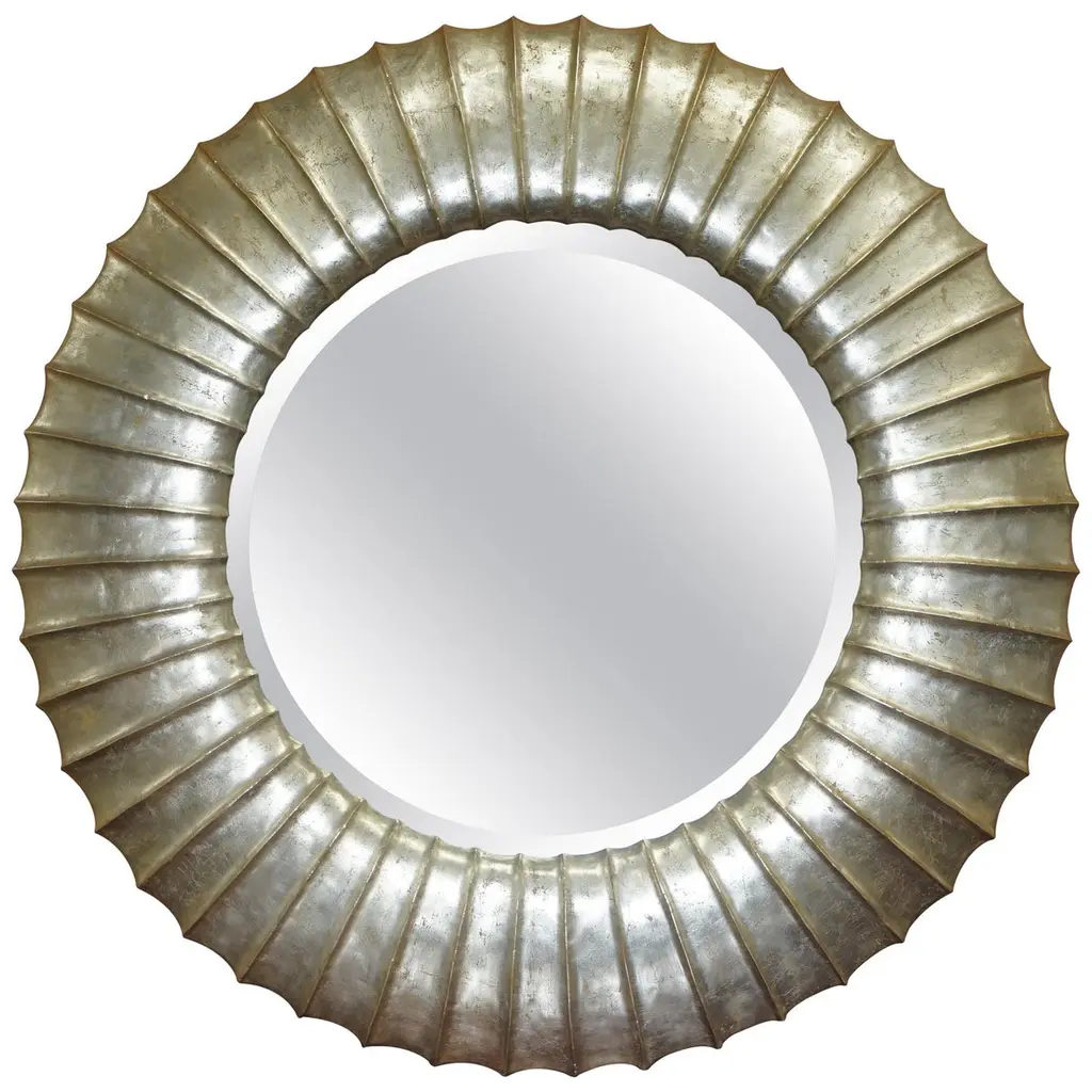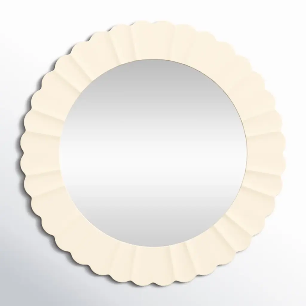 A round mirror that has scallops all around and done in our Champagne finish. The center is clear mirror with heavy bevel. This mirror is designed for portrait or landscape orientation.