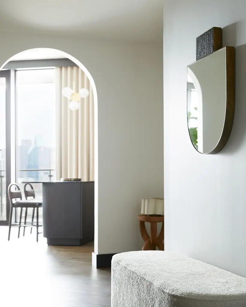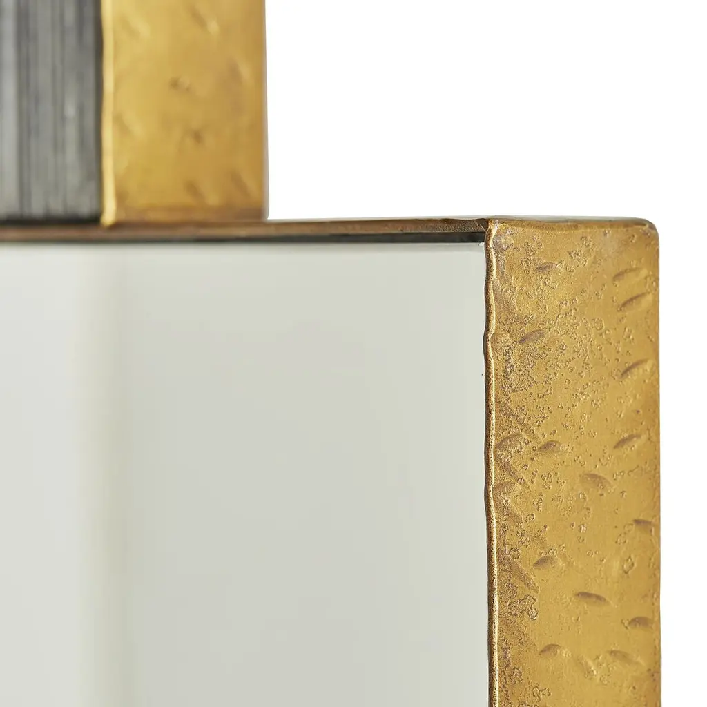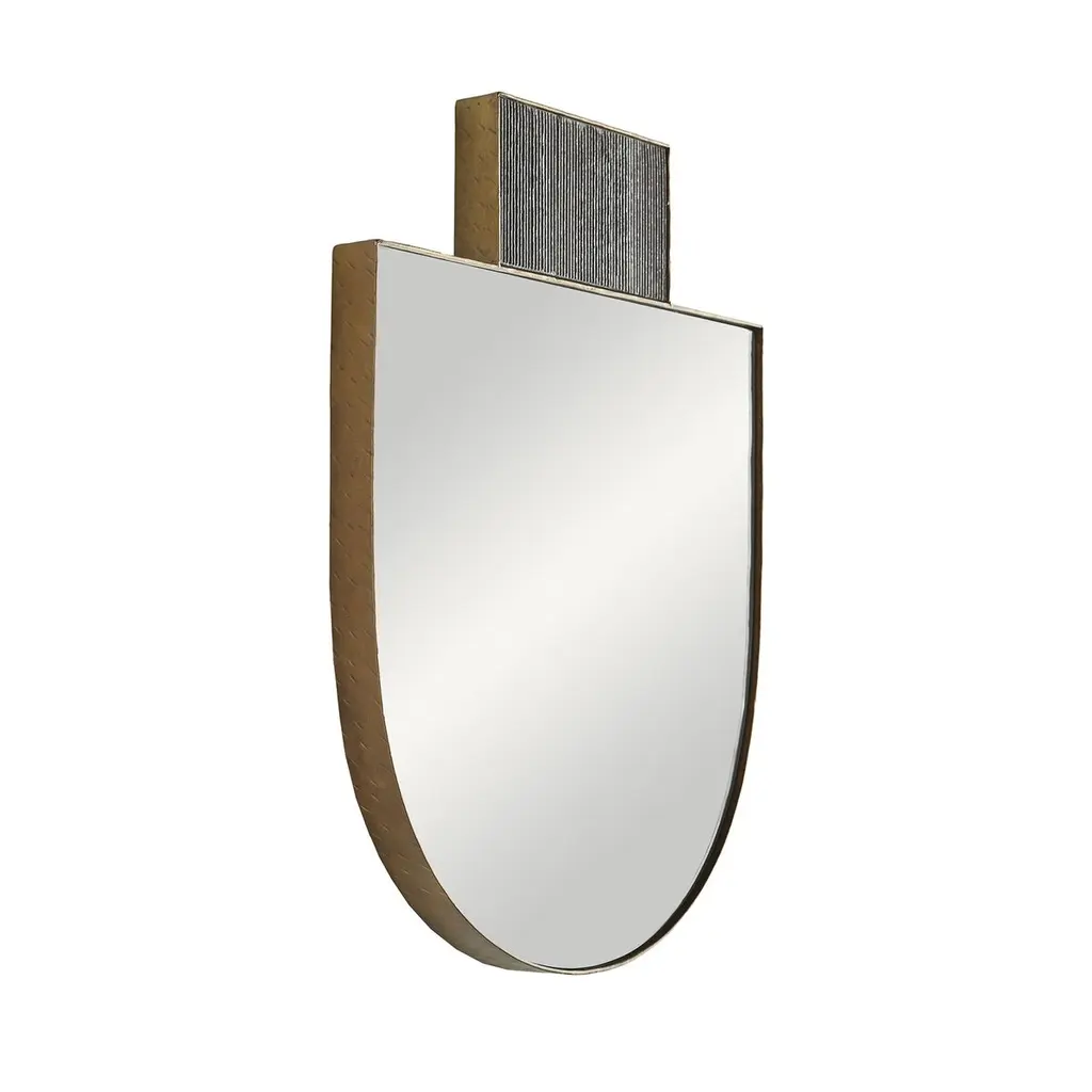 Framed in hammered gold-finished iron and topped with a chiseled black marble crown, this uniquely shaped wall mirror makes an immediate impression in any room. A security cleat attachment is included.