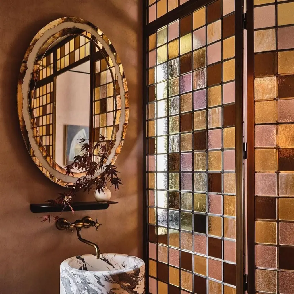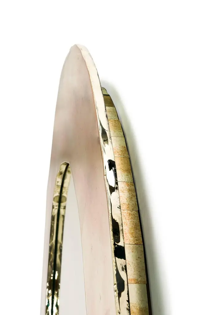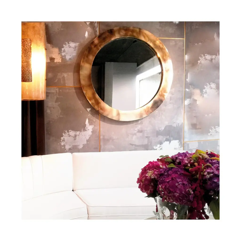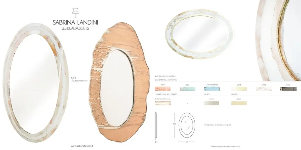 Stunning now, stunning forever. Crafted to stand the test of time, our Life mirror becomes family heirloom for future generations that can be passed down and cherished for years to come. Inspired by the life's birth, this oval or round shaped art glass surface is a mirror , surrounded by colored small tiles; the mix of these art glass plates, masterfully hammered and silvered, creates an amazing wall sculpture.Combining contemporary modern style with details inspired by our glass tradition, Sabrina Landini's Life mirror reinterprets our legendary links into head-turning design ac-cents. A brilliant new gem at home!Custom size are available on request.