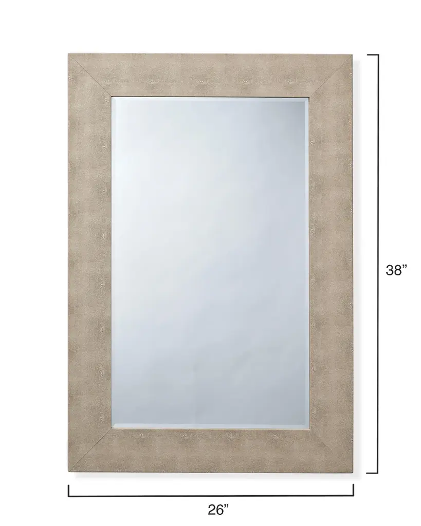 The modern and exotic texture of stingray skin or shagreen has been a favorite of designers since the 30's. Here we've combined faux shagreen with clean lines to create an intriguing contemporary blend. Mounted above a vanity, sideboard, or dresser, this mirror will open up your view and make your space feel bigger. The rectangle mirror is versatile and can be hung both vertically and horizontally. •Hand-wrapped in textured Faux Shagreen •Beveled Glass Mirror •Versatility of hanging vertical or horizontal •Faux "Stingray Skin" patterned leather •Mirror Surface: 30"H x 18.30W" •D-Loop Hanging Mechanism •Frame: 4" •MDF Black Backing Care Instructions: Wipe frame with a soft, dry cloth. Wipe glass with standard glass cleaner. DO NOT use cleaners or abrasives on mirror frame.