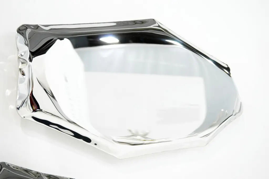 Light Gold Tafla C3 sculptural wall mirror by ZietaDimensions: D 6 x W 67 x H 124 cm Material: Stainless steel. Finish: Light gold. Available in finishes: Stainless Steel, Deep Space Blue, Emerald, Sapphire, Sapphire/Emerald, Dark Matter, Red Rubin, light gold, classic gold, or rose gold. Also available in different sizes. Steel mirror in the form of a fragmented glass or rock – TAFLA C mirror by Zieta Studio is a modern uncompromising object. It is a wall sculpture that can be arranged in personalized groups to create artistic installations in private and public spaces.In the Transitions Collection, these unusual mirrors in various sizes and shapes are available in two colors: Red Rubin and Dark Matter. TAFLA C Red Rubin mirror resembles a piece of ruby, while the TAFLA C Dark Matter is like a gate to another dimension. This collection of mirrors will be a perfect decoration for a home with style or for a public space that aims to stand out in the crowd.The geometric TAFLA C comes in seven different sizes – it can be arranged in an artistic personalized composition or exposed on a wall as a single sculpture-like mirror.About Zieta: Zietas main goal is to deliver uniqueness and customization in design and construction while keeping the production, transport, and warehousing innovatively efficient.This is how they imagine the future world: Light, durable structures of customized applications produced on demand out of one-of-a-kind parts, yet efficiently.They use a computer-controlled production process. Customized pattern, customized form, customized function, one-of-a-kind product, and outstanding precision are what they deliver.You will find all of this philosophy reflected in the products. The research, they discover new possibilities, they play with forms and they deliver a beautiful, innovative, surprising outcome to people who love the design and who care about design development.They believe their work is a valuable contribution to the world of design not only by the unique beauty of the forms but most of all by opening ultra-innovative opportunities of forming and new paths for the world of the future.