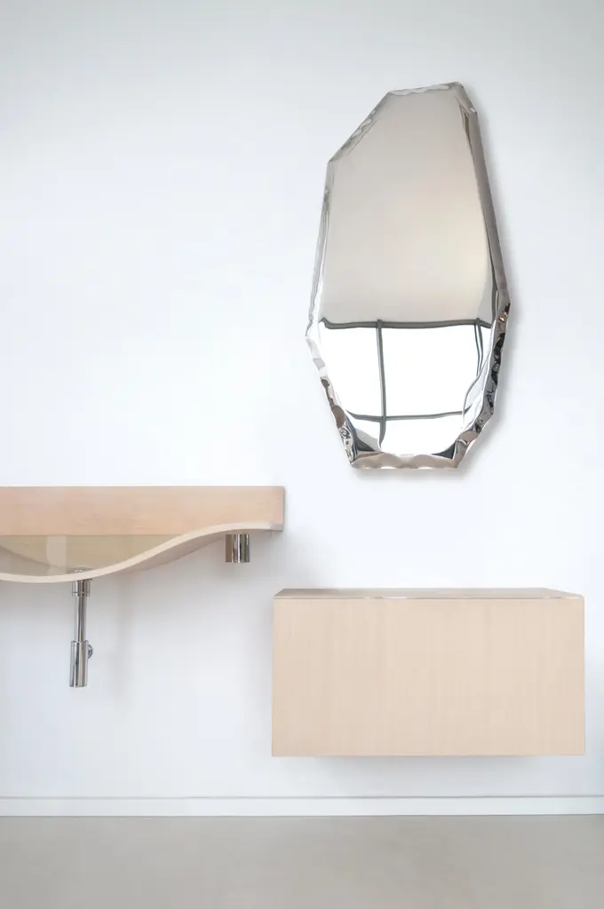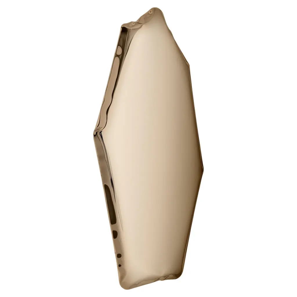 Light Gold C4 sculptural wall mirror by ZietaDimensions: D 6 x W 50 x H 100 cm Material: Stainless steel. Finish: Light gold.Available in finishes: Stainless Steel, Deep Space Blue, Emerald, Sapphire, Sapphire/Emerald, Dark Matter, Red Rubin, light gold, classic gold, or rose gold. Also available in different sizes. Steel mirror in the form of a fragmented glass or rock – TAFLA C mirror by Zieta Studio is a modern uncompromising object. It is a wall sculpture that can be arranged in personalized groups to create artistic installations in private and public spaces.In the Transitions Collection, these unusual mirrors in various sizes and shapes are available in two colors: Red Rubin and Dark Matter. TAFLA C Red Rubin mirror resembles a piece of ruby, while the TAFLA C Dark Matter is like a gate to another dimension. This collection of mirrors will be a perfect decoration for a home with style or for a public space that aims to stand out in the crowd.The geometric TAFLA C comes in seven different sizes – it can be arranged in an artistic personalized composition or exposed on a wall as a single sculpture-like mirror.About Zieta: Zietas main goal is to deliver uniqueness and customization in design and construction while keeping the production, transport, and warehousing innovatively efficient.This is how they imagine the future world: Light, durable structures of customized applications produced on demand out of one-of-a-kind parts, yet efficiently.They use a computer-controlled production process. Customized pattern, customized form, customized function, one-of-a-kind product, and outstanding precision are what they deliver.You will find all of this philosophy reflected in the products. The research, they discover new possibilities, they play with forms and they deliver a beautiful, innovative, surprising outcome to people who love the design and who care about design development.They believe their work is a valuable contribution to the world of design not only by the unique beauty of the forms but most of all by opening ultra-innovative opportunities of forming and new paths for the world of the future. __