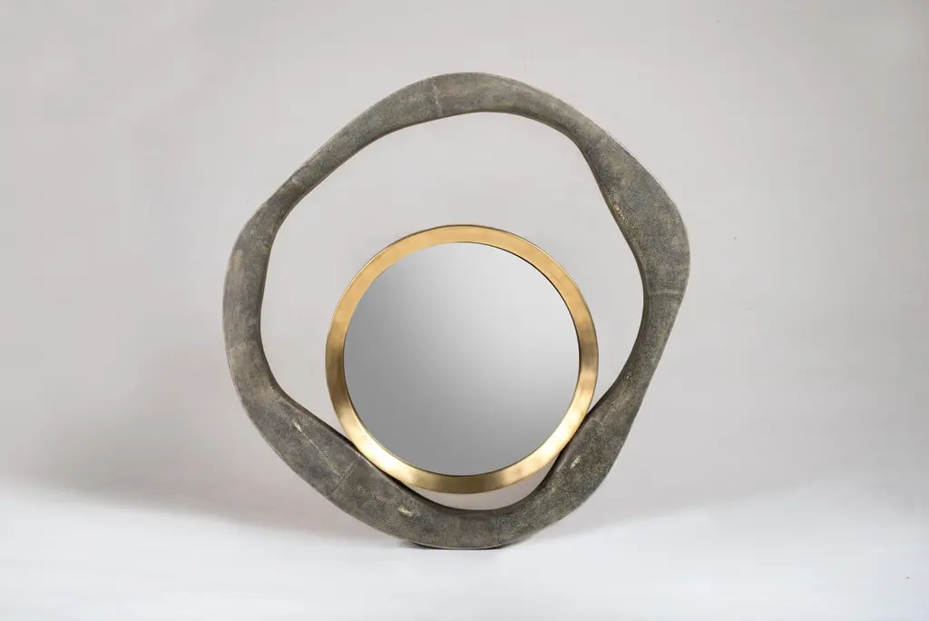 The Paris based label has distinguished themselves since their launch, with their iconic use of shagreen mixed with brass and other exotic materials. All furniture is handcrafted by skilled artisans, ultimately making each piece unique, designed in Paris and produced in the Philippines.The Lily mirror by R&Y Augousti in cream Shagreen and bronze-patina brass, is an iconic piece of theirs and is an extremely versatile mirror. Due to the fixtures at the back this piece can be hung in three different ways creating a different expression each time with its amorphous and poetic shape. Available other finishes and a large size, images at end of slide. Custom color and sizing available on request.The finish of the Shagreen is authentic as it is hand-dyed and the designer calls the finish look, "antique natural Shagreen."The dimensions of this piece are 77 x 43 x 7.6 cm / 30.5" x 28.25" x 3"All R&Y Augousti pieces are handmade by artisans, ultimately making each piece unique. Wipe clean with soft dry cloth.Acclaimed design duo Ria & Yiouri Augousti have established themselves since the 1990s as pioneers of modern-vintage style through their luxurious Art Deco inspired collections.The Paris based label has distinguished themselves since their launch, with their iconic use of Shagreen mixed with brass and other exotic materials. All furniture is handcrafted by skilled artisans, ultimately making each piece unique.All Shagreen-covered items should be kept out of direct sunlight, color variants may occur on the stingray and other exotic finishes, but this showcases the Parisian label's commitment to creating authentic luxurious products using natural components.