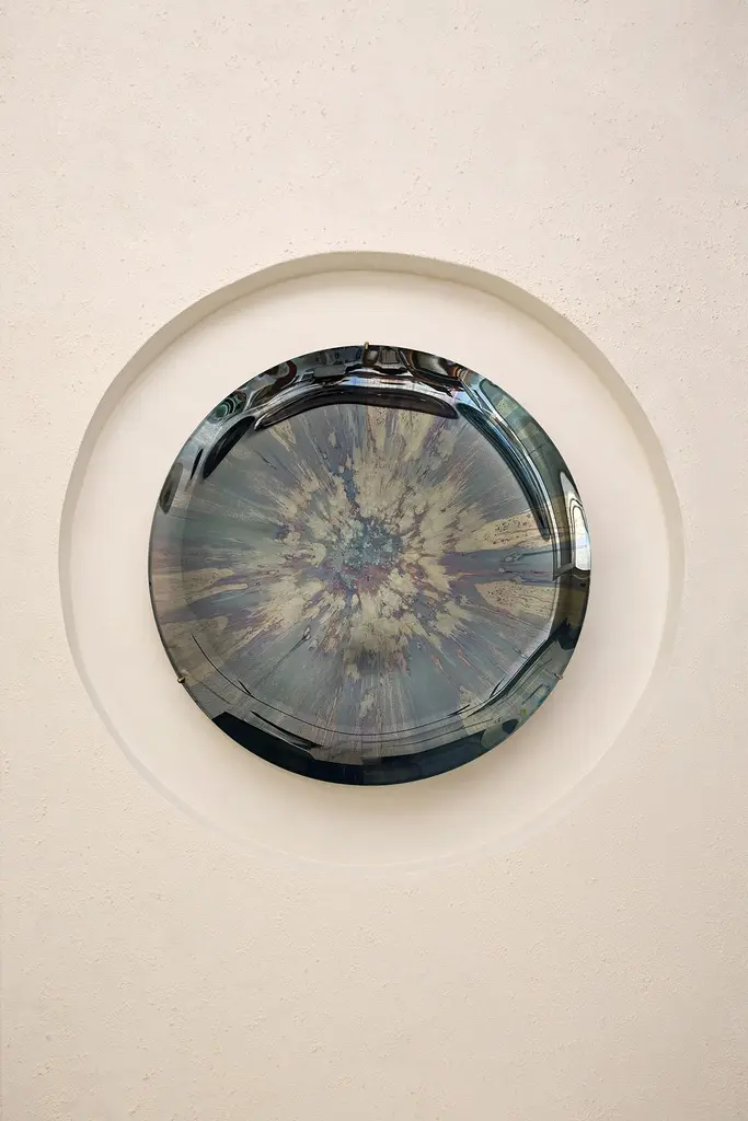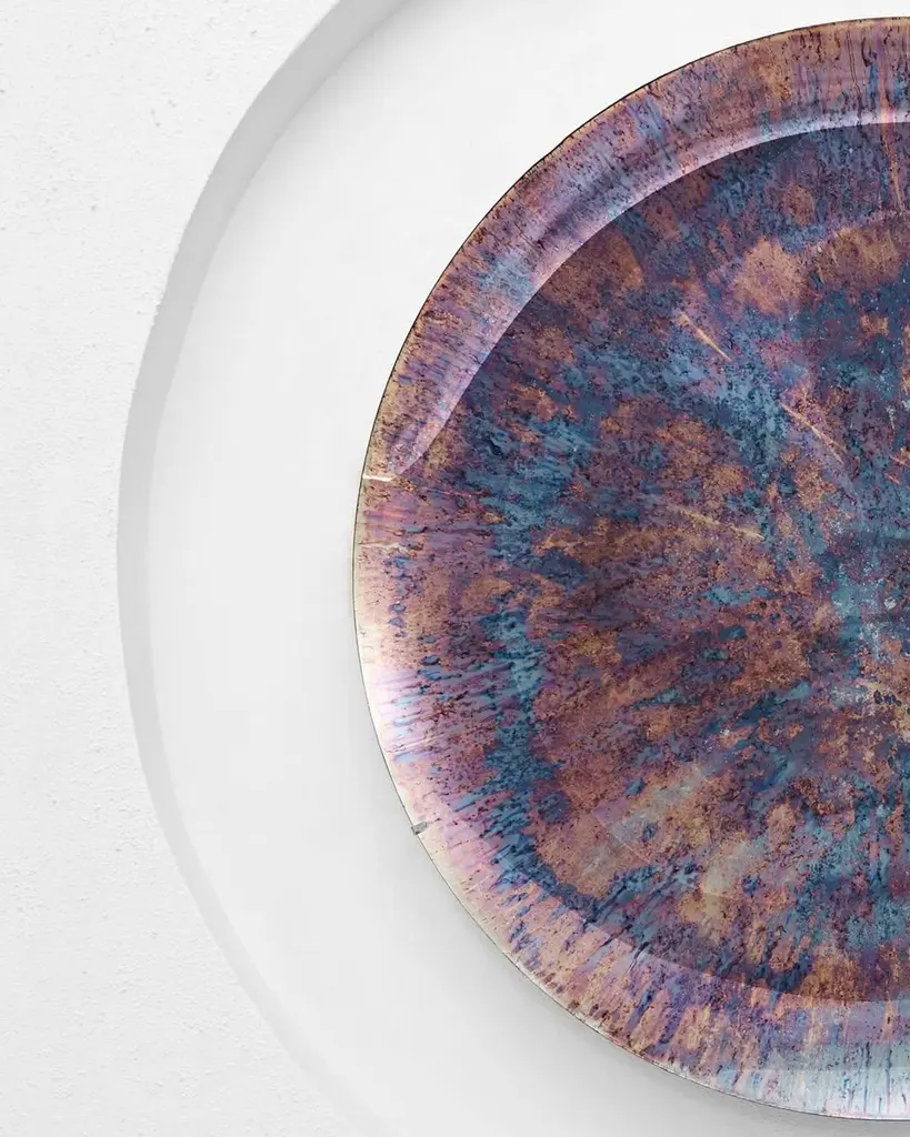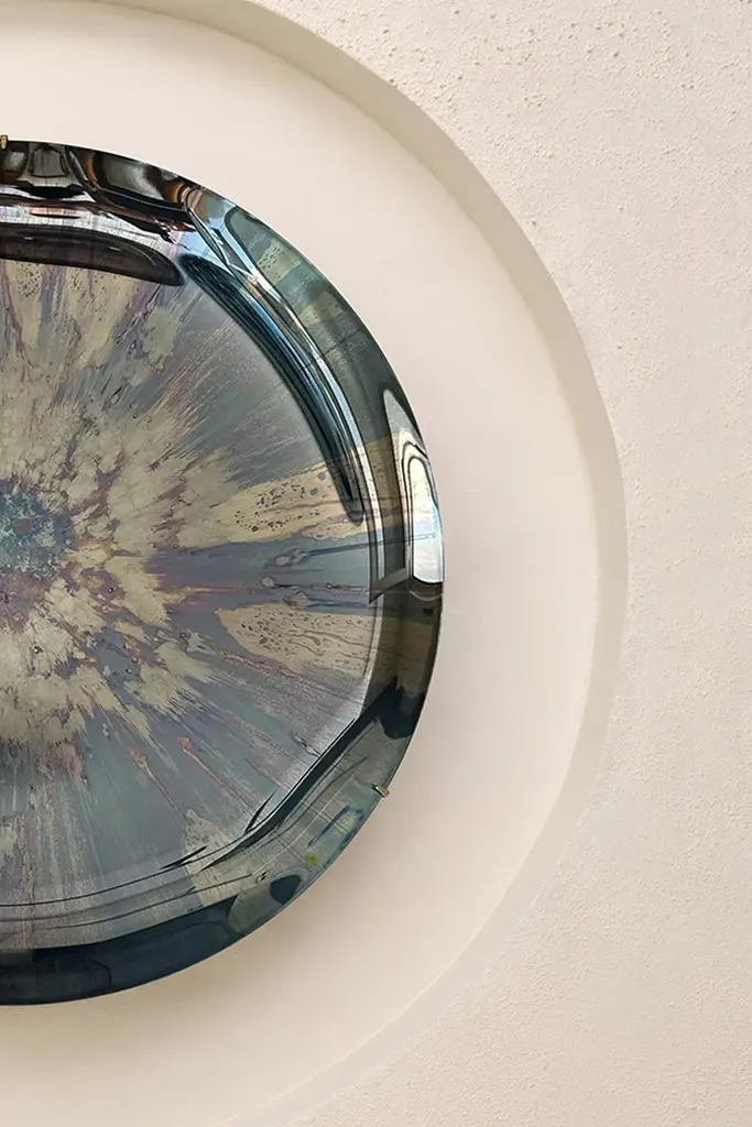 Limited Edition Blue Nebula Concave Multicolor Oxidized Mirror by HomaDimensions: D 97 x H 7 cmMaterials: Concave Oxidized Mirror, Hanger: Brass.HOMA is a contemporary design atelier based in Istanbul. The atelier’s trademark processes are handblown glass, glass fusing and mirroring, created through the use of multidisciplinary techniques and materials. Over time, with meticulous research and experimentation HOMA has acquired unique expertise in mirrors, lighting and home interior objects thus elevating things of function to the status of art. Handcraft HOMA has discovered one of the last remaining masters of handcrafted mirroring in the Eastern Mediterranean. The atelier is original in its simultaneous use of different techniques to create organic and flowing mirror shapes. Each piece celebrates reflection, translucency, movement, light, time, multiple layering and aesthetic, spontaneity…Object HOMA’s pieces are an exploration of organic, abstract, as well as unexpected flowing lines and shapes. Our design service offer is presented in a catalogue of over 50 designs in fluid and geometric shapes achieved through multidisciplinary techniques.Materiality Through the use of mixed textures and the layering of mirror elements unexpected effects are created on glass, which play with one’s visual perception as well as the surrounding space. Glass, stone, marble, messing mirror techniques, bronze, wood and clay are just some of the Earth’s materials that find their way into HOMA’S offerings. HOMA offers a vast materials library.Architecture Formally trained in interior architecture, HOMA founder, Tuğba Koç has transformed her knowledge and experience into layered aesthetic design objects. Now, with a team of architects and artisans, Tuğba applies her hands in a workshop environment on interior and exterior objects to enrich earth-derived, breathing, living materials. HOMA’s interior objects are informed by art and driven by the philosophy that nothing artificial should be allowed to interfere with the energy of one’s living environment.