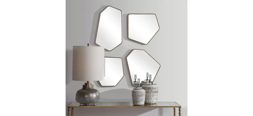 Scandinavian inspired mirrors are organically shaped with petite metal frames finished in aged gold. Sizes: S-14"x13", M1- 18"x14", M2- 15"x14", L-20"x12"