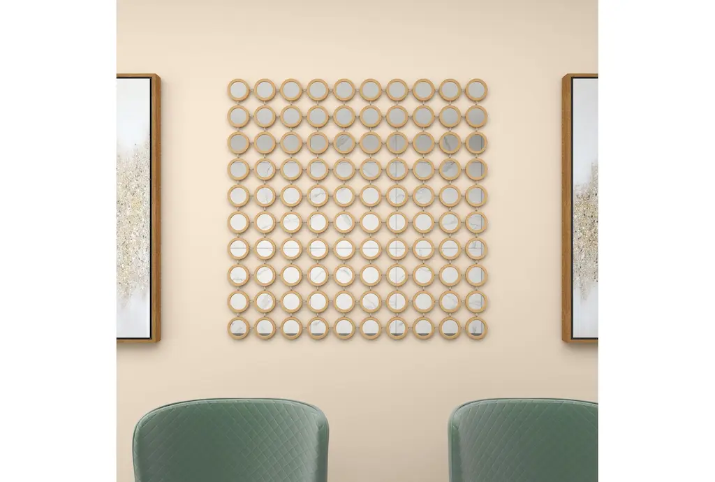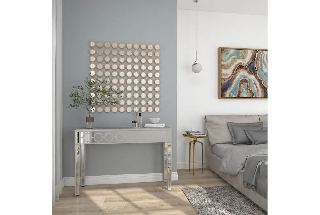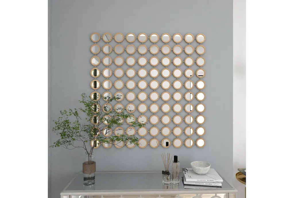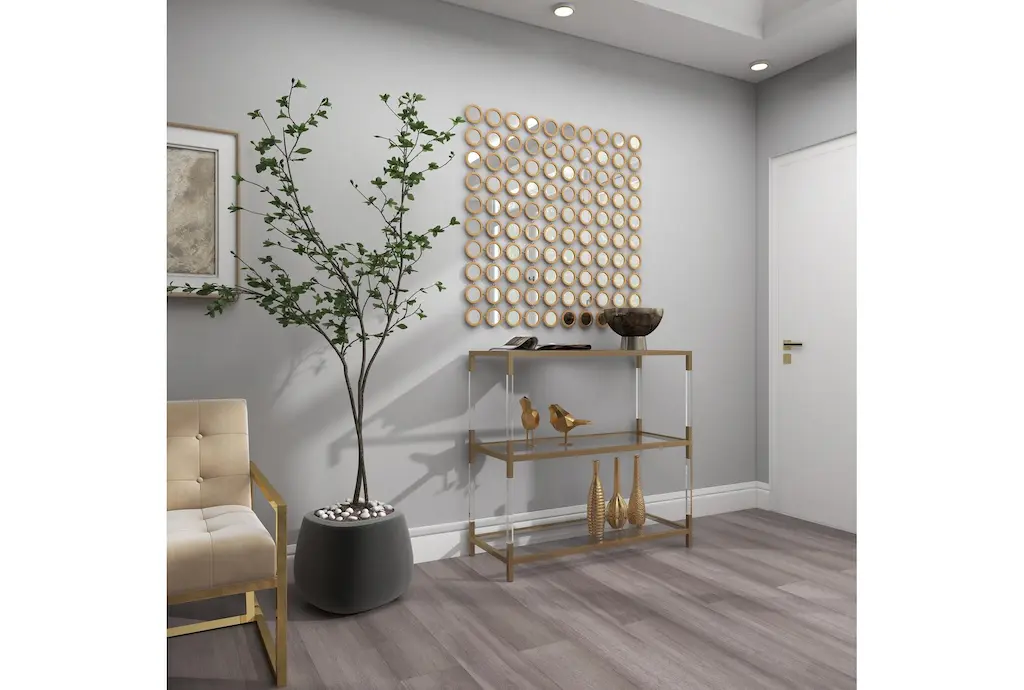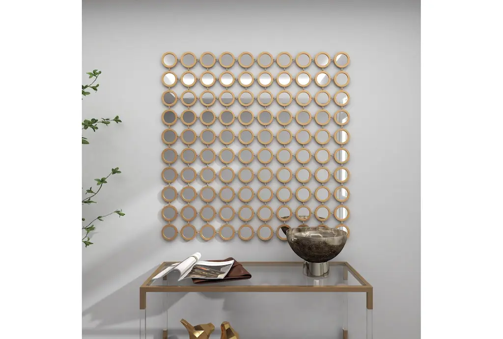 Apart from decorating your home, the purpose of this wall mirror is to bounce back outdoor light to a small room to make it look bigger. Pair this decorative wall mirror with house plants or other wall decor accent pieces to blend everything together perfectly. Make this chic and glamorous wall mirror a focal point in your home when hung on top of a console table in your entryway. This item ships in 1 carton. Can be hung vertically using the keyholes on the back; nails and screws not included. Suitable for indoor use only. This item ships fully assembled in one piece. This is a single gold colored entryway mirror. Glam style.