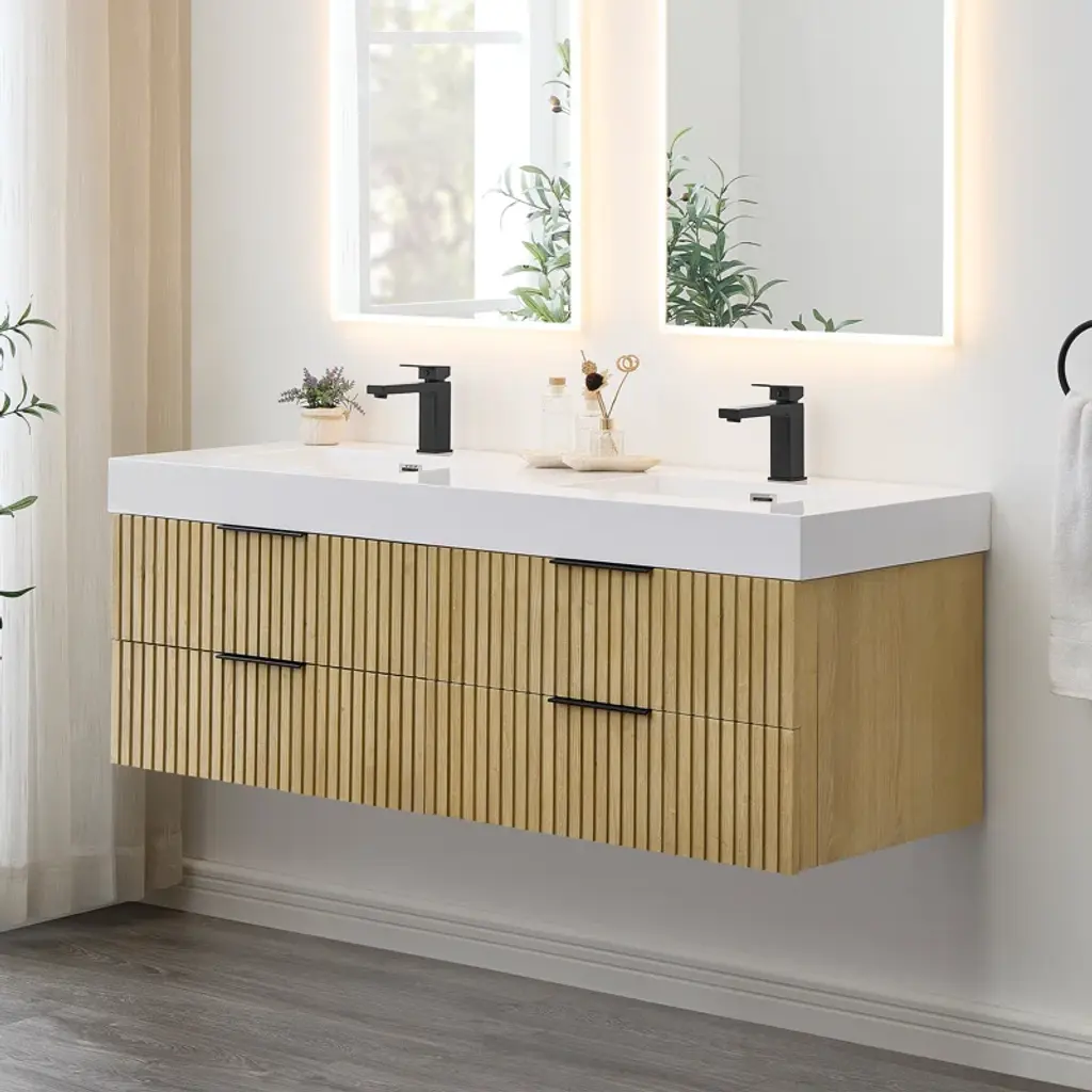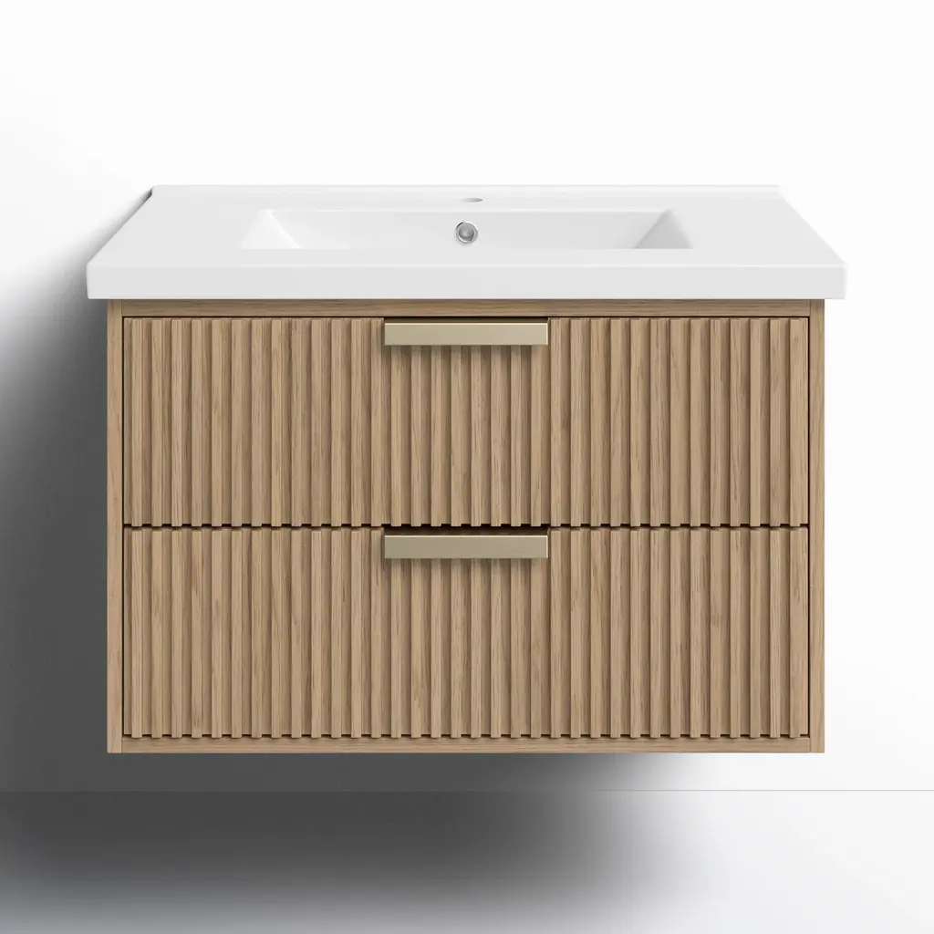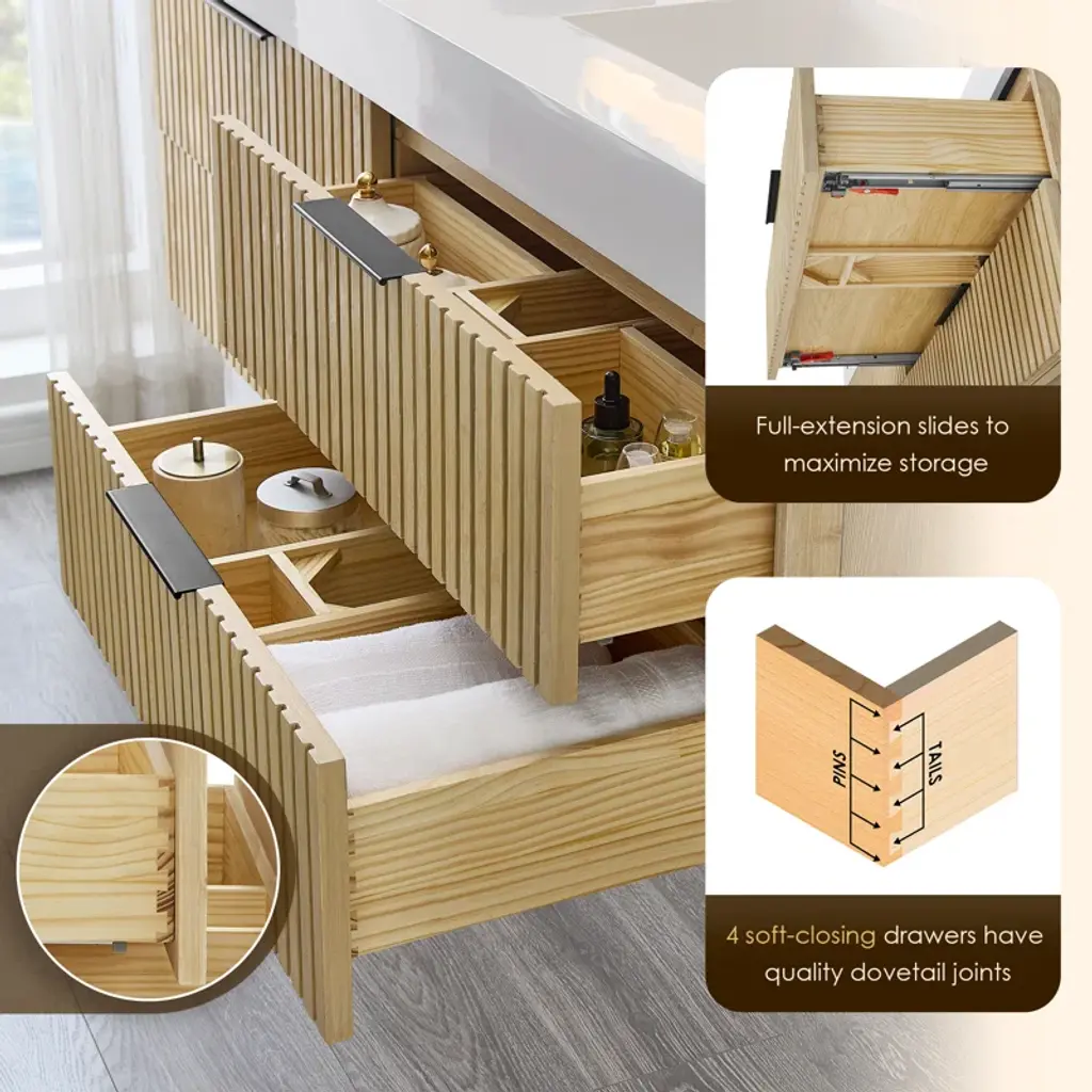 Textural and eye-catching, our Paytyn vanity features a Nature Brown Fir Wood finish that radiates a natural and warm ambiance. Vertical pieces of solid wood create a liner, clean, and minimalist pattern that integrates perfectly into the cabinet. Its fluted drawer fronts give this piece texture, depth, and character- perfect for a bathroom refresh. The wall-mounted design, built-in partitions, and built-in bridge drawers provide ample storage space for your bathroom essentials. The elegant white integrated artificial drop-in sink is aesthetically pleasing and easy to maintain, offering a convenient user experience.