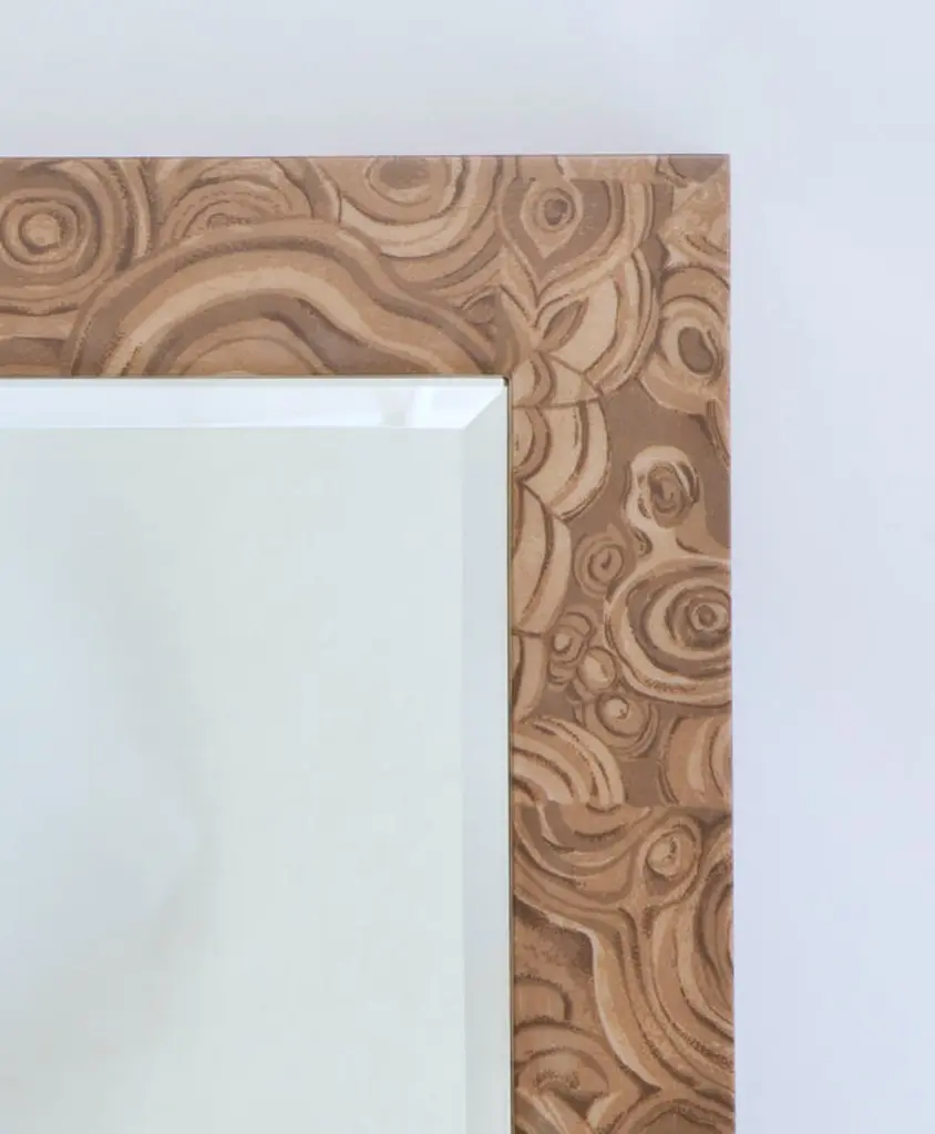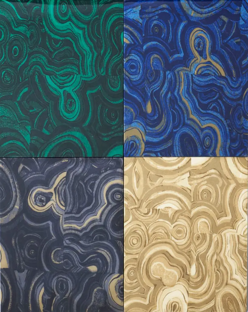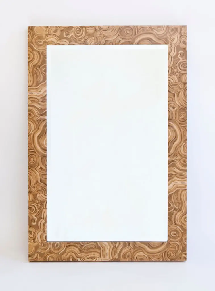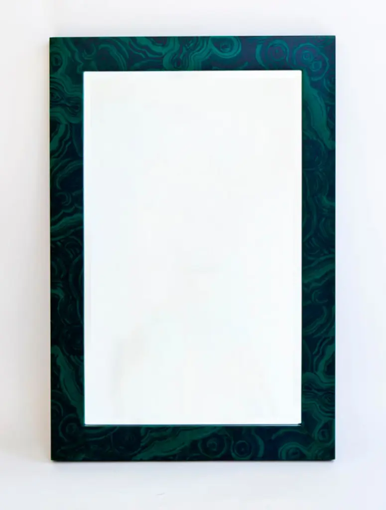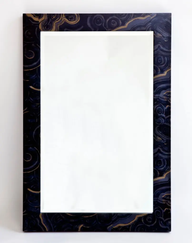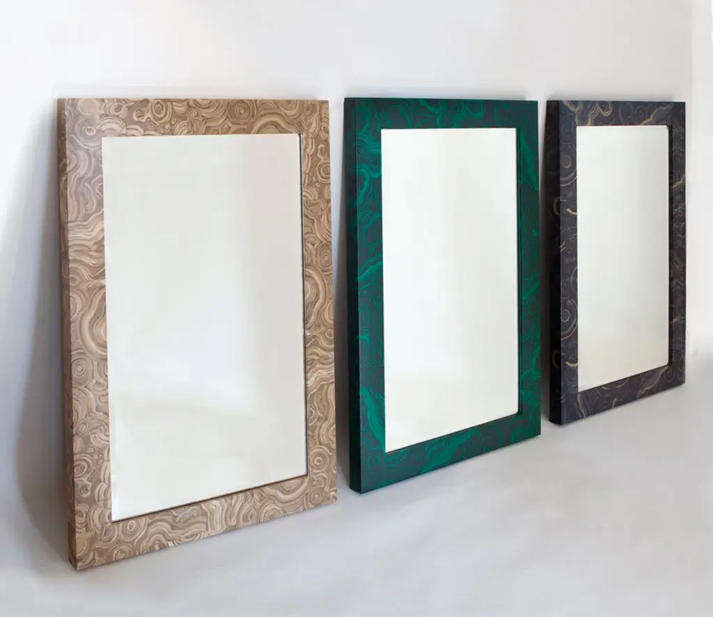 The Albert mirrorA fabric-wrapped frame withInset beveled glass mirror And satin lacquer finish.Available in malachite, travertine, onyx and lapis color ways.“The Albert mirror will add light and glamour to any room.” Liz O’Brien.