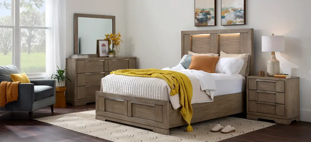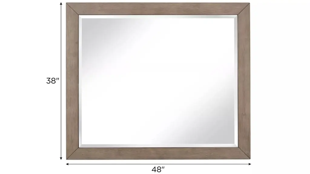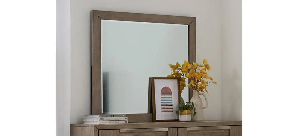 The sleek design of the Lorelai mirror reflects your contemporary good taste with a light sandstone finish and natural wood grain veneers. Beveled mirror glass adds dimension and character.