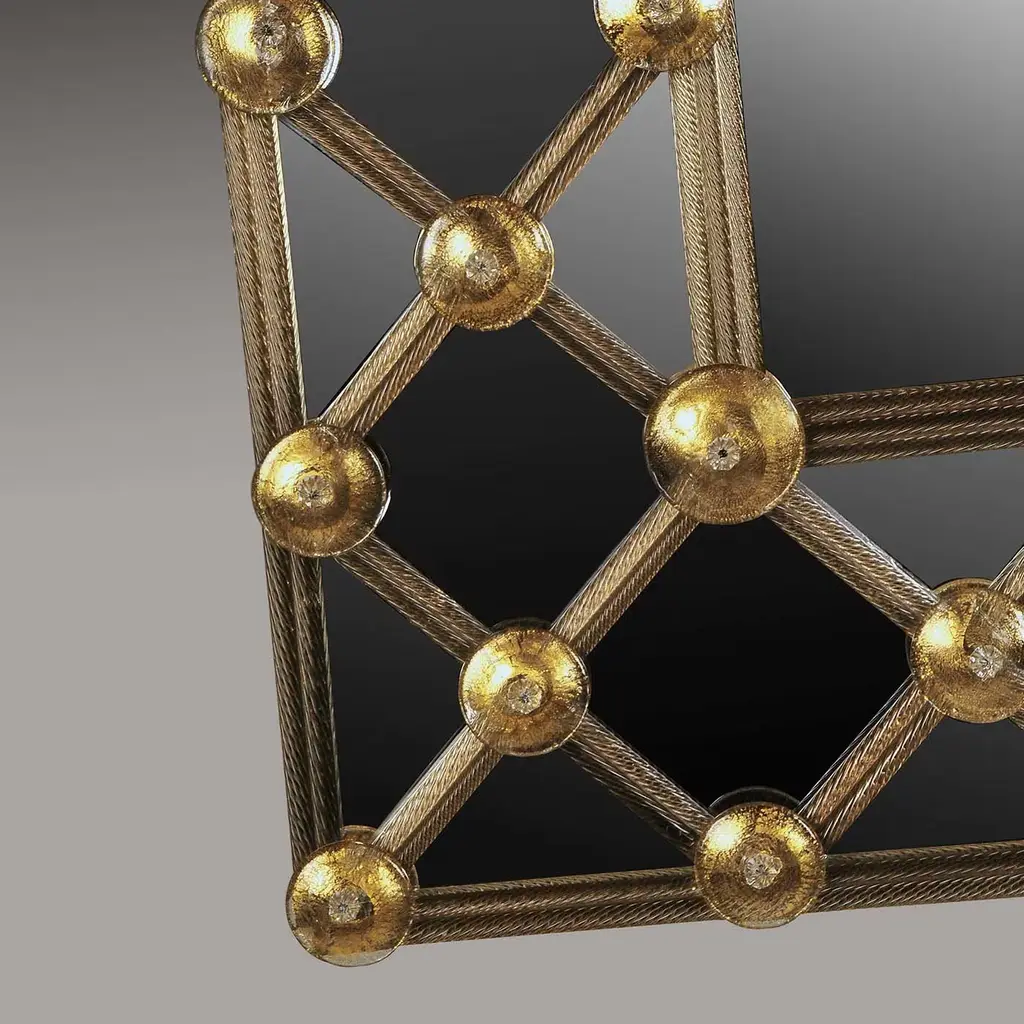 A superb interpretation of traditional craftsmanship with modern aesthetic, this striking mirror boasts a frame adorned with a series of diamond-shaped elements obtained by crossing mouth-blown Murano glass pieces in a stunning grid that resembles a shiny jewel. By mixing straight lines and round shapes, this decoration creates a textured accent to enliven a modern wall.