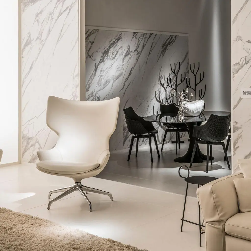 "Lou Speak" is an iconic armchair, designed by Philippe Starck and manufactured by Driade, featuring a swivel base made of cast aluminum in polished mirror finish and a shell in polyurethane foam with internal structure in steel rod, covered by removable fabric or fixed leather.Indoor use only. DIMENSIONS:D. 31.1", W. 32.6", H. 42.9", Seat H. 17.3" "Lou Speak" armchair is an addition to the Lou family. It’s now time to talk. In fact, this comfortable and cocooning swivel armchair has just shown up after "Lou Read", "Lou Think" and "Lou Eat".Philippe Starck said about "Lou Speak":"Sit on a Lou Speak and you're forced to raise the level of quality of your conversation. If you don’t, your armchair will be more elegant than you.” PHILIPPE STARCK is an internationally acclaimed French creator, designer and architect. His profound comprehension of contemporary mutations, his determination to change the world, his anticipatory concern for environmental implications, his love of ideas, his desire to defend the intelligence of usefulness and the usefulness of intelligence have accompanied one iconic creation after the other.From everyday products such as furniture and lemon squeezers to revolutionary mega-yachts, individual windmills, electric bikes or hotels and restaurants that aspire to be wondrous, stimulating and intensely vibrant places. This untiring and rebellious citizen of the world, who considers sharing his ethical and subversive vision of a fairer planet as a duty, creates unconventional places and objects whose purpose is to be “good” before being beautiful.Philippe Starck and his wife, Jasmine, mostly live on an airplane or in “middles of nowhere”.