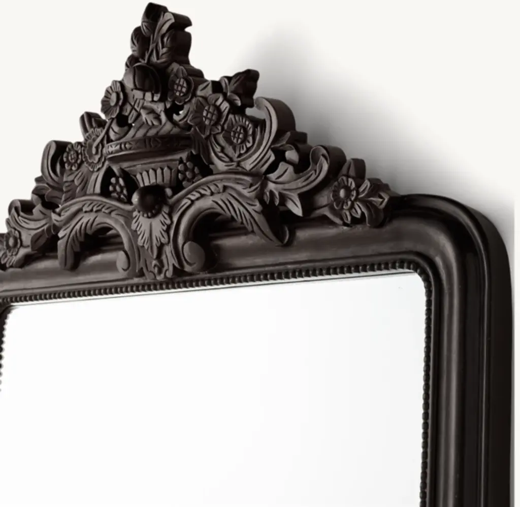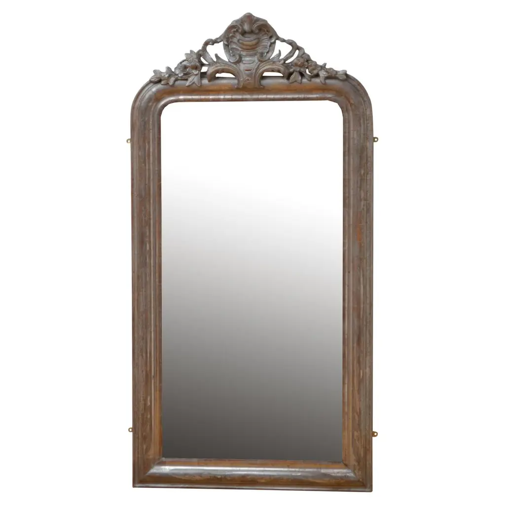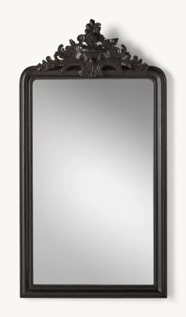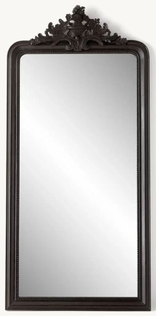 With a curved silhouette, delicate beadwork and scrolling acanthus leaves, our mirror's hand-carved frame reflects the elegance of mid-19th-century French design.