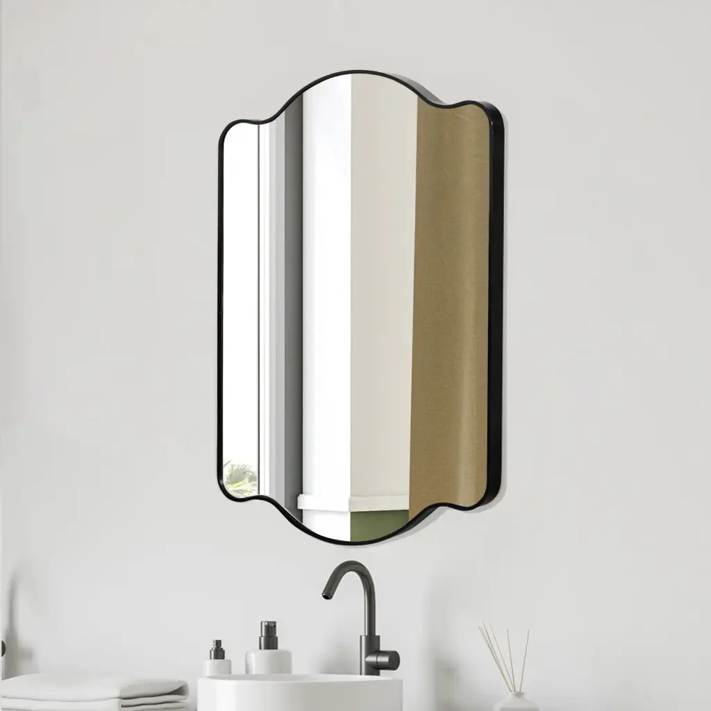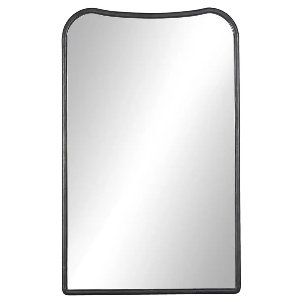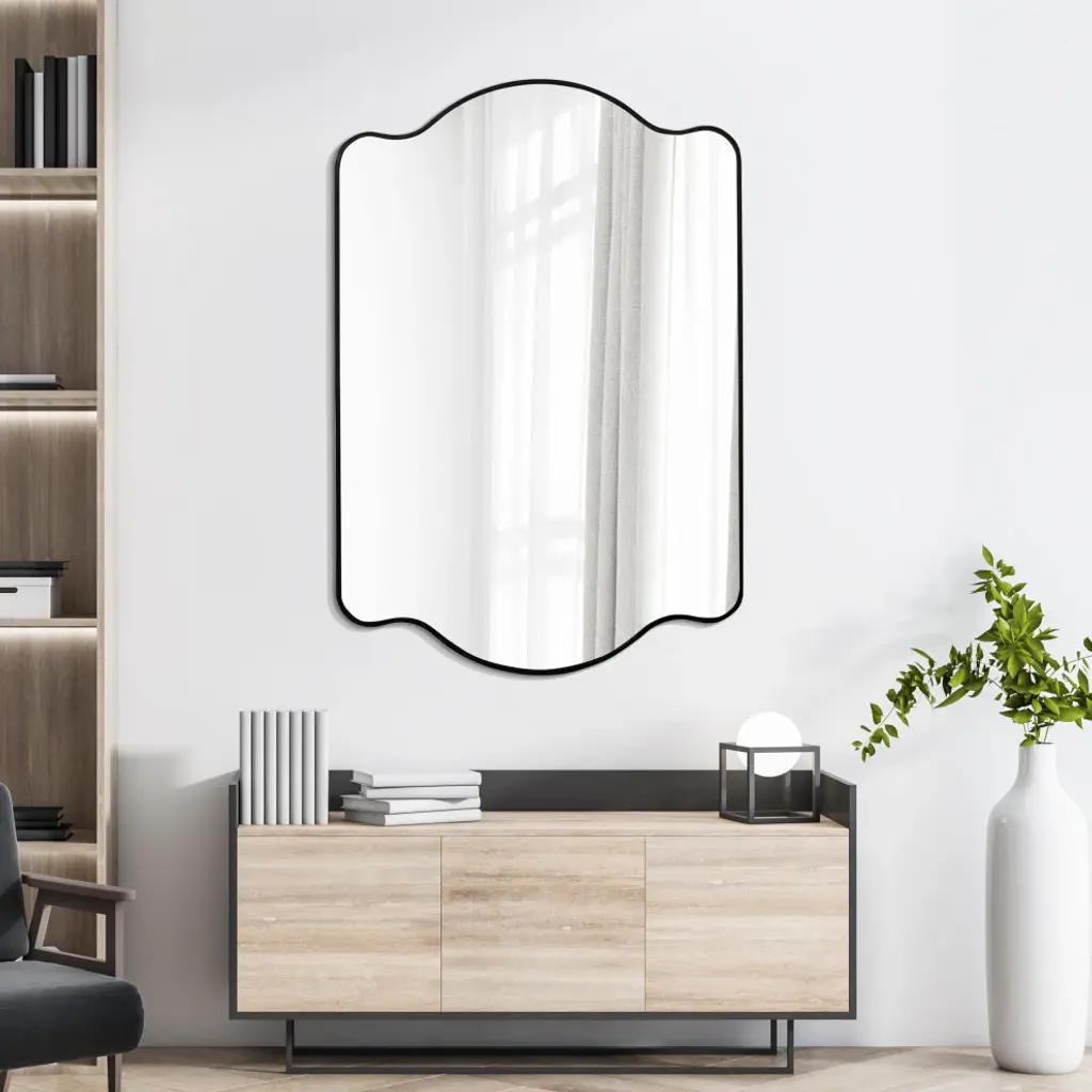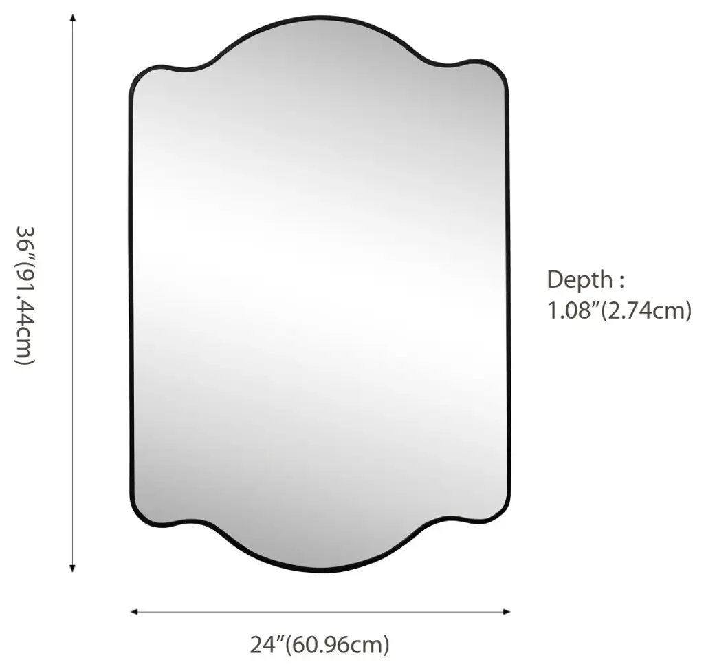 This modern wall mirror has a curved top and bottom to add an Art Deco vibe to any space. This versatile wall-hung design is strengthened by a narrow metal frame. Vertical or horizontal orientations are ideal for a bathroom vanity, bedroom or entry area.Features:• Mirrored glass has a minimalist black metal frame• Contemporary 24" wide design visually expands your space• Add a touch of glam to a bedroom, bathroom or living room with the sculptured curves of this versatile mirror• Mounting Options: Equipped with hooks for flexible hanging, suitable for both vertical and horizontal orientations• Hanging device: MDF backboard• with • Mirror Orientation: Both• Body Material: Metal• 36 inches high x 24 inches wide x 1.08 inches deepAbout us:You see an ordinary mirror.We see an enhancement to help with making your fashionable statement.A perfectly smooth-edged frame with LED lighting and uniform surface casts a flaring reflection of the subject and surroundings. Our vast mirror catalog includes a variety of designs, shapes and sizes.JONATHAN Y Lighting - a fashion revolution in home decor.