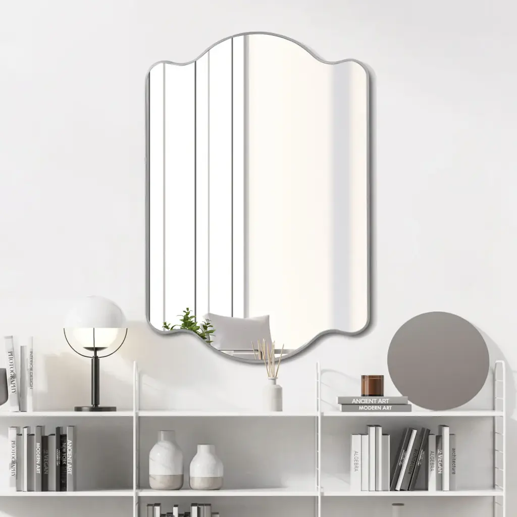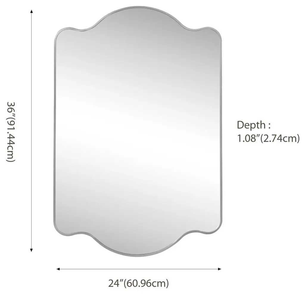This modern wall mirror has a curved top and bottom to add an Art Deco vibe to any space. This versatile wall-hung design is strengthened by a narrow metal frame. Vertical or horizontal orientations are ideal for a bathroom vanity, bedroom or entry area.Features:• Mirrored glass has a minimalist nickel metal frame• Contemporary 24" wide design visually expands your space• Add a touch of glam to a bedroom, bathroom or living room with the sculptured curves of this versatile mirror• Mounting Options: Equipped with hooks for flexible hanging, suitable for both vertical and horizontal orientations• Hanging device: MDF backboard• with • Mirror Orientation: Both• Body Material: Metal• 36 inches high x 24 inches wide x 1.08 inches deepAbout us:You see an ordinary mirror.We see an enhancement to help with making your fashionable statement.A perfectly smooth-edged frame with LED lighting and uniform surface casts a flaring reflection of the subject and surroundings. Our vast mirror catalog includes a variety of designs, shapes and sizes.JONATHAN Y Lighting - a fashion revolution in home decor.