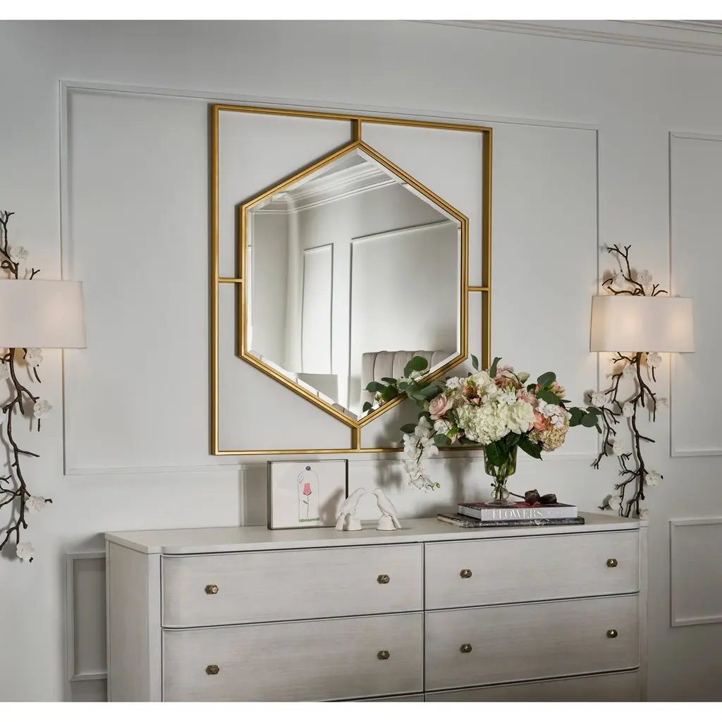 The mirror's beveled edges and the gold finish of the geometric frame will bring unadulterated glamour to any wall.