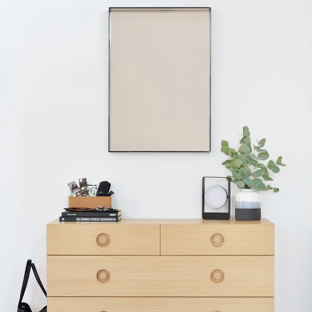 Add extra verve to an entryway, hall or bedroom with Matthew Hilton’s captivating wall mirror with a rectilinear smoked-glass frame. The ledge at the bottom of the piece also doubles as an ad-hoc shelf for displaying small objects or even personal care necessities in the designer’s sleekly minimal style.