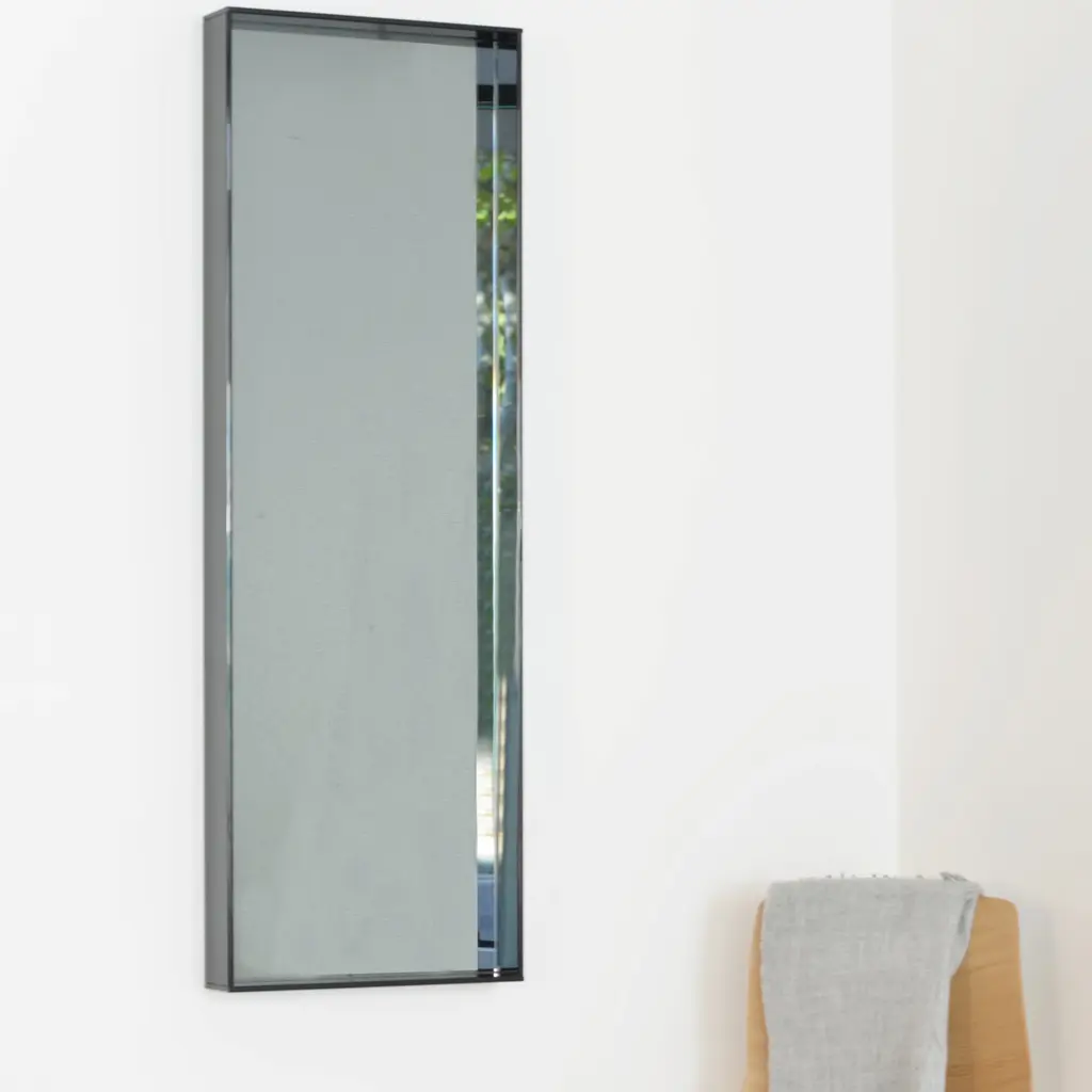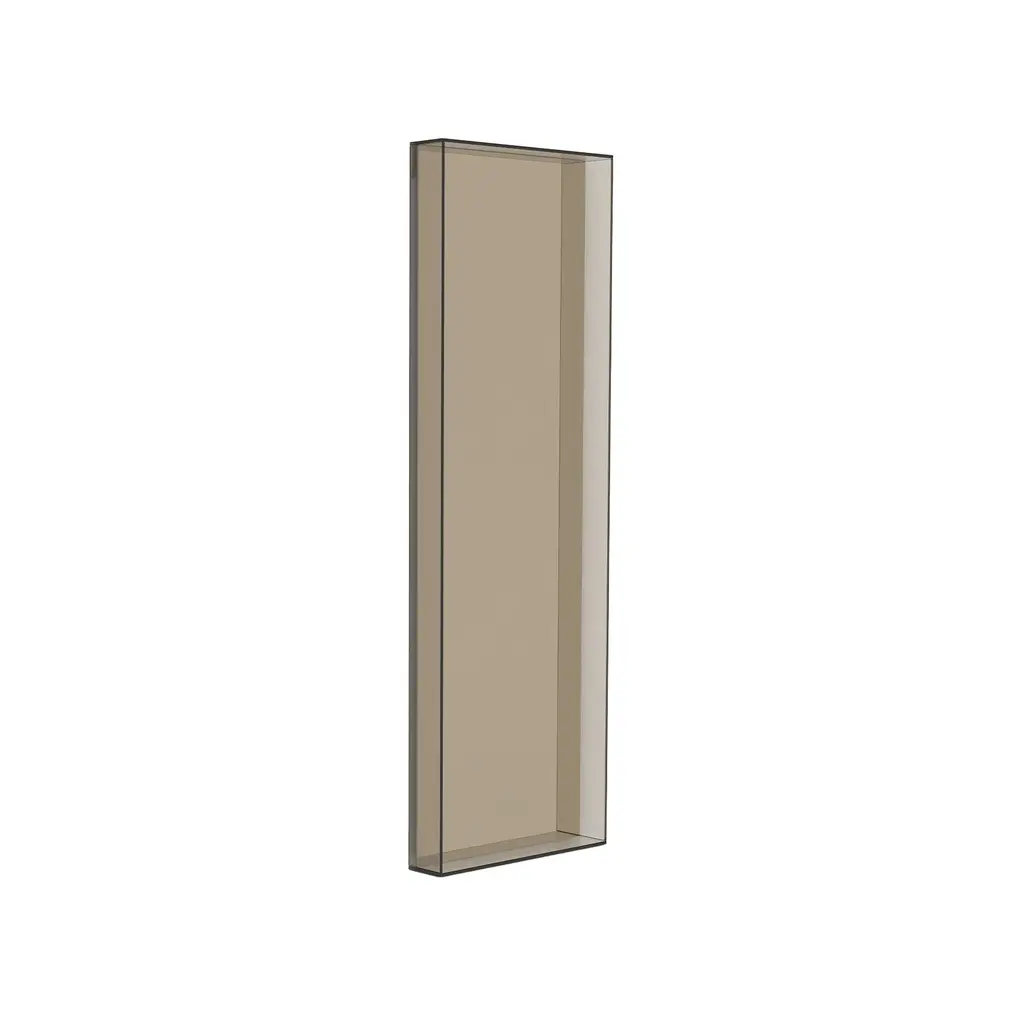 Constructed with a rectilinear smoked-glass frame, Lucent’s lofty tall version serves as a functional wall mirror while incorporating an integral display shelf for treasured objects. Of a piece with Matthew Hilton’s sleek and minimal aesthetic, the geometric form adds a spark to any setting in either bronze or smoke tones.