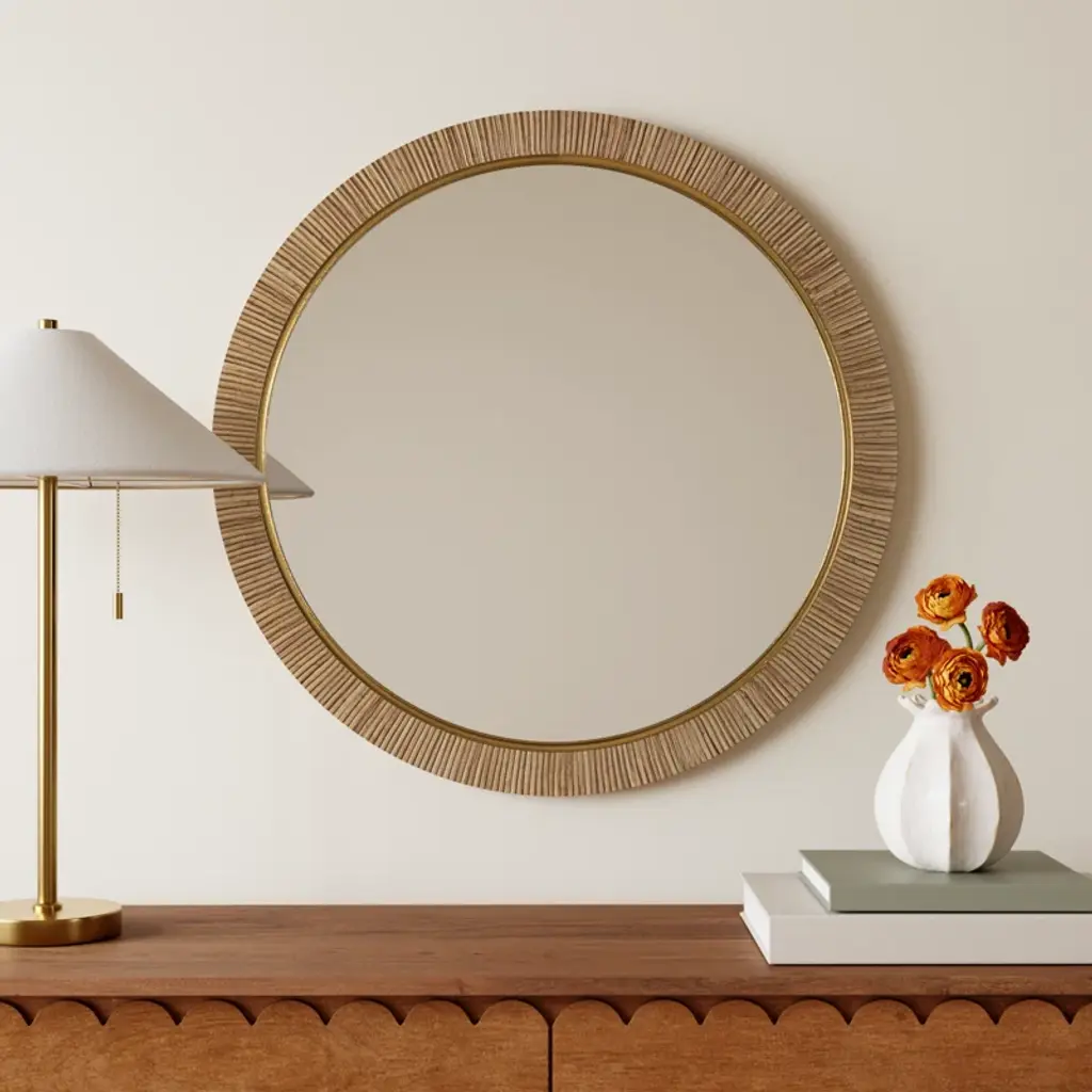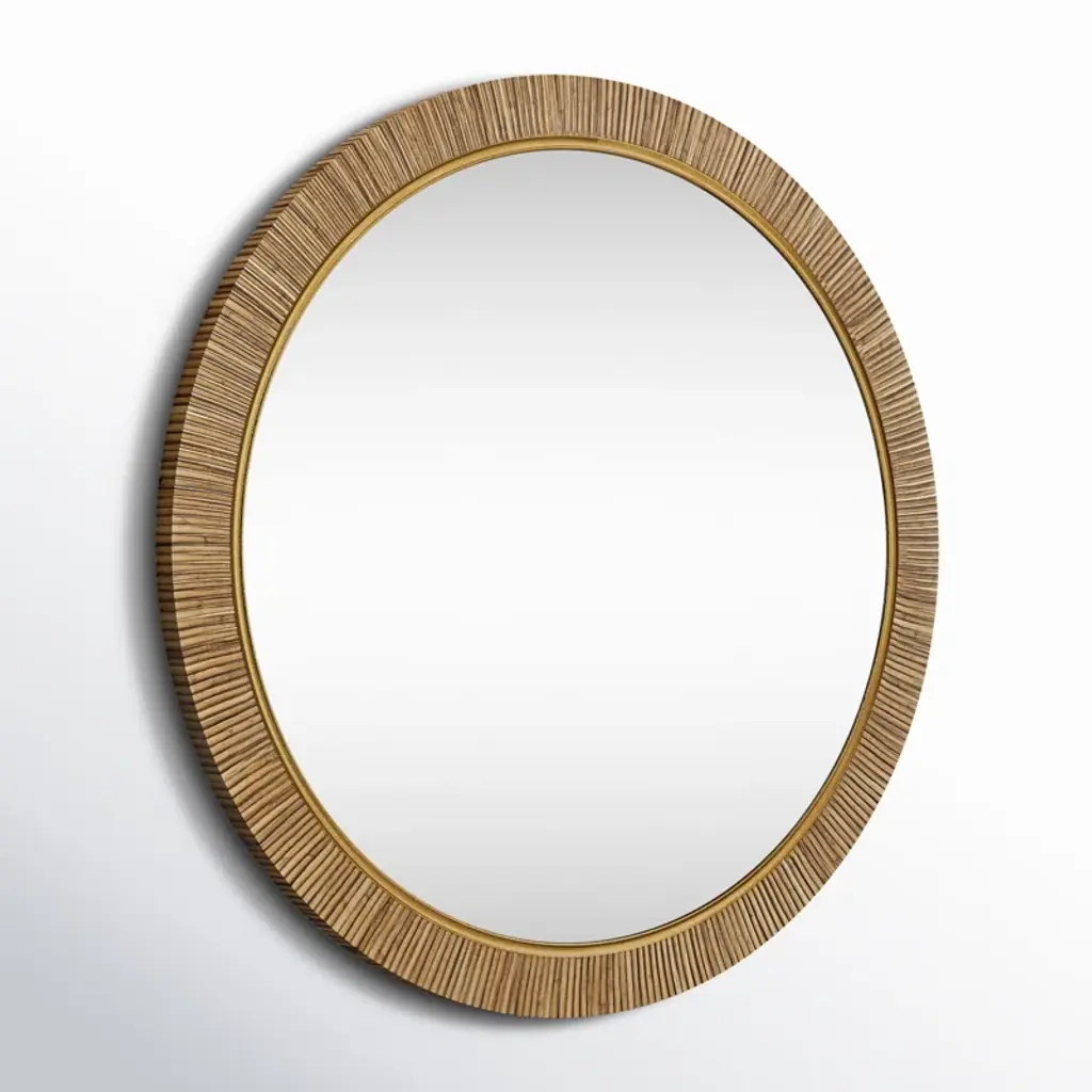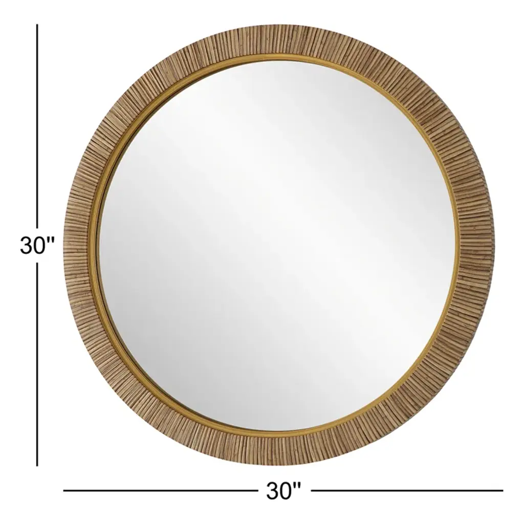 This beautiful 30" round mirror will put the finishing touch on your coastal decor. Designed to resemble real rattan, this frame is constructed with an authentic looking wrap that gives the look of real rattan, without the worries of moisture. A complementing gold liner surrounds the mirror. Enjoy the warmth and texture of this welcoming and relaxing design anywhere in the home.