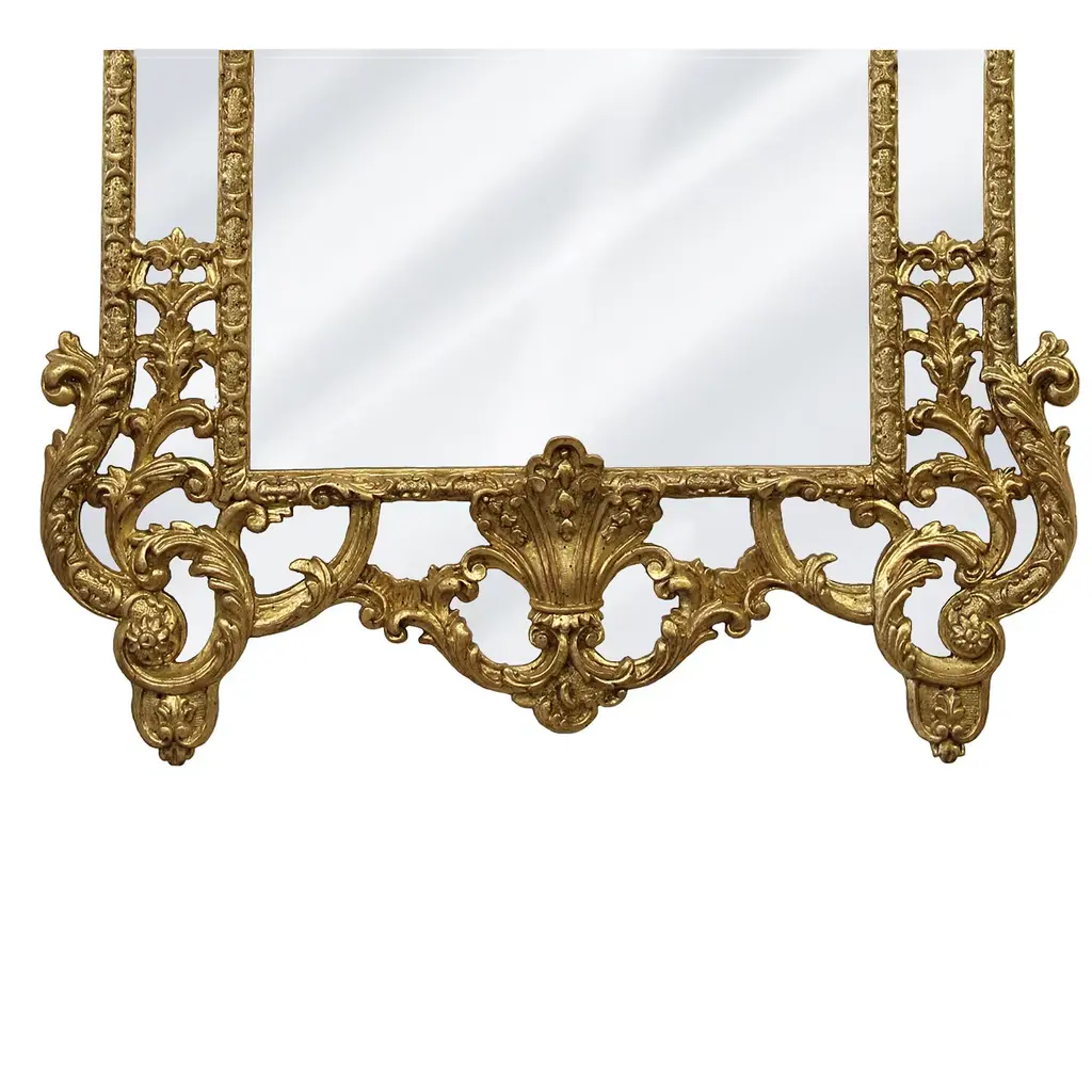This magnificent frame was hand carved on antique wood. Every step in the crafting of this piece was done with ancient techniques known since the 14th century, from the preparation to the 22k pure gold gild using only natural materials, to the finishing and the final aging patina added. Part of an exclusive collection of only two pieces, this framed mirror will create an arresting effect in any environment it is placed.