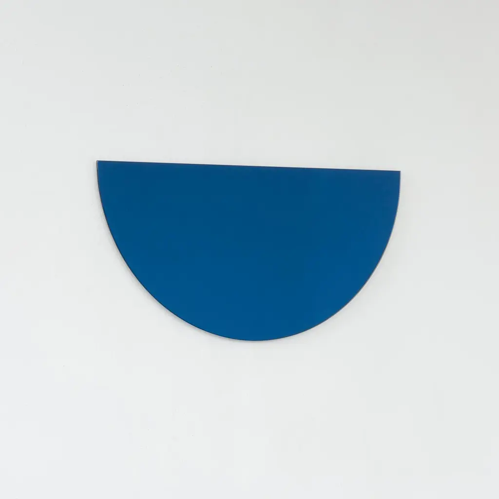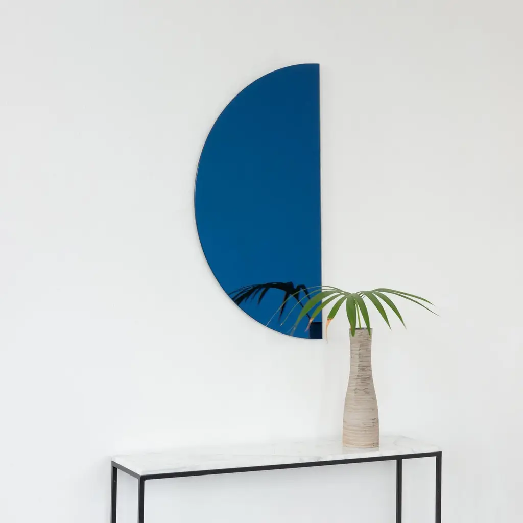 Minimalist half-moon Luna™ blue tinted frameless mirror with a floating effect. Fitted with a quality and ingenious hanging system for a flexible installation in 4 different directions. Designed and made in London, UK. Our mirrors are designed with an integrated French cleat (split batten) system that ensures the mirror is securely mounted flush with the wall. An alternative hanging hook or a Z-bar (depending on the size of the mirror) is available on demand for mirrors that need to be installed allowing some separation from the wall.Available in the following sizes (each piece):Regular: 50cm x 25cm / 19.7'' x 9.8''Medium: 60cm x 30cm / 23.6" x 11.8''Large: 80cm x 40cm / 31.5" x 15.7''Extra Large: 100cm x 50cm / 39.4" x 19.7''Mirror thickness: 6mm / 0.24" Overall mirror depth: 15mm / 0.59"or any bespoke dimensions.This mirror is fully customisable.Available options:- mirror tint: silver, bronze, black, rose gold / peach, blue or green- bevelling- back-illumination creating a halo effect- framed with various finishes: brass (brushed, polished or with a bronze patina), copper, stainless steel, blackened stainless steel, or in a variety of colours- frame depth: 18mm / 0.71’’, 24mm / 0.94’’ and 30mm / 1.18’’- front illumination for framed mirrors onlyPlease contact us for a quote for any bespoke specification or added options.All our mirrors are made on demand. Fabrication lead time for this particular mirror is approximately 3 weeks. Shipped safely and insured worldwide. Our mirrors are always shipped by courier express. Shipping via courier express typically requires 1 to 2 days to the UK, or 2 to 7 days outside the UK depending on the destination.All 4 directions the mirror may be installed in are illustrated in the photographs in this mirror entry. This mirror cannot be hung diagonally.ORDERS OF MULTIPLE MIRRORS OF THE SAME TYPE: Please contact us to receive a Packing and Shipping quote when ordering multiple mirrors of the same type. An order for multiple mirrors of the same type may not be accepted without extra packing and shipping fees. Thank you.