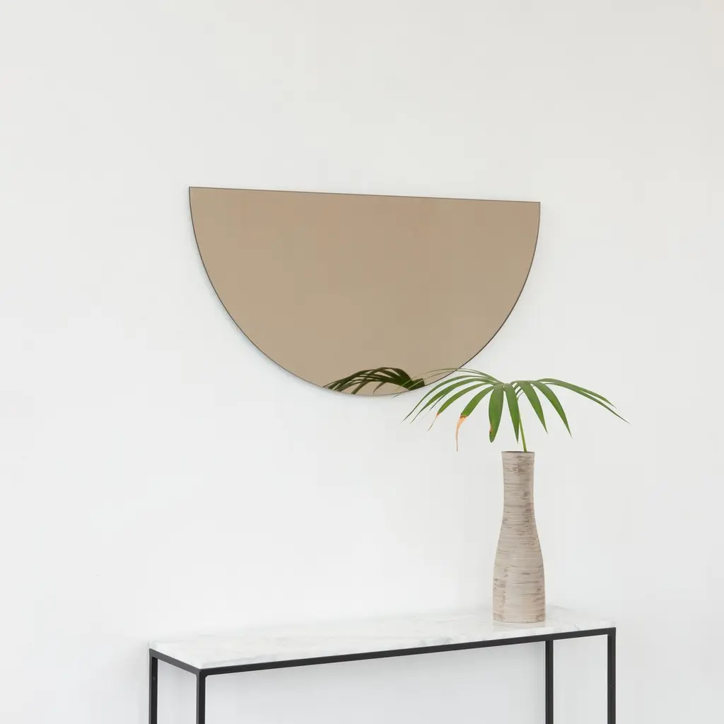 Minimalist half-moon Luna™ bronze tinted frameless mirror with a floating effect. Fitted with a quality and ingenious hanging system for a flexible installation in 4 different directions. Designed and made in London, UK. Our mirrors are designed with an integrated French cleat (split batten) system that ensures the mirror is securely mounted flush with the wall. An alternative hanging hook or a Z-bar (depending on the size of the mirror) is available on demand for mirrors that need to be installed allowing some separation from the wall.Available in the following sizes (each piece):Regular: 50cm x 25cm / 19.7'' x 9.8''Medium: 60cm x 30cm / 23.6" x 11.8''Large: 80cm x 40cm / 31.5" x 15.7''Extra Large: 100cm x 50cm / 39.4" x 19.7''Mirror thickness: 6mm / 0.24" Overall mirror depth: 15mm / 0.59"or any bespoke dimensions.This mirror is fully customisable.Available options:- mirror tint: silver, bronze, black, rose gold / peach, blue or green- bevelling- back-illumination creating a halo effect- framed with various finishes: brass (brushed, polished or with a bronze patina), copper, stainless steel, blackened stainless steel, or in a variety of colours- frame depth: 18mm / 0.71’’, 24mm / 0.94’’ and 30mm / 1.18’’- front illumination for framed mirrors onlyPlease contact us for a quote for any bespoke specification or added options.All our mirrors are made on demand. Fabrication lead time for this particular mirror is approximately 3 weeks. Shipped safely and insured worldwide. Our mirrors are always shipped by courier express. Shipping via courier express typically requires 1 to 2 days to the UK, or 2 to 7 days outside the UK depending on the destination.All 4 directions the mirror may be installed in are illustrated in the photographs in this mirror entry. This mirror cannot be hung diagonally.ORDERS OF MULTIPLE MIRRORS OF THE SAME TYPE: Please contact us to receive a Packing and Shipping quote when ordering multiple mirrors of the same type. An order for multiple mirrors of the same type may not be accepted without extra packing and shipping fees. Thank you.