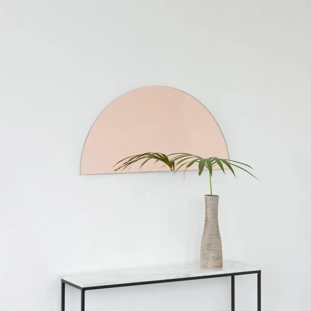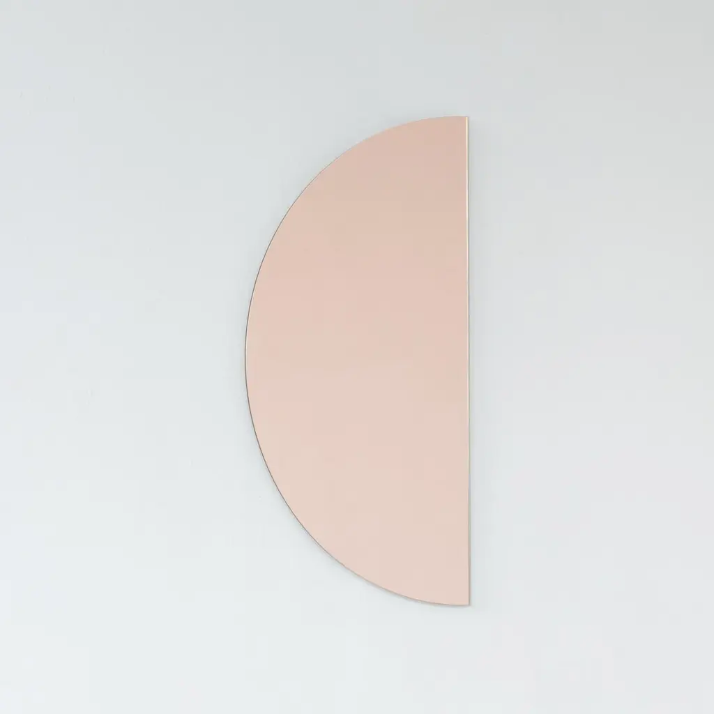 Minimalist half-moon rose gold (peach) tinted frameless mirror with a floating effect. Fitted with a quality hanging system for a flexible installation in 4 different directions. Designed and made in London, UK. Our mirrors are designed with an integrated French cleat (split batten) system that ensures the mirror is securely mounted flush with the wall. An alternative hanging hook or a Z-bar (depending on the size of the mirror) is available on demand for mirrors that need to be installed allowing some separation from the wall.Available in the following sizes (each piece):Regular: 50cm x 25cm / 19.7'' x 9.8''Medium: 60cm x 30cm / 23.6" x 11.8''Large: 80cm x 40cm / 31.5" x 15.7''Extra Large: 100cm x 50cm / 39.4" x 19.7''Mirror thickness: 6mm / 0.24" Overall mirror depth: 15mm / 0.59"or any bespoke dimensions.This mirror is fully customisable.Available options:- mirror tint: silver, bronze, black, rose gold / peach, blue or green- bevelling- back-illumination creating a halo effect- framed with various finishes: brass (brushed, polished or with a bronze patina), copper, stainless steel, blackened stainless steel, or in a variety of colours- frame depth: 18mm / 0.71’’, 24mm / 0.94’’ and 30mm / 1.18’’- front illumination for framed mirrors onlyPlease contact us for a quote for any bespoke specification or added options.All our mirrors are made on demand. Fabrication lead time for this particular mirror is approximately 3 weeks. Shipped safely and insured worldwide. Our mirrors are always shipped by courier express. Shipping via courier express typically requires 1 to 2 days to the UK, or 2 to 7 days outside the UK depending on the destination.All 4 directions the mirror may be installed in are illustrated in the photographs in this mirror entry. This mirror cannot be hung diagonally.Please contact us for a quote for any bespoke specification or added options.ORDERS OF MULTIPLE MIRRORS OF THE SAME TYPE: Please contact us to receive a Packing and Shipping quote when ordering multiple mirrors of the same type. An order for multiple mirrors of the same type may not be accepted without extra packing and shipping fees. Thank you.