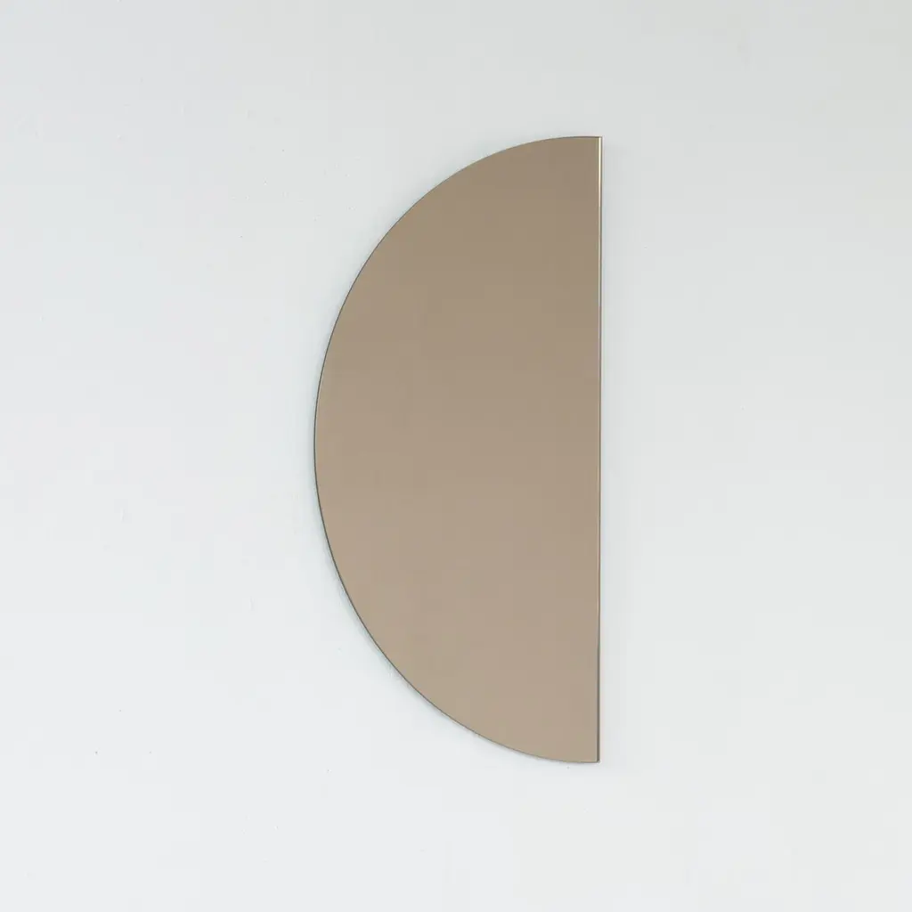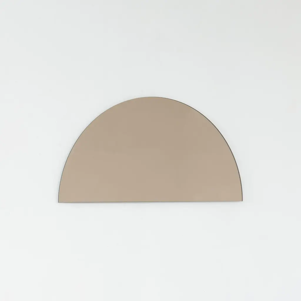 Minimalist half-moon Luna™ bronze tinted frameless mirror with a floating effect. Fitted with a quality hanging system for a flexible installation in 4 different positions. Designed and made in London, UK. Our mirrors are designed with an integrated French cleat (split batten) system that ensures the mirror is securely mounted flush with the wall. An alternative hanging hook or a Z-bar (depending on the size of the mirror) is available on demand for mirrors that need to be installed allowing some separation from the wall.Available in the following sizes (each piece):Regular: 50cm x 25cm / 19.7'' x 9.8''Medium: 60cm x 30cm / 23.6" x 11.8''Large: 80cm x 40cm / 31.5" x 15.7''Extra Large: 100cm x 50cm / 39.4" x 19.7''Mirror thickness: 6mm / 0.24" Overall mirror depth: 15mm / 0.59"or any bespoke dimensions.This mirror is fully customisable.Available options:- mirror tint: silver, bronze, black, rose gold / peach, blue or green- bevelling- back-illumination creating a halo effect- framed with various finishes: brass (brushed, polished or with a bronze patina), copper, stainless steel, blackened stainless steel, or in a variety of colours- frame depth: 18mm / 0.71’’, 24mm / 0.94’’ and 30mm / 1.18’’- front illumination for framed mirrors onlyPlease contact us for a quote for any bespoke specification or added options.All our mirrors are made on demand. Fabrication lead time for this particular mirror is approximately 3 weeks. Shipped safely and insured worldwide. Our mirrors are always shipped by courier express. Shipping via courier express typically requires 1 to 2 days to the UK, or 2 to 7 days outside the UK depending on the destination.All 4 directions the mirror may be installed in are illustrated in the photographs in this mirror entry. This mirror cannot be hung diagonally.ORDERS OF MULTIPLE MIRRORS OF THE SAME TYPE: Please contact us to receive a Packing and Shipping quote when ordering multiple mirrors of the same type. An order for multiple mirrors of the same type may not be accepted without extra packing and shipping fees. Thank you.