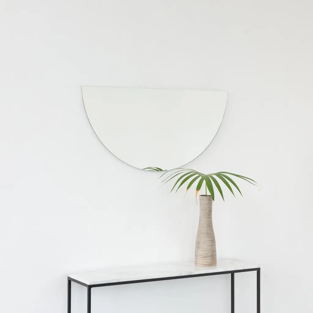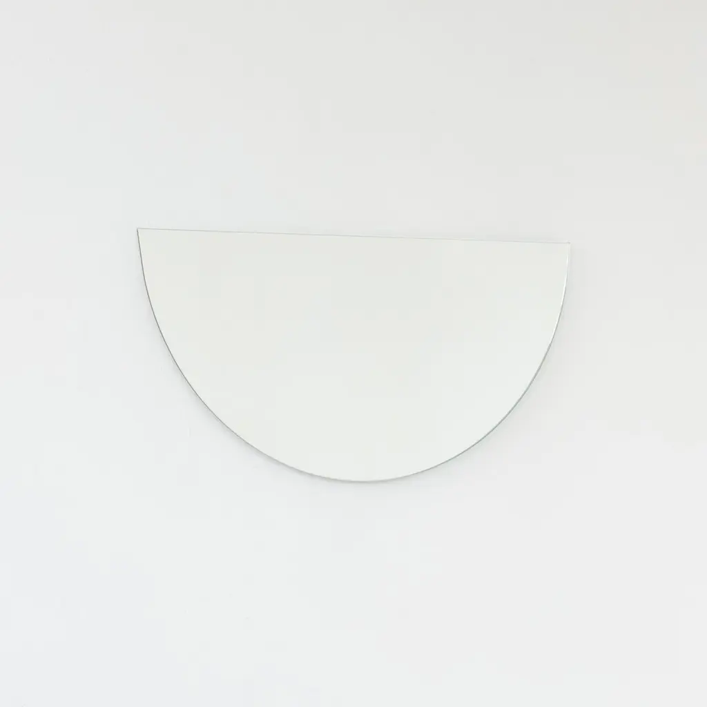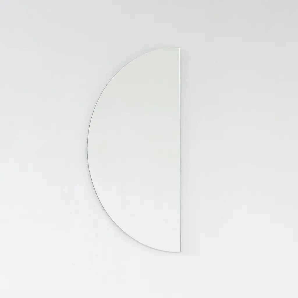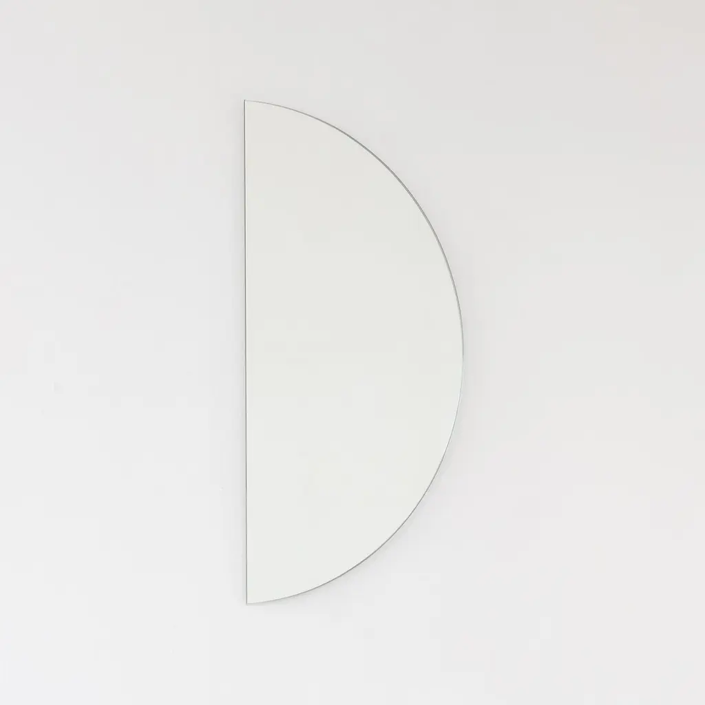Minimalist Luna™ half-moon frameless mirror with a floating effect. Fitted with a quality hanging system for a flexible installation in 4 different directions. Designed and made in London, UK.Our mirrors are designed with an integrated French cleat (split batten) system that ensures the mirror is securely mounted flush with the wall. An alternative hanging hook or a Z-bar (depending on the size of the mirror) is available on demand for mirrors that need to be installed allowing some separation from the wall.Available in the following sizes (each piece):Regular: 50cm x 25cm / 19.7'' x 9.8''Medium: 60cm x 30cm / 23.6" x 11.8''Large: 80cm x 40cm / 31.5" x 15.7''Extra Large: 100cm x 50cm / 39.4" x 19.7''Mirror thickness: 6mm / 0.24" Overall mirror depth: 15mm / 0.59"or any bespoke dimensions.This mirror is fully customisable.Available options:- mirror tint: silver, bronze, black, rose gold / peach, blue or green- bevelling- back-illumination creating a halo effect- framed with various finishes: brass (brushed, polished or with a bronze patina), copper, stainless steel, blackened stainless steel, or in a variety of colours- frame depth: 18mm / 0.71’’, 24mm / 0.94’’ and 30mm / 1.18’’- front illumination for framed mirrors onlyPlease contact us for a quote for any bespoke specification or added options.All our mirrors are made on demand. Fabrication lead time for this particular mirror is approximately 3 weeks. Shipped safely and insured worldwide. Our mirrors are always shipped by courier express. Shipping via courier express typically requires 1 to 2 days to the UK, or 2 to 7 days outside the UK depending on the destination.All 4 directions the mirror may be installed in are illustrated in the photographs in this mirror entry. This mirror cannot be hung diagonally.ORDERS OF MULTIPLE MIRRORS OF THE SAME TYPE: Please contact us to receive a Packing and Shipping quote when ordering multiple mirrors of the same type. An order for multiple mirrors of the same type may not be accepted without extra packing and shipping fees. Thank you.