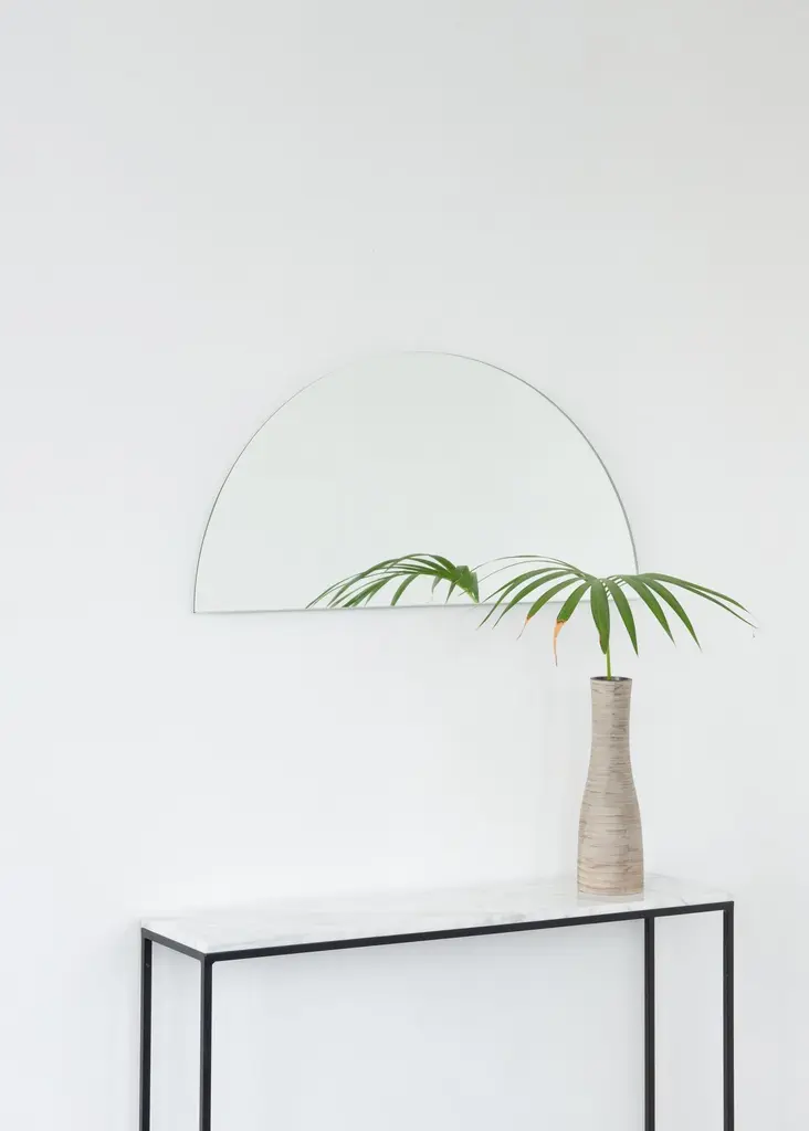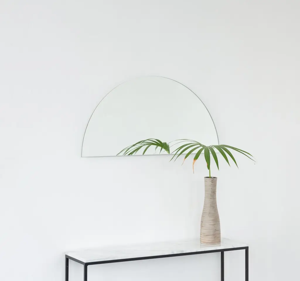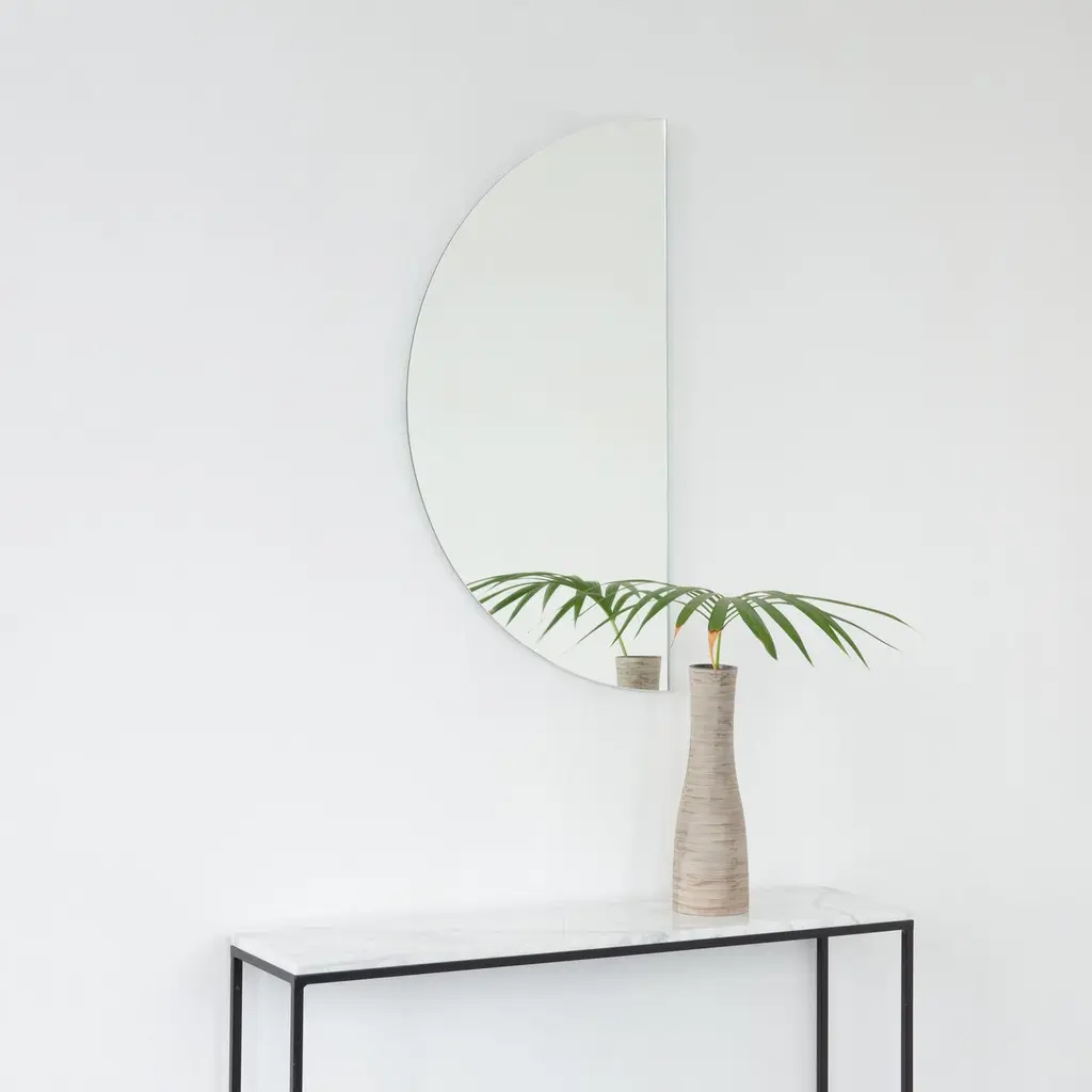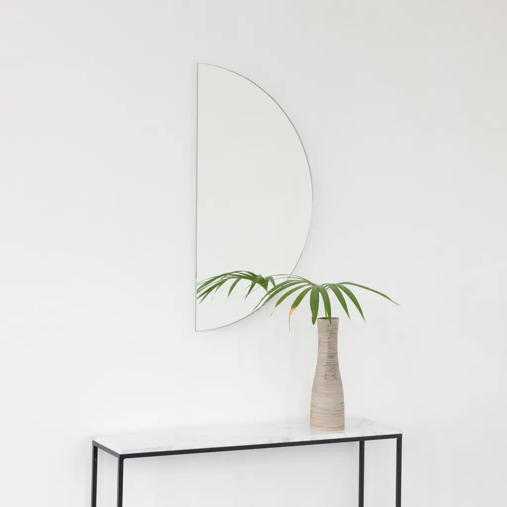Minimalist Luna™ half-moon frameless mirror with a floating effect. Fitted with a quality hanging system for a flexible installation in 4 different directions. Designed and made in London, UK.Our mirrors are designed with an integrated French cleat (split batten) system that ensures the mirror is securely mounted flush with the wall. An alternative hanging hook or a Z-bar (depending on the size of the mirror) is available on demand for mirrors that need to be installed allowing some separation from the wall.Available in the following sizes (each piece):Regular: 50cm x 25cm / 19.7'' x 9.8''Medium: 60cm x 30cm / 23.6" x 11.8''Large: 80cm x 40cm / 31.5" x 15.7''Extra Large: 100cm x 50cm / 39.4" x 19.7''Mirror thickness: 6mm / 0.24" Overall mirror depth: 15mm / 0.59"or any bespoke dimensions.This mirror is fully customisable.Available options:- mirror tint: silver, bronze, black, rose gold / peach, blue or green- bevelling- back-illumination creating a halo effect- framed with various finishes: brass (brushed, polished or with a bronze patina), copper, stainless steel, blackened stainless steel, or in a variety of colours- frame depth: 18mm / 0.71’’, 24mm / 0.94’’ and 30mm / 1.18’’- front illumination for framed mirrors onlyPlease contact us for a quote for any bespoke specification or added options.All our mirrors are made on demand. Fabrication lead time for this particular mirror is approximately 3 weeks. Shipped safely and insured worldwide. Our mirrors are always shipped by courier express. Shipping via courier express typically requires 1 to 2 days to the UK, or 2 to 7 days outside the UK depending on the destination.All 4 directions the mirror may be installed in are illustrated in the photographs in this mirror entry. This mirror cannot be hung diagonally.ORDERS OF MULTIPLE MIRRORS OF THE SAME TYPE: Please contact us to receive a Packing and Shipping quote when ordering multiple mirrors of the same type. An order for multiple mirrors of the same type may not be accepted without extra packing and shipping fees. Thank you.